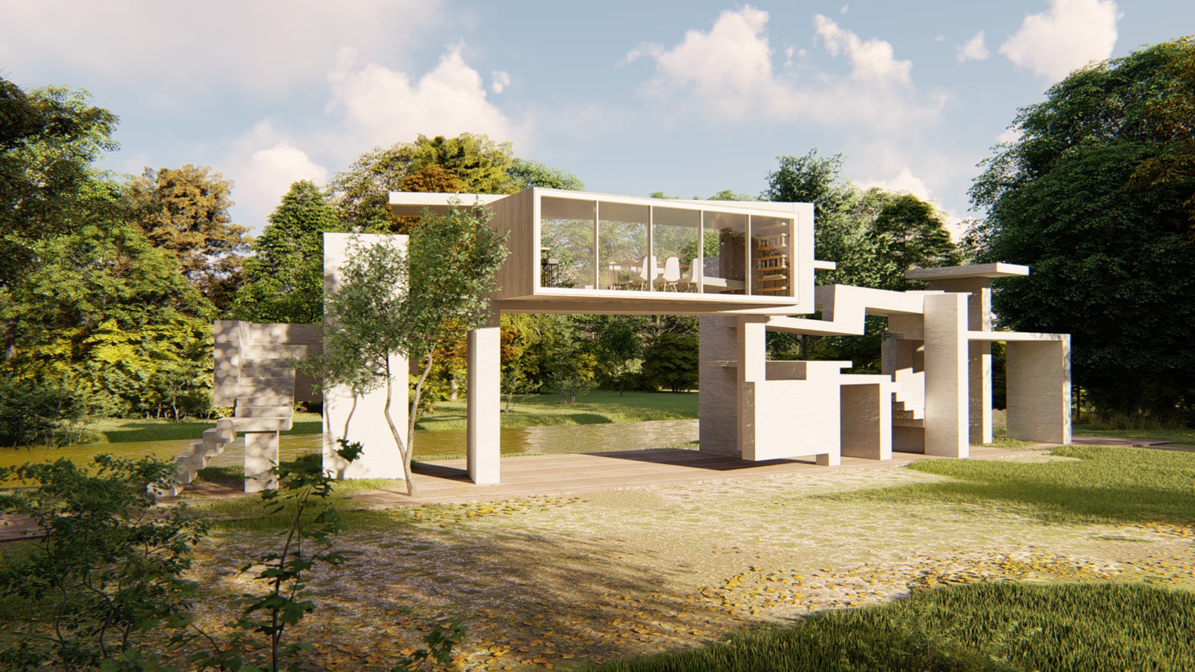 我們想要打造一個結合大自然的寧靜與融合樹屋特色的 K 書中心,希望可以讓學生們可以享受在讀書的當下,並結合一些綠色植物和療癒小動物來緩解讀書的壓力。打造在森林裡的 K 書中心,不僅能在享受大自然的當下讀書,還能獲得大自然給你的回饋,同時享受被小動物包圍的療癒感.運用許多樓梯跟平台成為大自然與閱讀的媒介,閱讀的同時並享受大自然芬多精的洗禮。