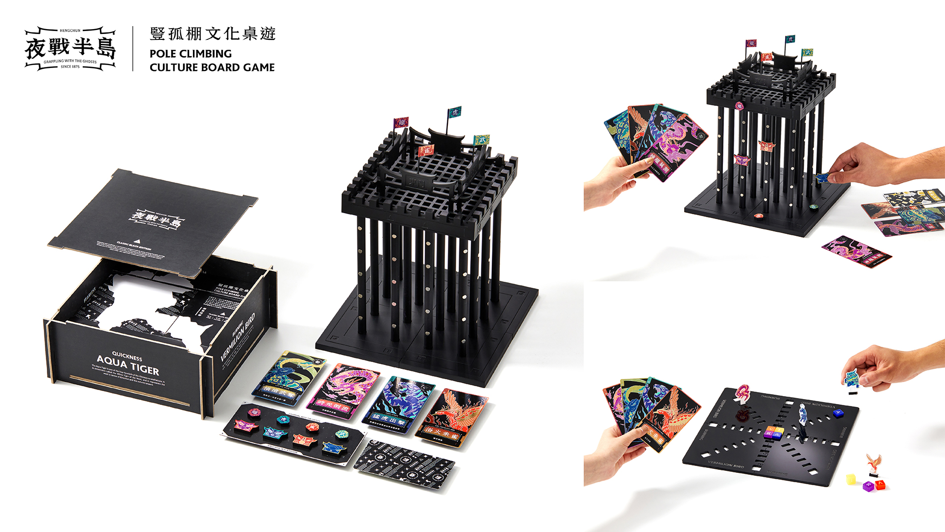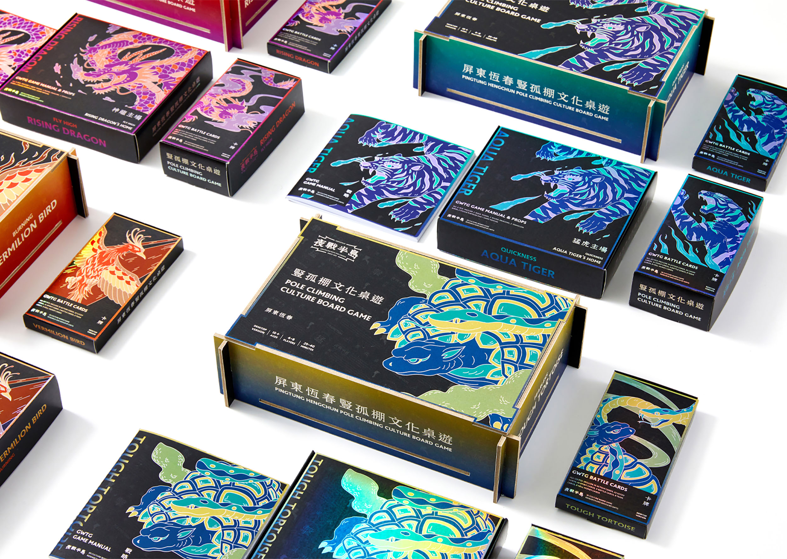 恆春豎孤棚已有百餘年歷史,為了讓該文化更容易被大眾理解與認識;我們深入恆春實際參與,結合文化背景與規則,融合燙金工藝,設計出能藉由遊玩認識該文化的桌遊品牌。