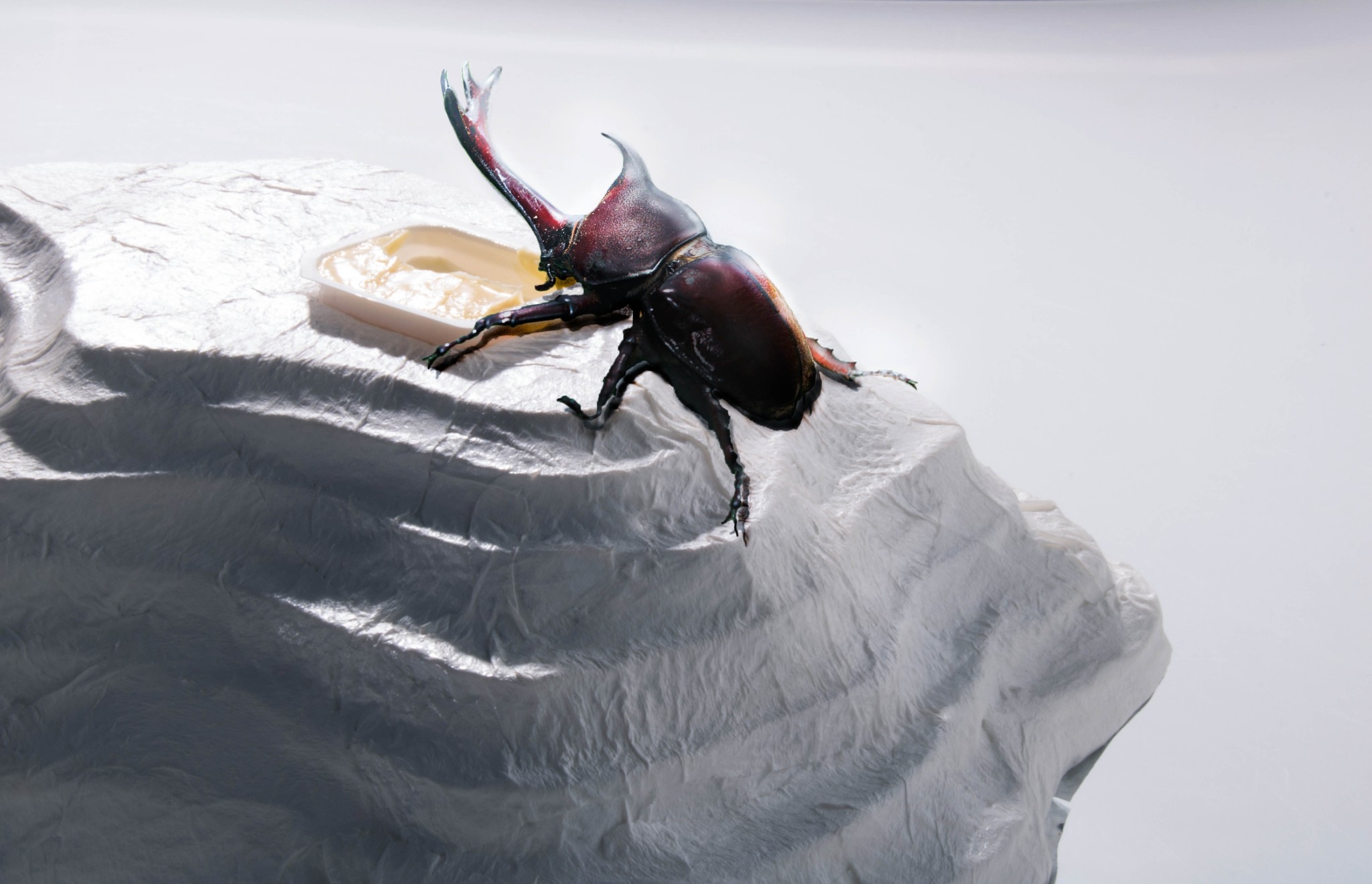 原本的甲蟲果凍包裝是常見的塑膠袋包裝,許多養甲蟲的人很容易遇到甲蟲將果凍打翻的狀況,或是果凍殼太深,無法食用完的情況,一般果凍打翻容易跟水苔或木屑混雜,這樣容易造成細菌孳生,影響到甲蟲的壽命。於是我們將這幾點問題重新思考,設計出符合甲蟲生活的包裝。