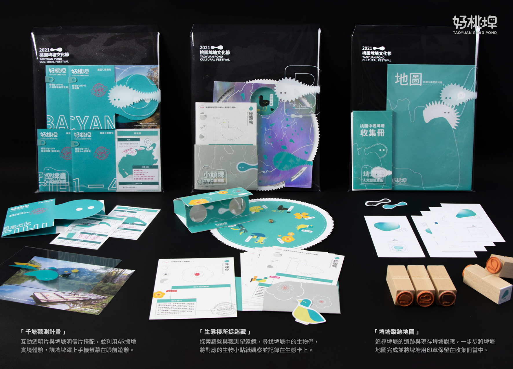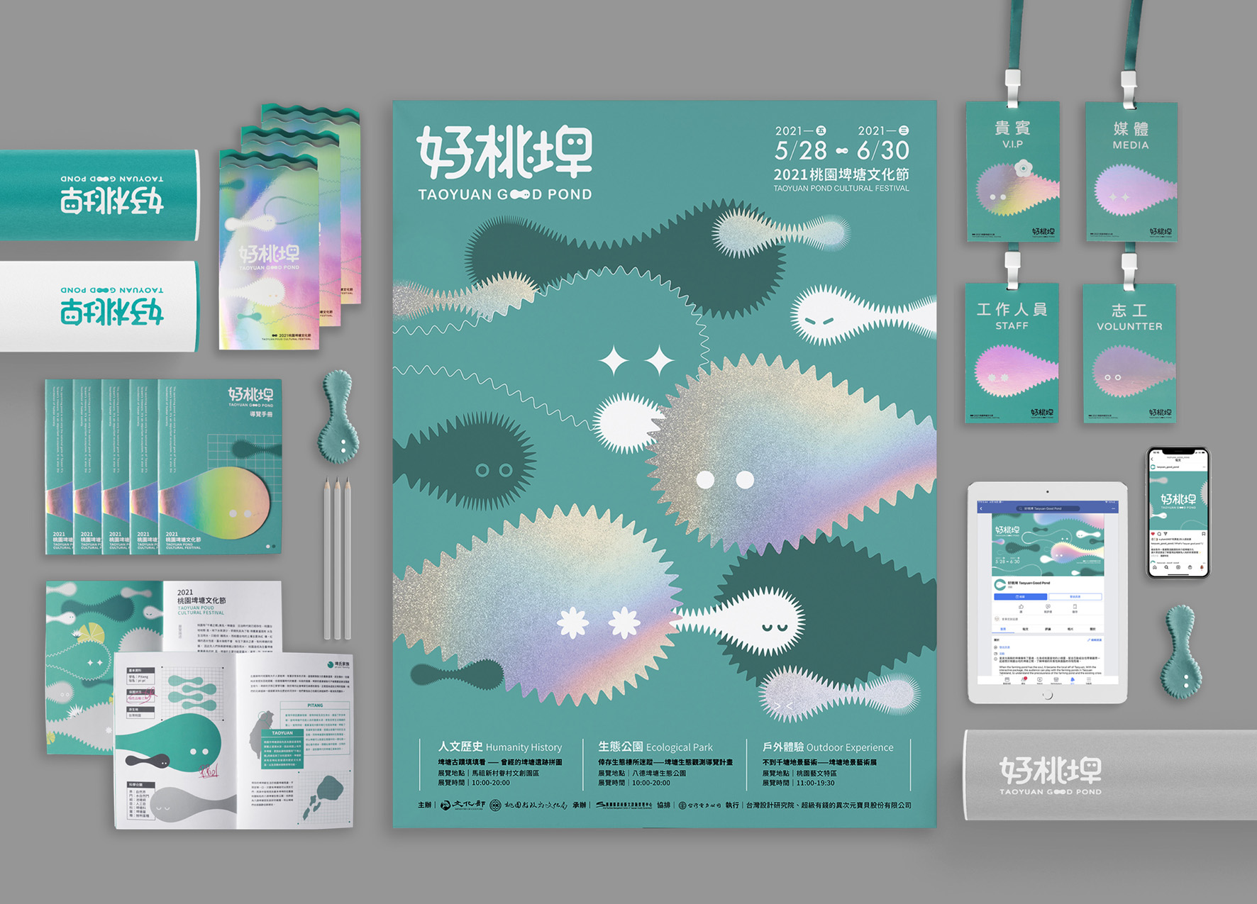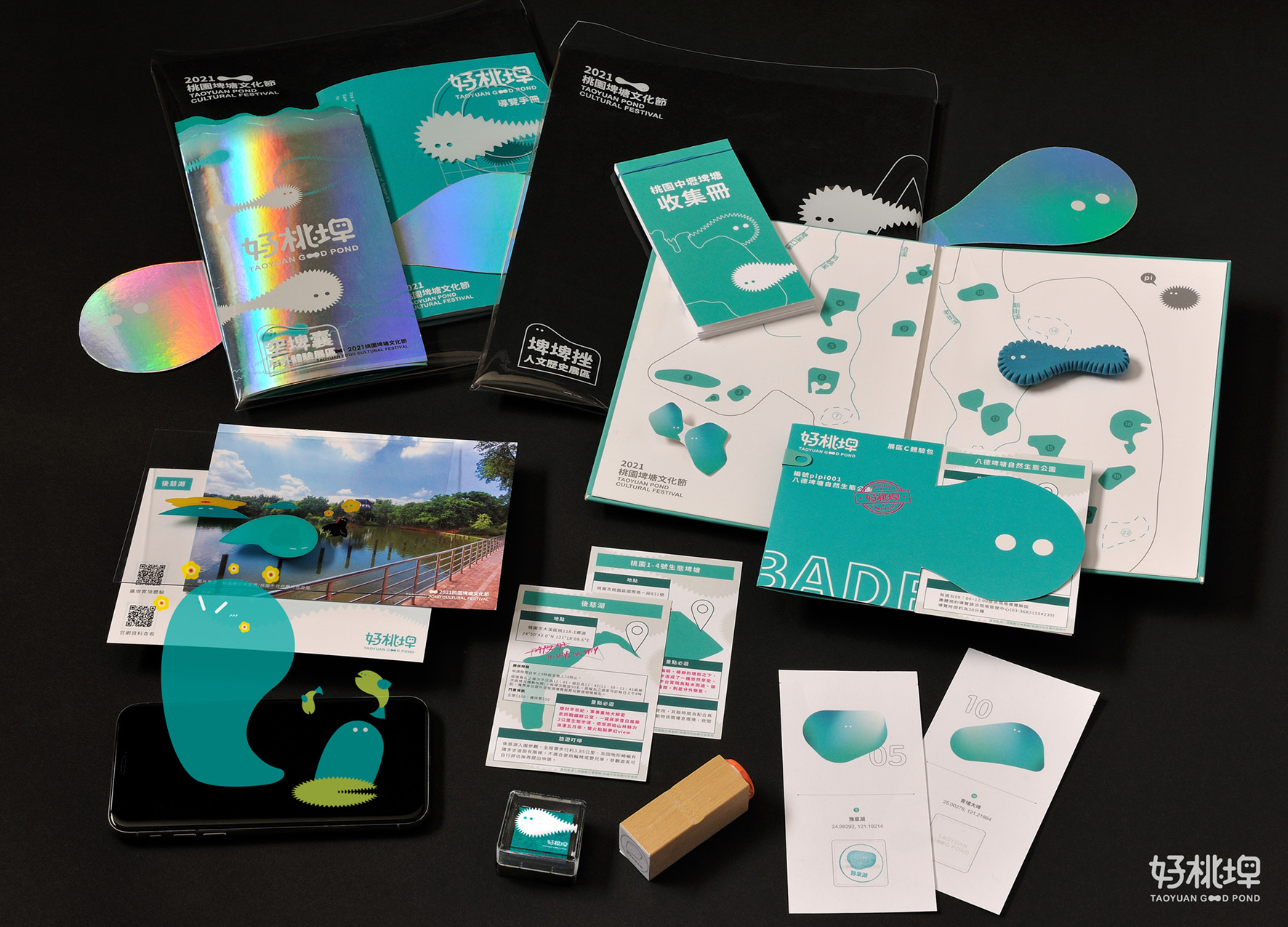 好桃埤為「埤塘文化」設計一套完整的「活動識別設計」,以延伸出桃園埤塘文化節。我們賦予埤塘靈魂、新意象,轉化為桃園當地的小精靈—埤埤。同時規劃三個展區、設計展覽互動組合包,藉由埤埤帶著觀眾遊憩於埤塘間,讓埤塘進入大眾視野,了解與認知埤塘的珍貴與面臨的存歿危機。