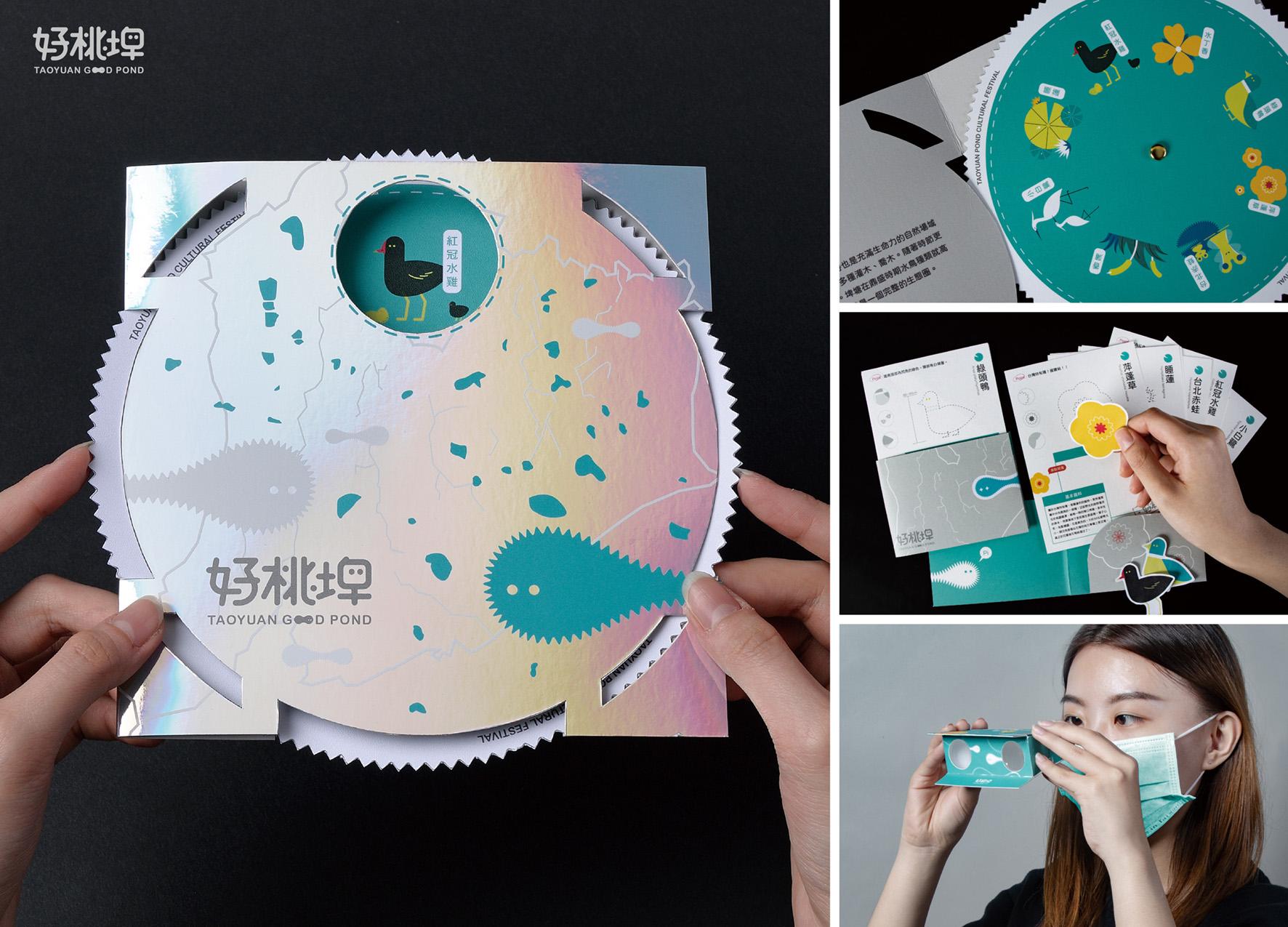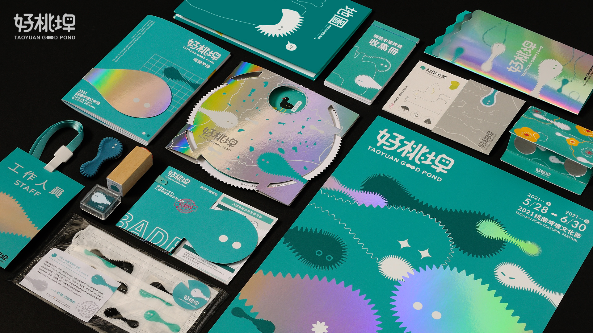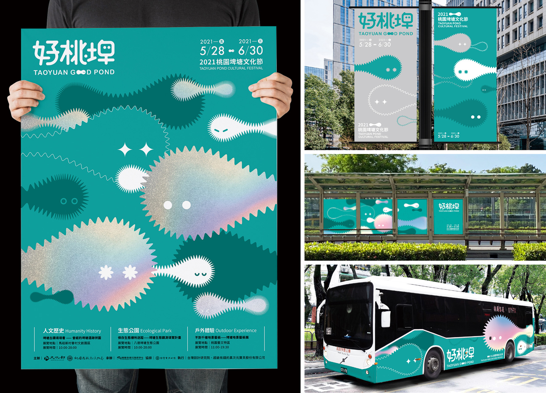 好桃埤為「埤塘文化」設計一套完整的「活動識別設計」,以延伸出桃園埤塘文化節。我們賦予埤塘靈魂、新意象,轉化為桃園當地的小精靈—埤埤。同時規劃三個展區、設計展覽互動組合包,藉由埤埤帶著觀眾遊憩於埤塘間,讓埤塘進入大眾視野,了解與認知埤塘的珍貴與面臨的存歿危機。