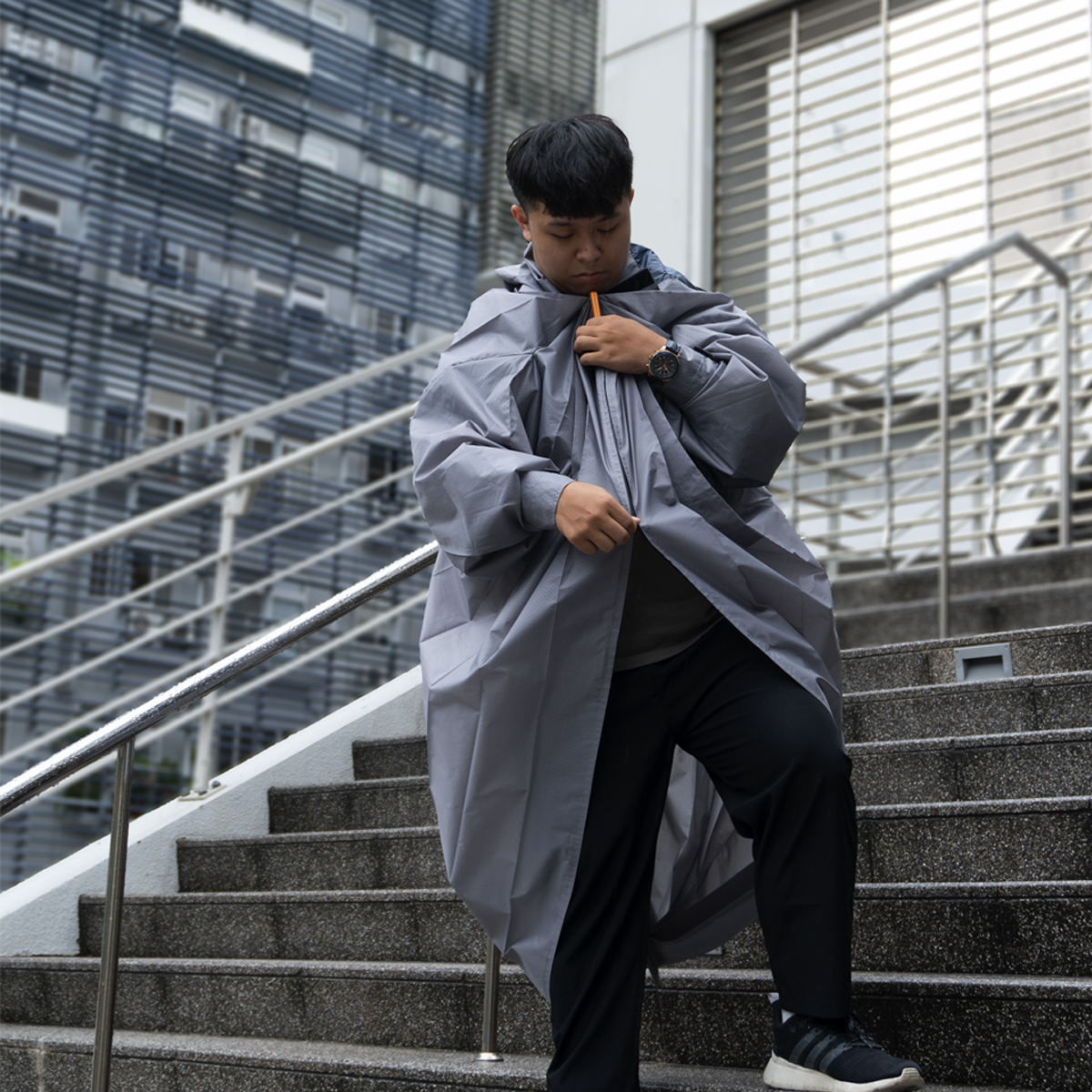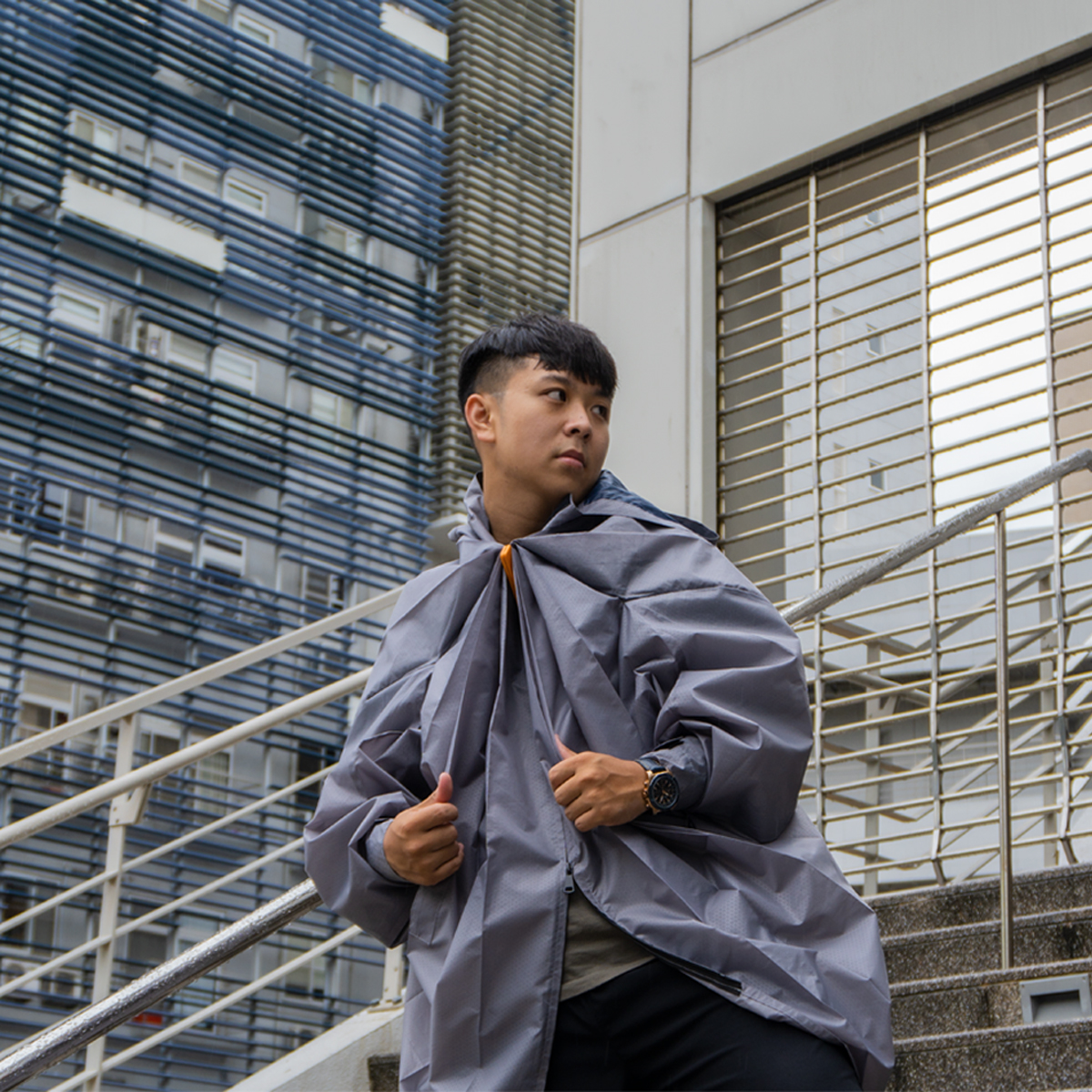 透過參考摺紙工程並結合斗篷衣的舒適便利,改變雨衣的原有形態,讓使用者只需要用一個動作就能更輕易的收納雨衣。優化雨天時進出室內外穿脫雨衣的過程和感受。提供使用者一種新的收納體驗,讓大眾別再妥協雨衣的缺點。