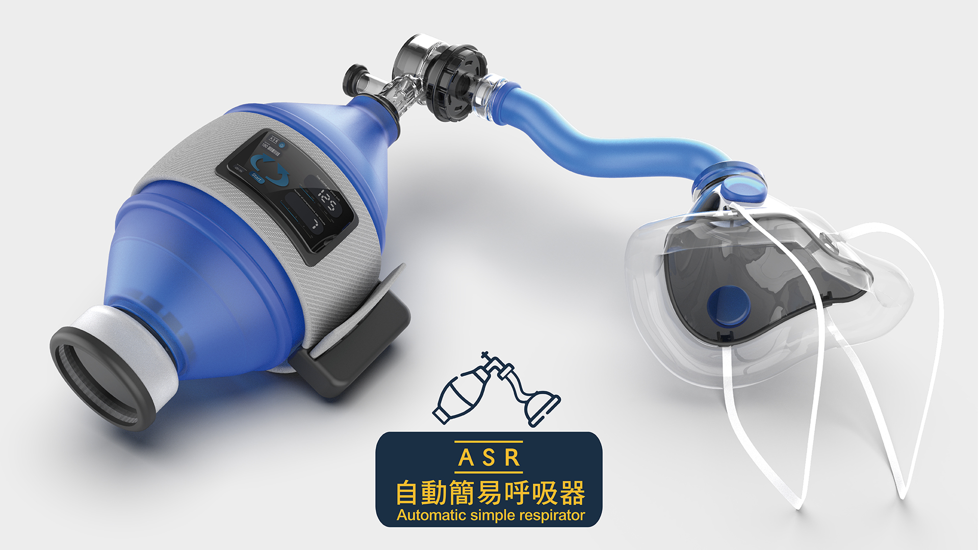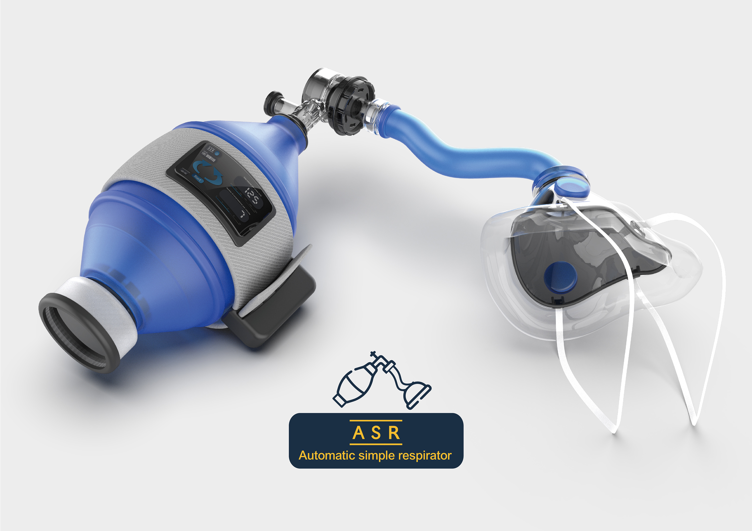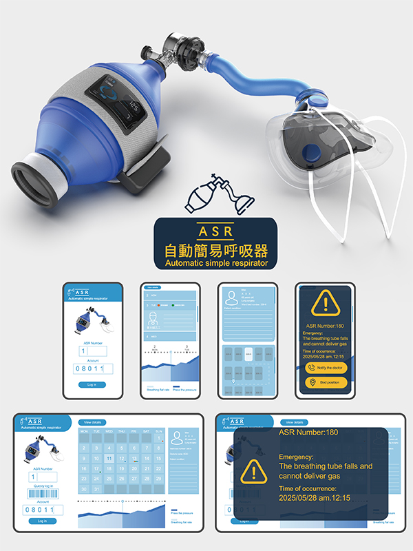 ASR以氣囊壓脈袋加裝在氣囊球外,動力壓縮按壓,達到自動24小時給氧,進氣口可加裝過濾器,讓空氣更加無毒乾淨,提高純氧量;乾粉式藥物的添加,增加治療的功能。並且搭配「氣口面罩」給患者使用,避免醫護人員需用手壓住呼吸罩,導致疾病傳染。自動化同時,也會將資訊傳送給APP,控管病患的呼吸器問題、呼吸按壓數據,達到真正的自動化簡易呼吸器。