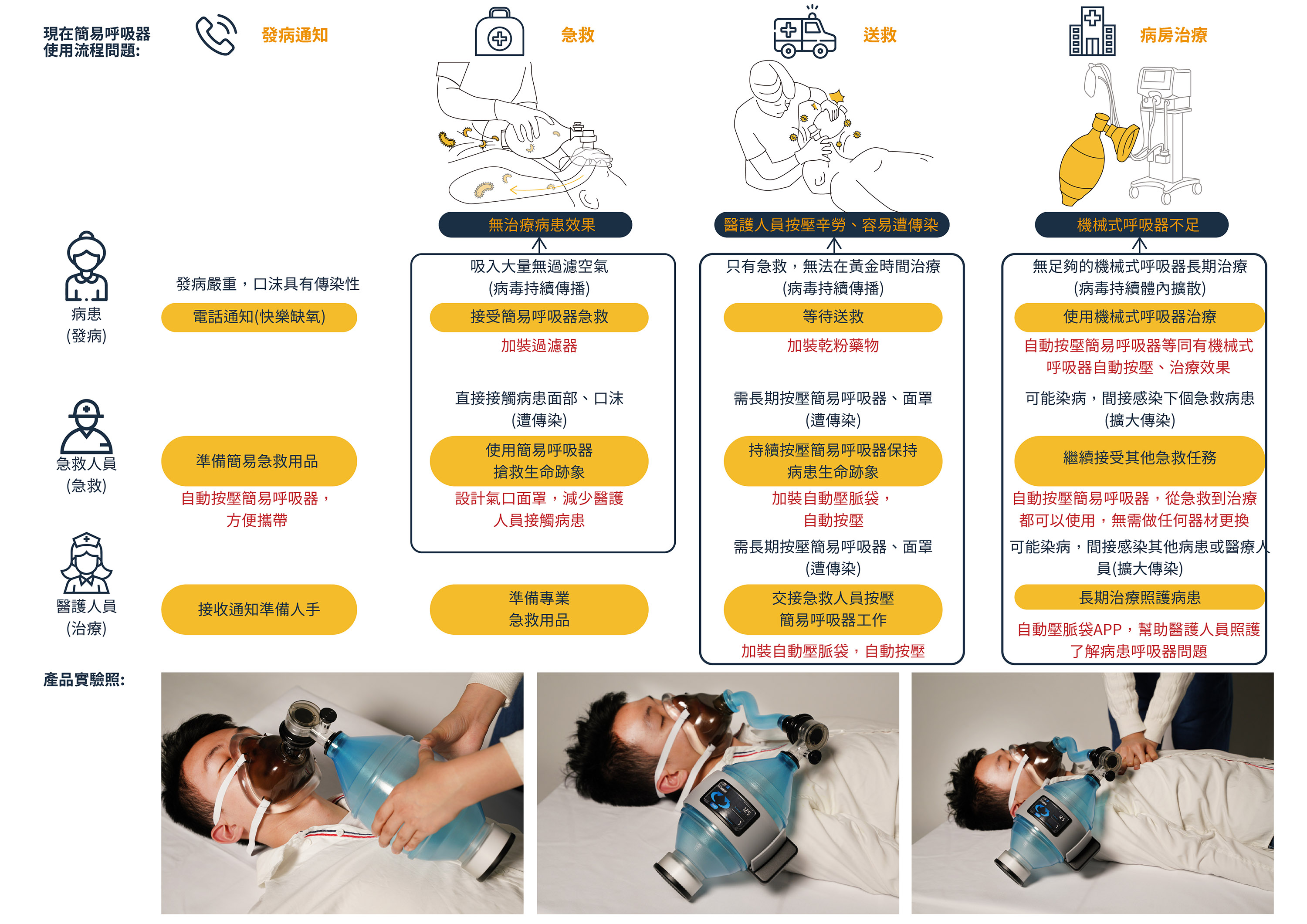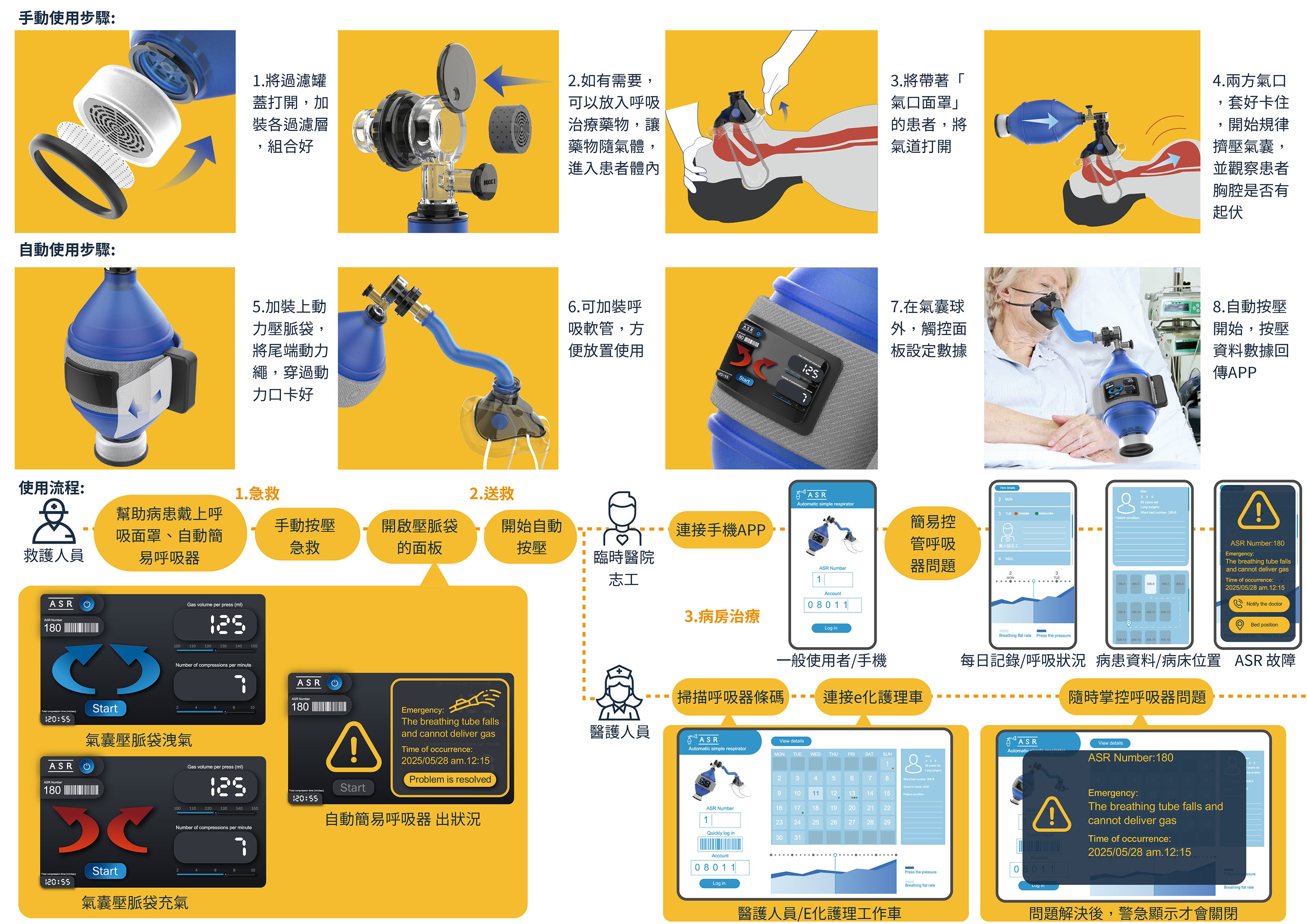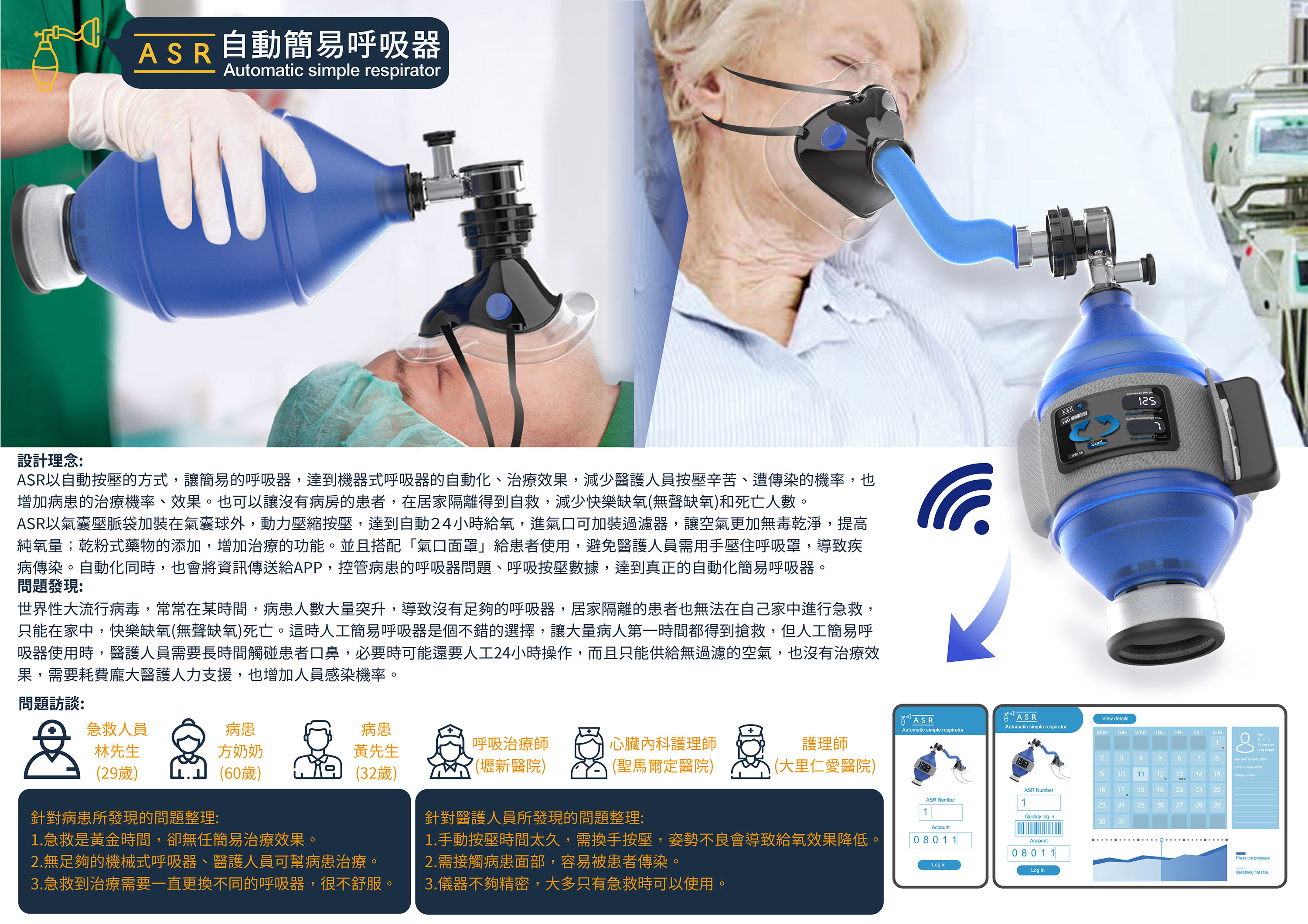 ASR以氣囊壓脈袋加裝在氣囊球外,動力壓縮按壓,達到自動24小時給氧,進氣口可加裝過濾器,讓空氣更加無毒乾淨,提高純氧量;乾粉式藥物的添加,增加治療的功能。並且搭配「氣口面罩」給患者使用,避免醫護人員需用手壓住呼吸罩,導致疾病傳染。自動化同時,也會將資訊傳送給APP,控管病患的呼吸器問題、呼吸按壓數據,達到真正的自動化簡易呼吸器。