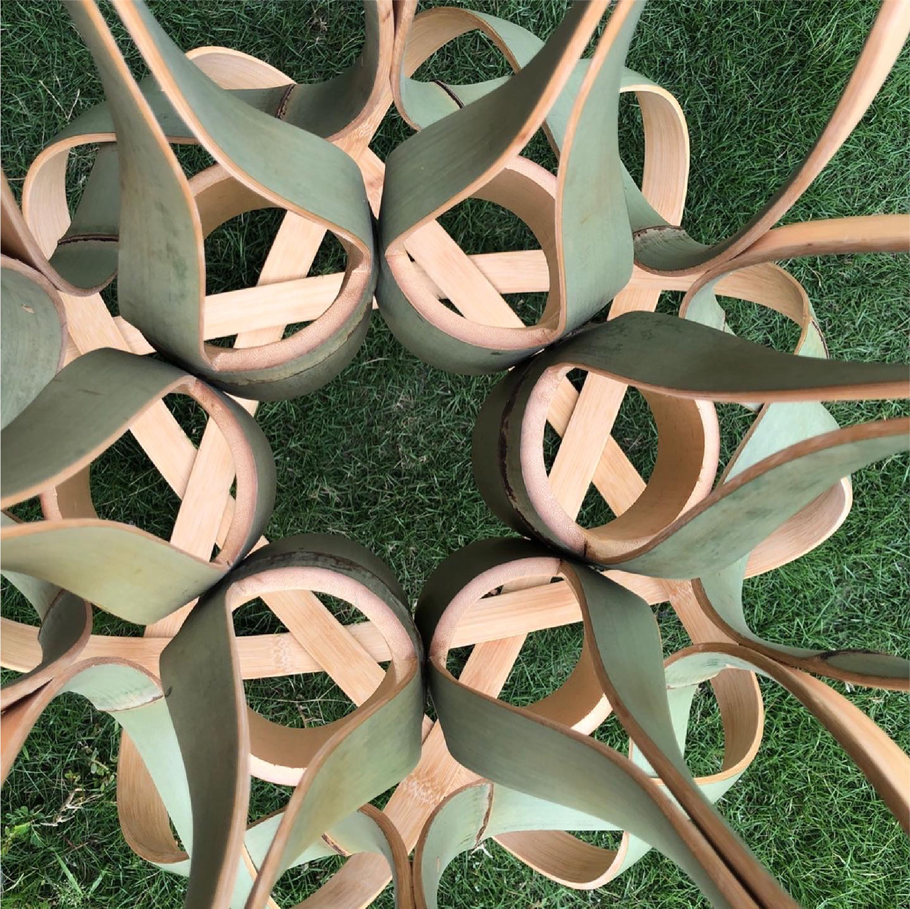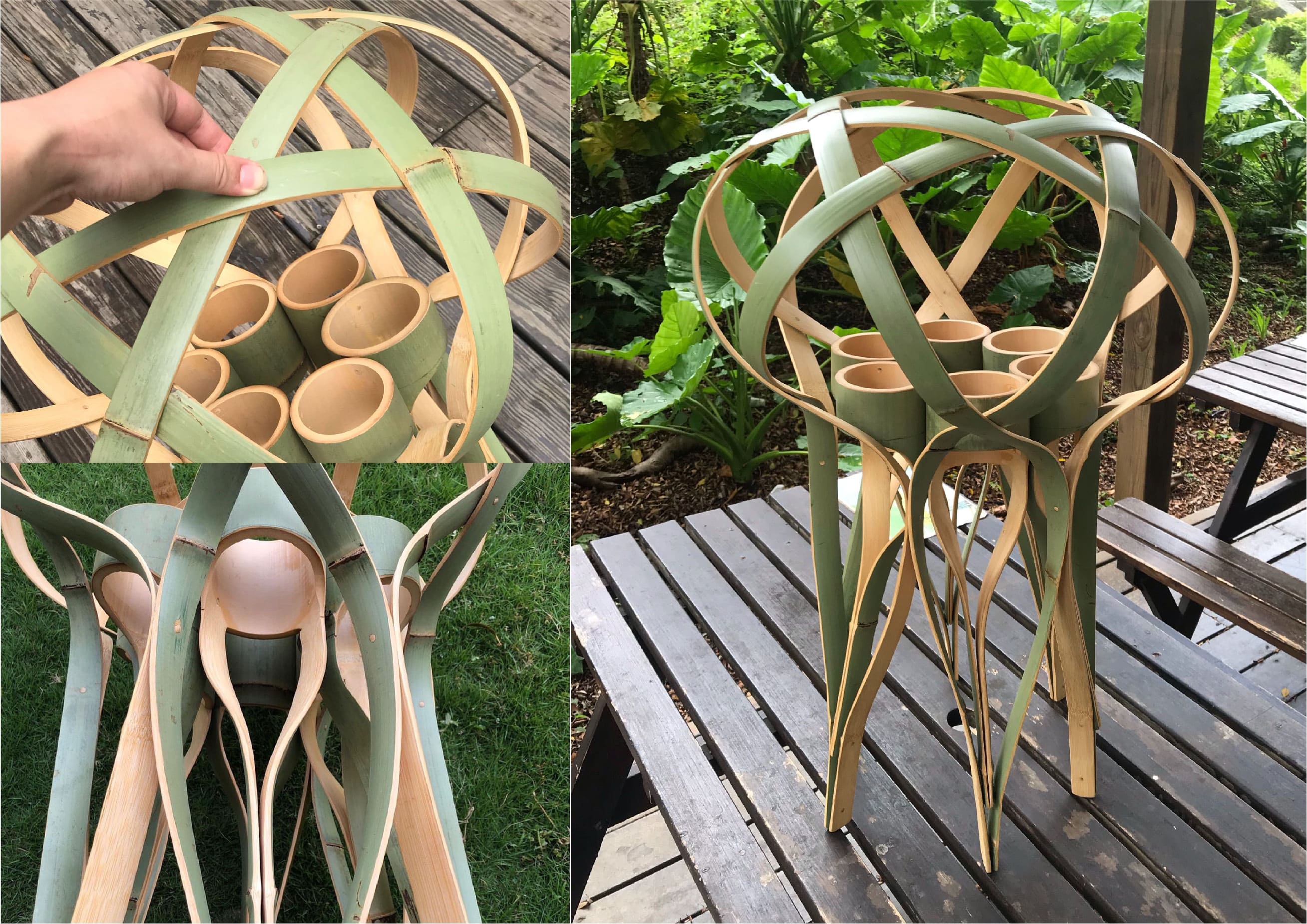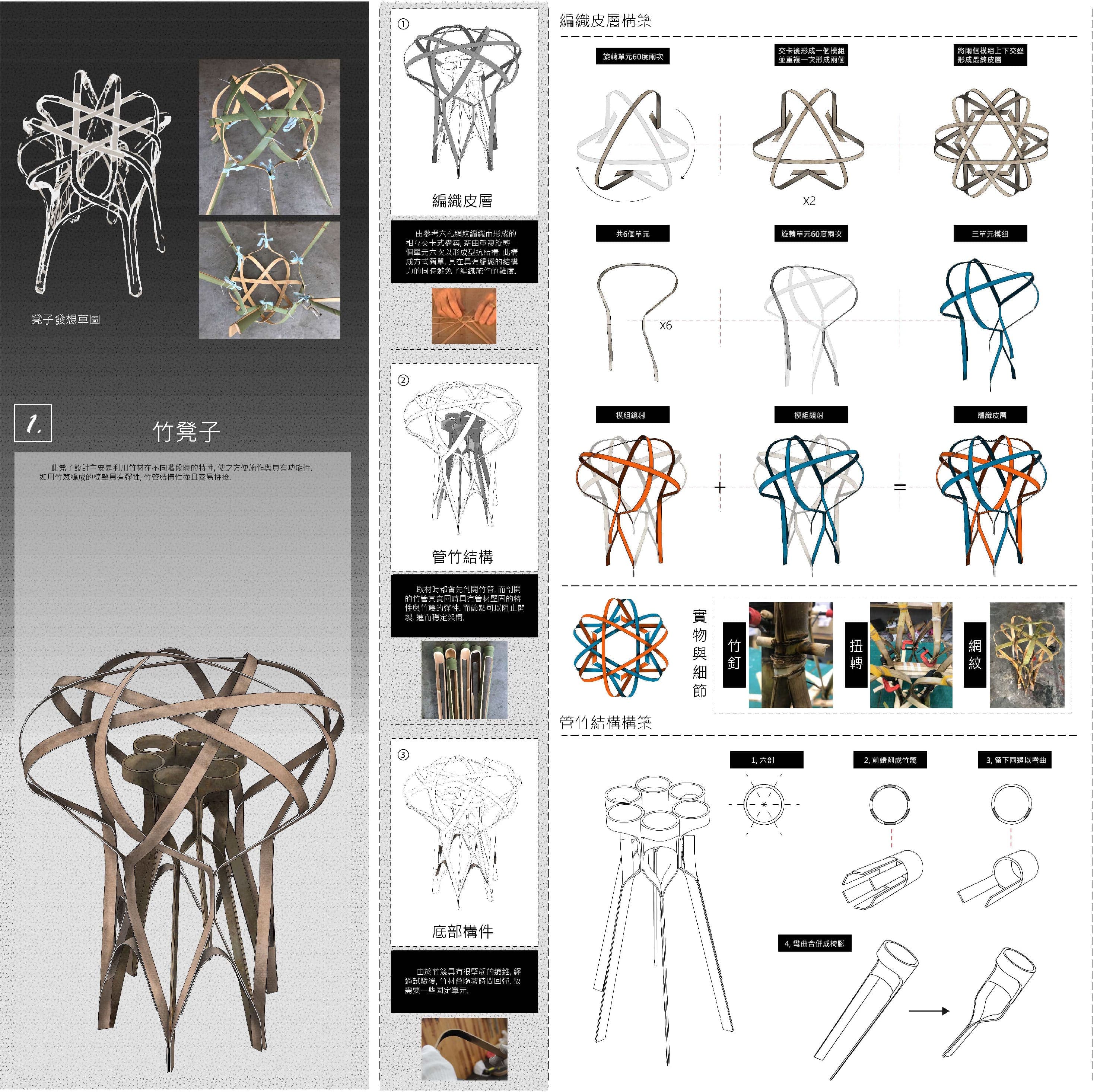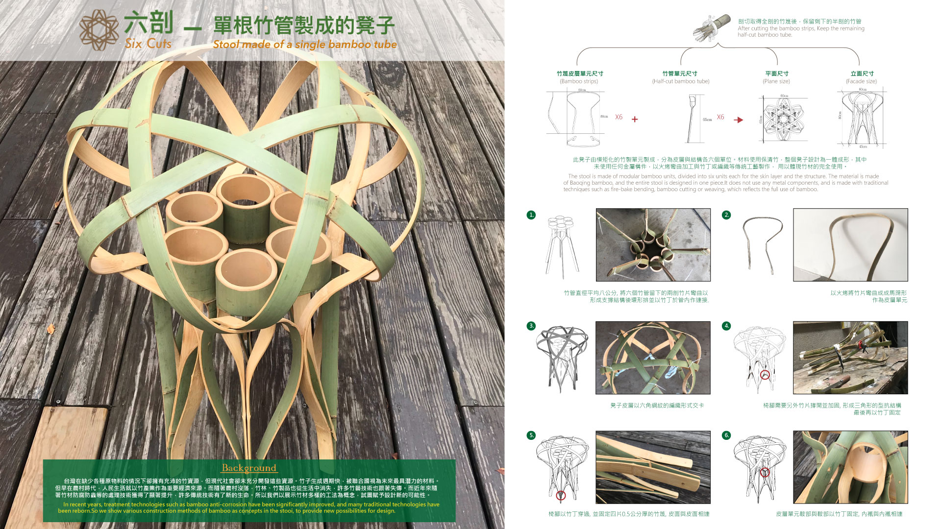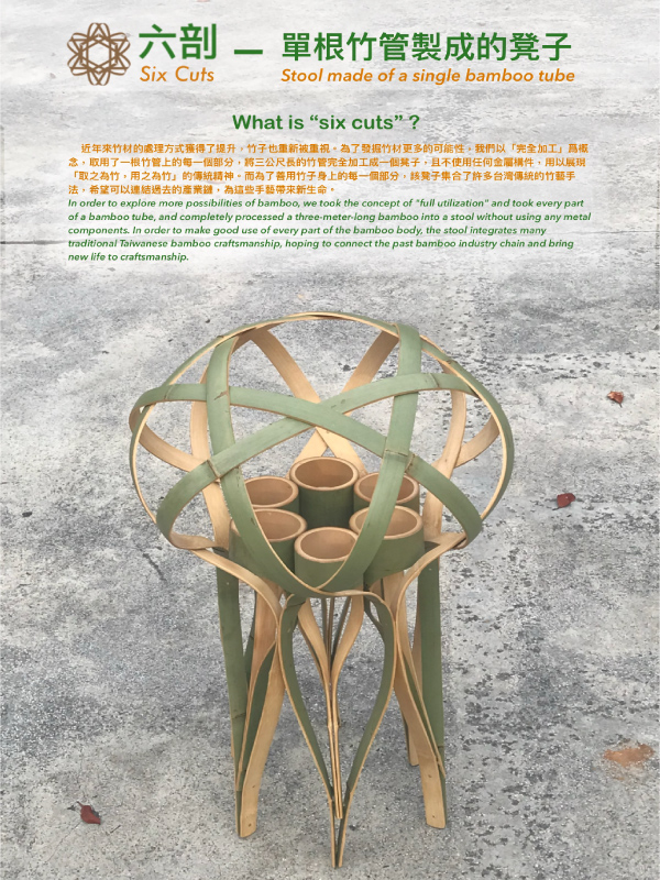 台灣在缺少各種原物料的情況下卻擁有充沛的竹林資源,但現代社會卻未充分開發與應用這些資源。竹材生成週期快,被聯合國視為未來最具潛力的材料。早在台灣農村時代,人民生活就與竹子為伍,以竹產業作為重要經濟來源。而隨著農村沒落,竹林、竹製品也從生活中消失,許多竹藝技術也跟著失傳。所以針對這個議題,我們設計了一款以”完全加工”為概念的竹凳子,取用了一根竹管上的每一個部分,將一根三公尺長的竹子完全加工成一個凳子,以傳統工法做設計與製作,不使用任何金屬構件,用以展現”取之為竹,用之為竹”的傳統農村精神。而為了善用竹子身上的每一個部分,該凳子集合了許多台灣傳統的竹工藝手法,希望可以連接過去的竹產業鏈, 為這些手藝帶來新生命。