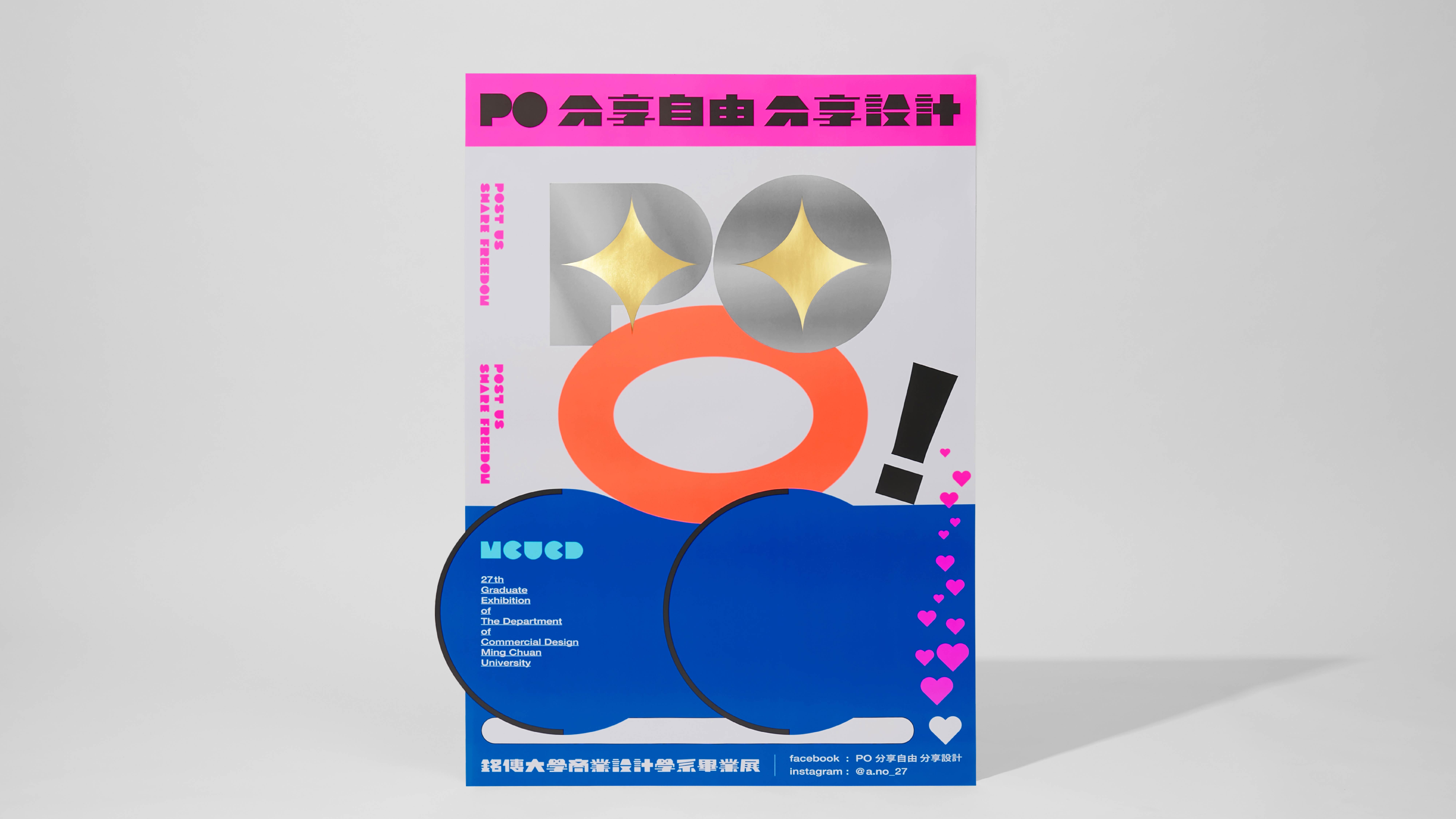 此為銘傳大學商業設計學系第二十七屆畢業展形象。 「PO」轉譯自網路用語,意指於社群媒體上貼文,同時也是本次展覽展出的動詞;我們以「分享自由 分享設計」為核心理念,比喻我們積極為各類社會議題發聲。同時我們強調「設計與政治無法分割,新一代從不畏懼大聲表態」。