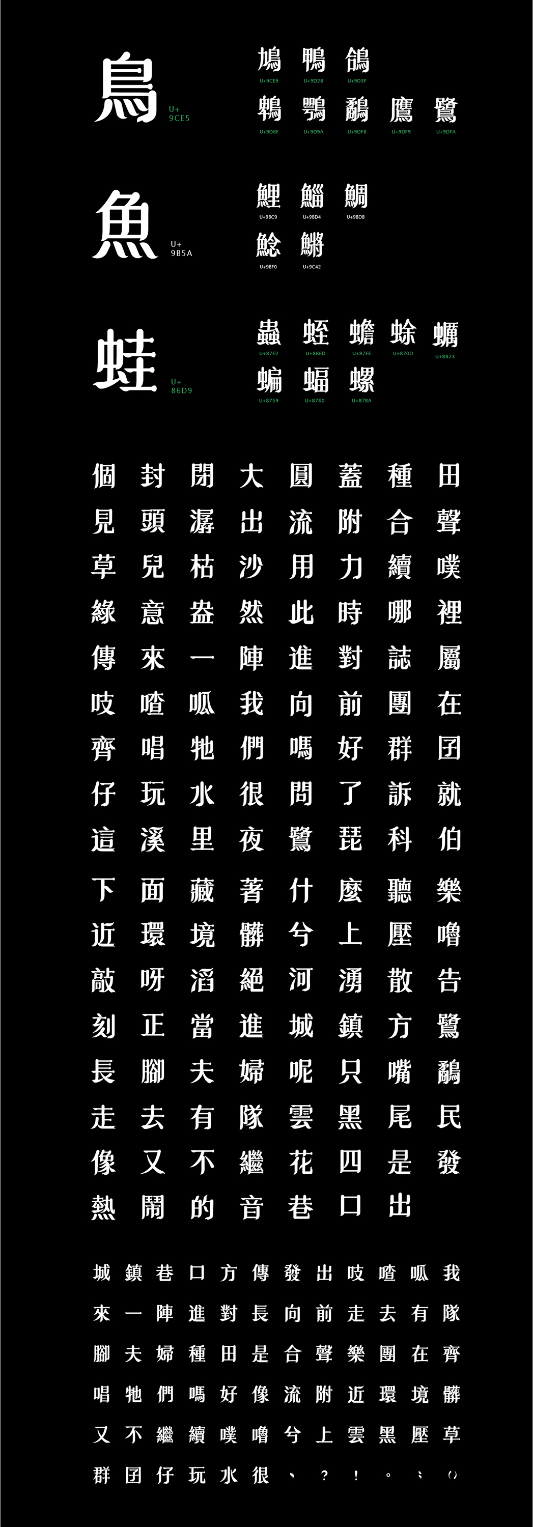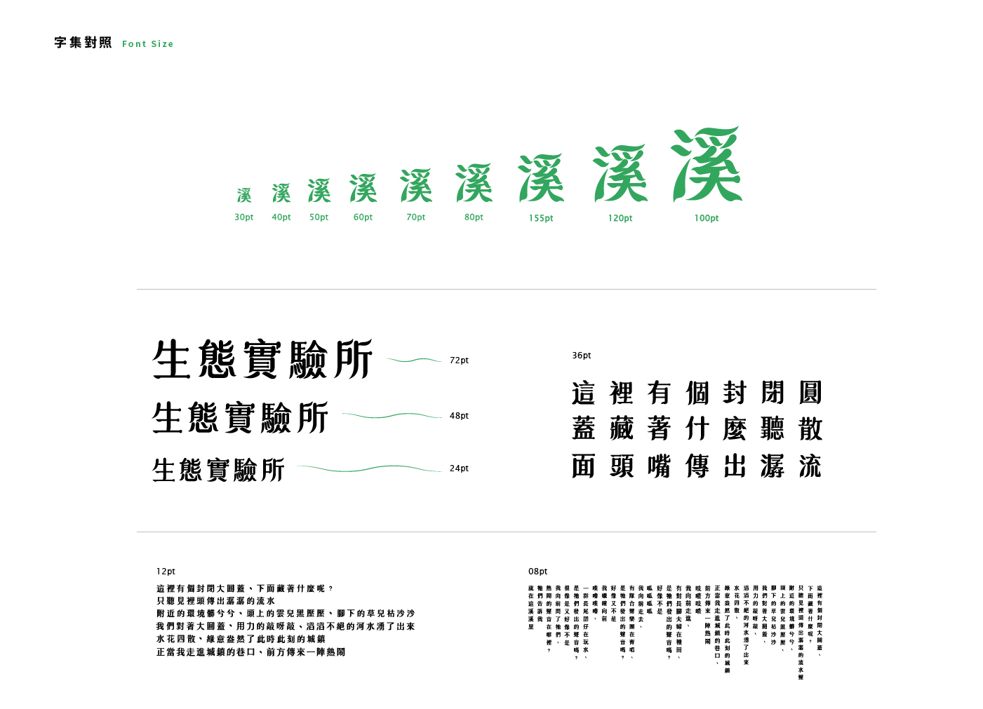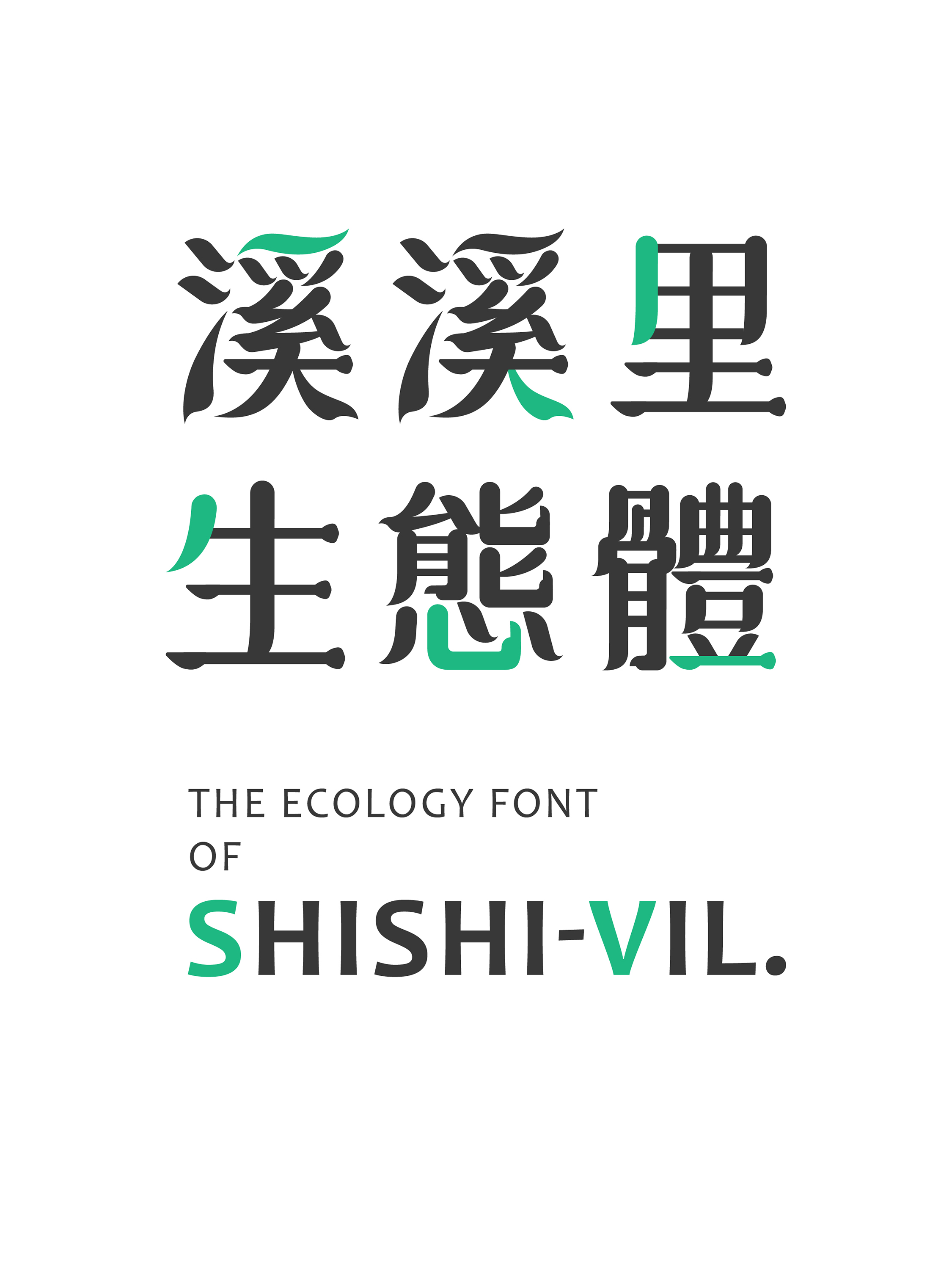 桃園中壢老街溪的河川生態如同鄉里社區般熱鬧,故我們把這裡稱之為「溪溪里」,將溪溪里的一切化為文字,將筆畫仿做生態物種特徵,點如葉、捺如鰭、撇如羽、鉤如鳥爪、豎撇如鷸尾、橫畫如大肚魚,彷彿多樣物種就在字裡捉迷藏,其間架卻又不失莊嚴典雅,活潑生態,就在這溪溪里。