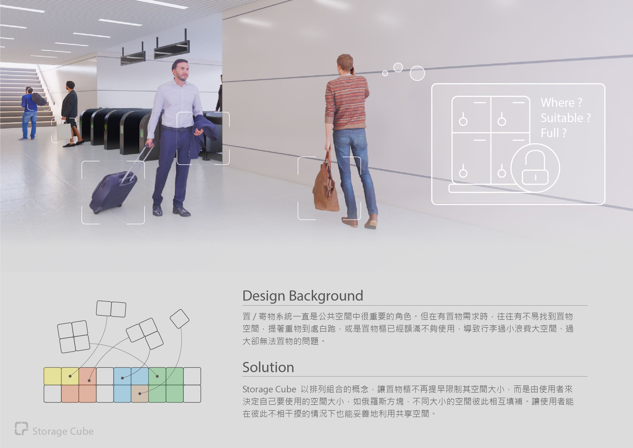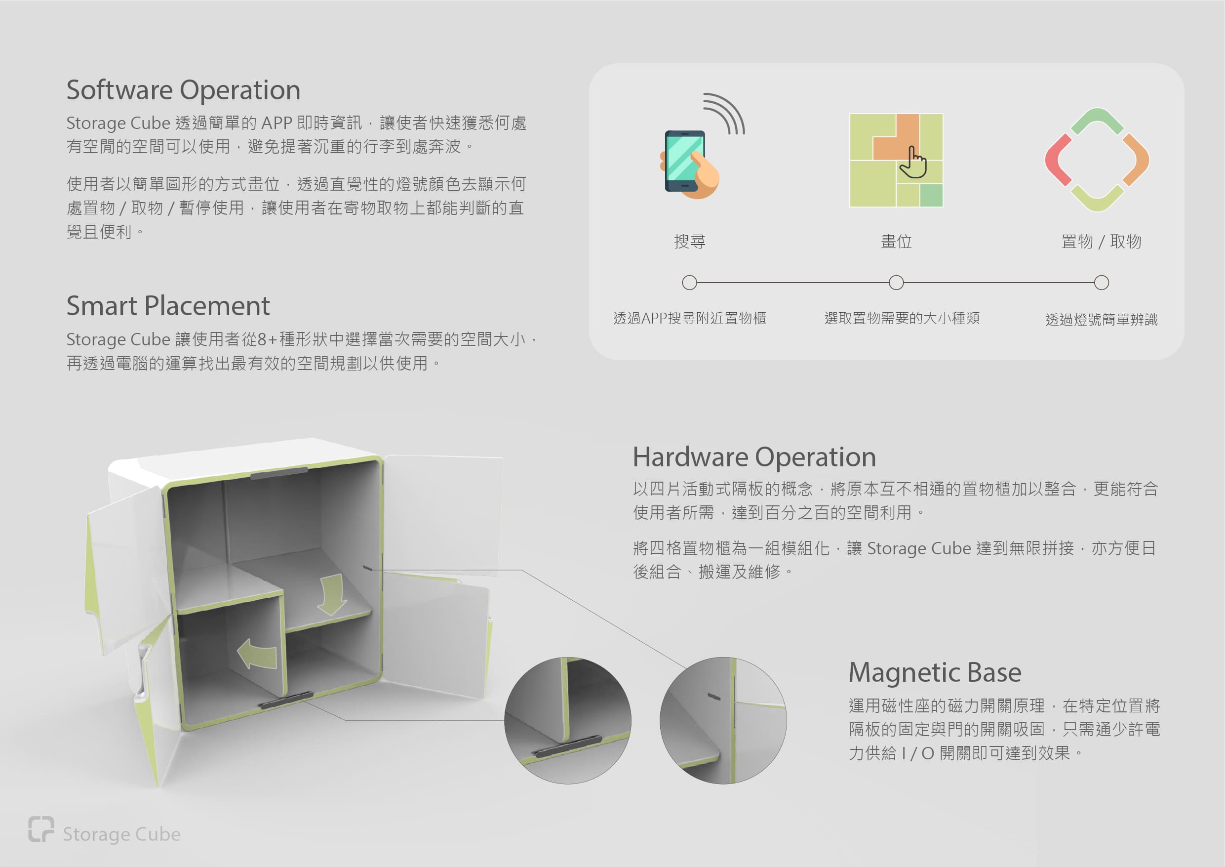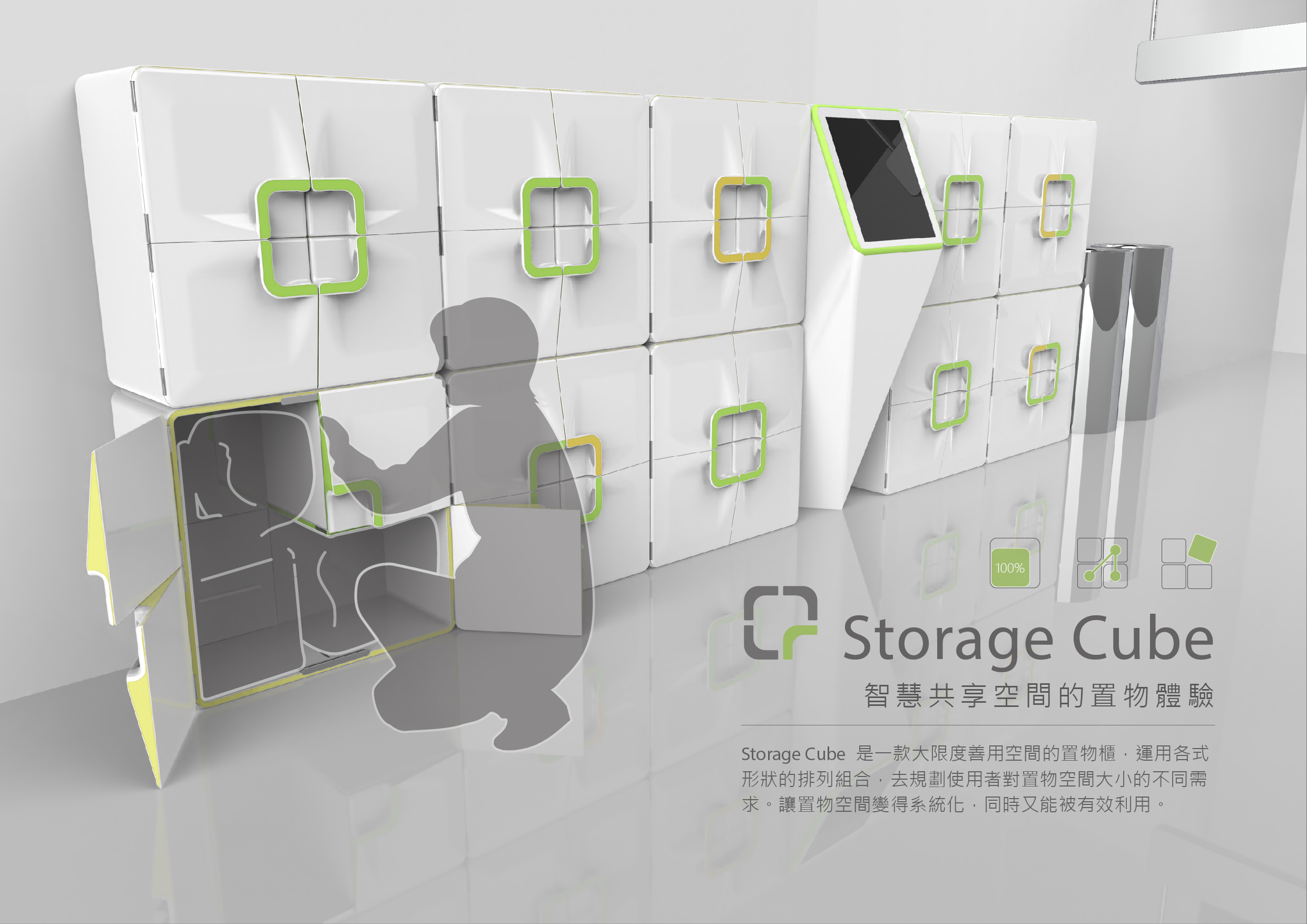 Storage Cube以排列組合的概念,讓置物櫃不再提前限制其空間大小,而是由使用者來決定自己要使用的空間大小,如俄羅斯方塊,不同大小的空間彼此相互填補。讓使用者能在彼此不相干擾的情況下也能妥善地利用共享空間。