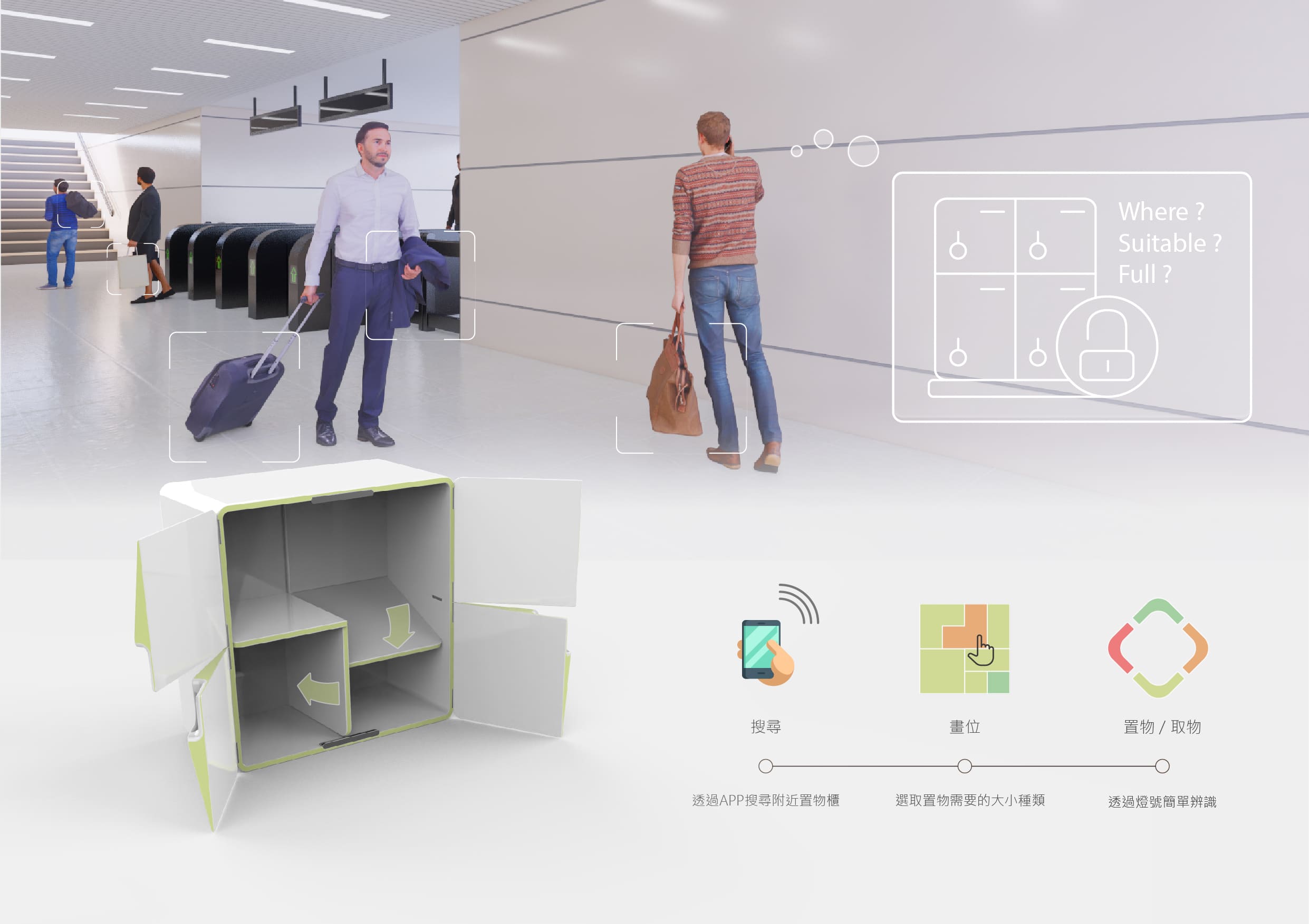 透過簡單的 APP 即時資訊,讓使者快速獲悉何處有空閒的空間可以使用,避免提著沉重的行李到處奔波。