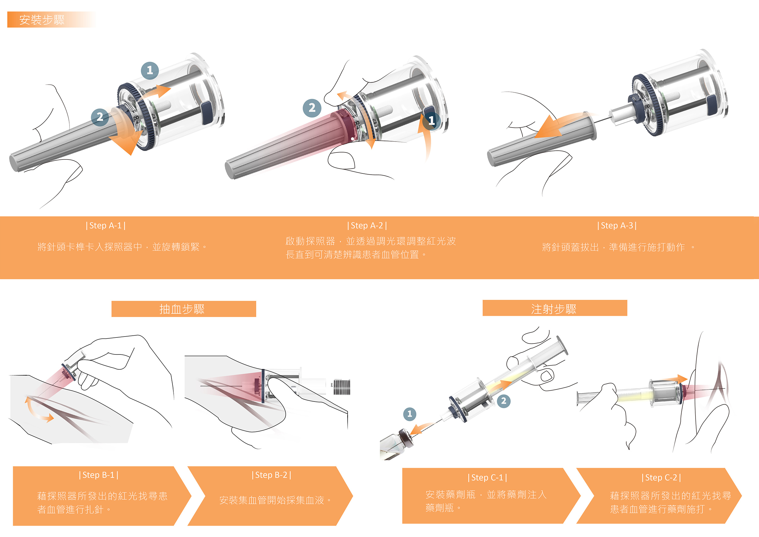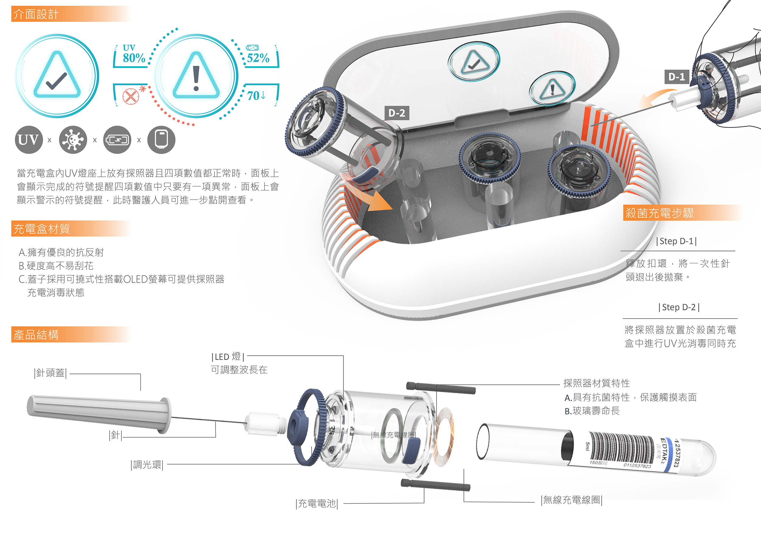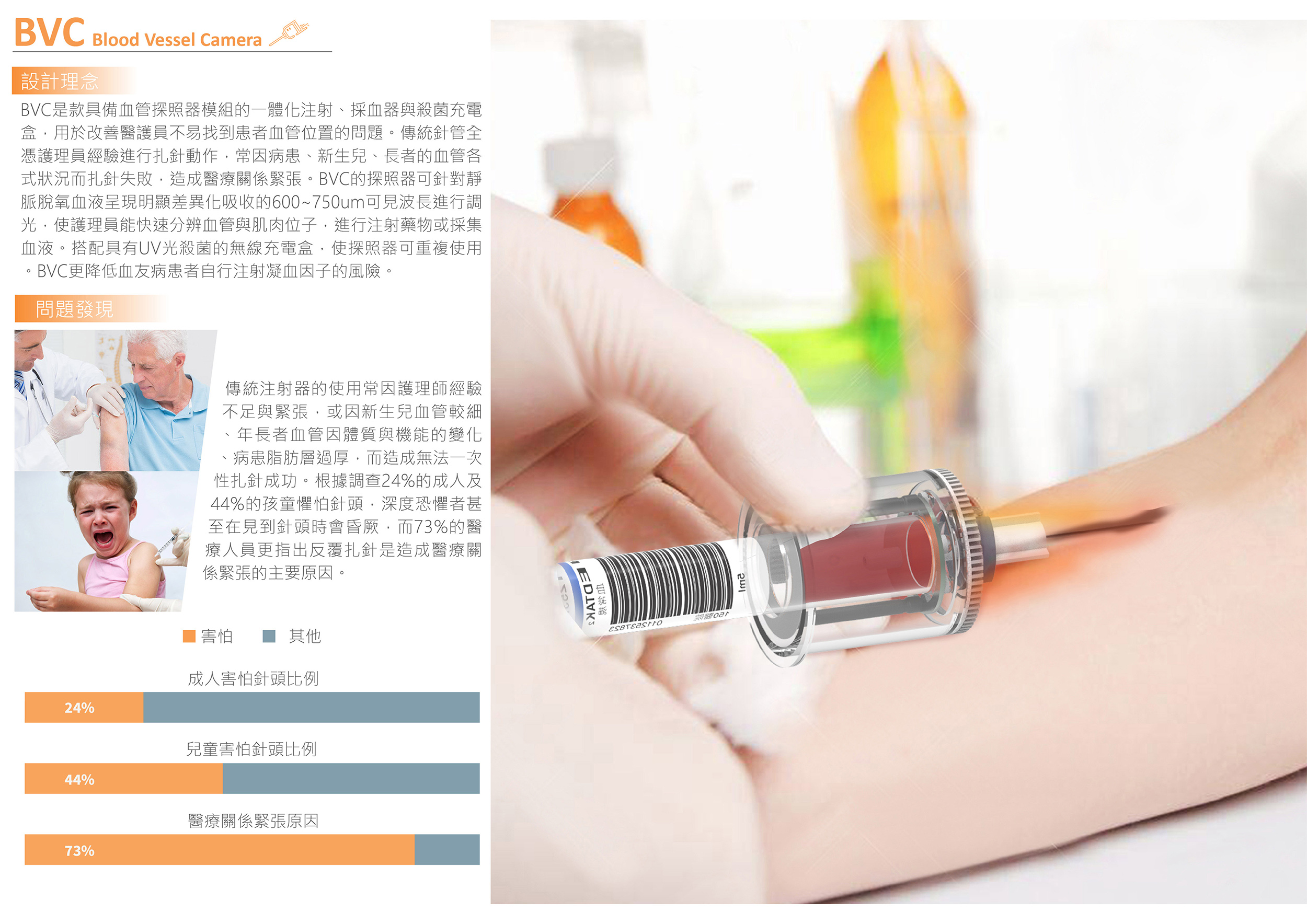 BVC是款具備血管探照器模組的一體化注射、採血器與殺菌充電盒,用於改善醫護員不易找到患者血管位置的問題。傳統針管全憑護理員經驗進行扎針動作,常因病患、新生兒、長者的血管各式狀況而扎針失敗,造成醫療關係緊張。BVC的探照器可針對靜脈脫氧血液呈現明顯差異化吸收的600~750um可見波長進行調光,使護理員能快速分辨血管與肌肉位子,進行注射藥物或採集血液。搭配具有UV光殺菌的無線充電盒,使探照器可重複使用。BVC更降低血友病患者自行注射凝血因子的風險。