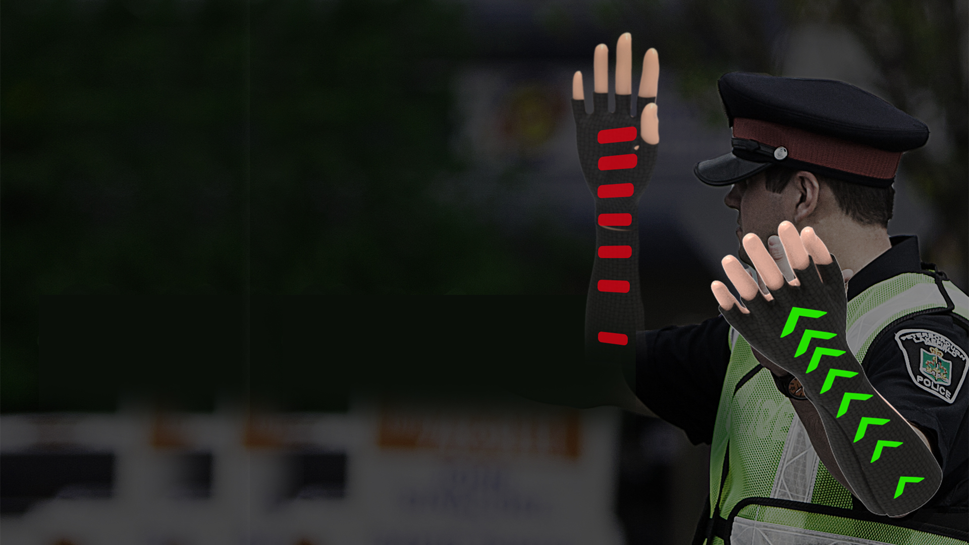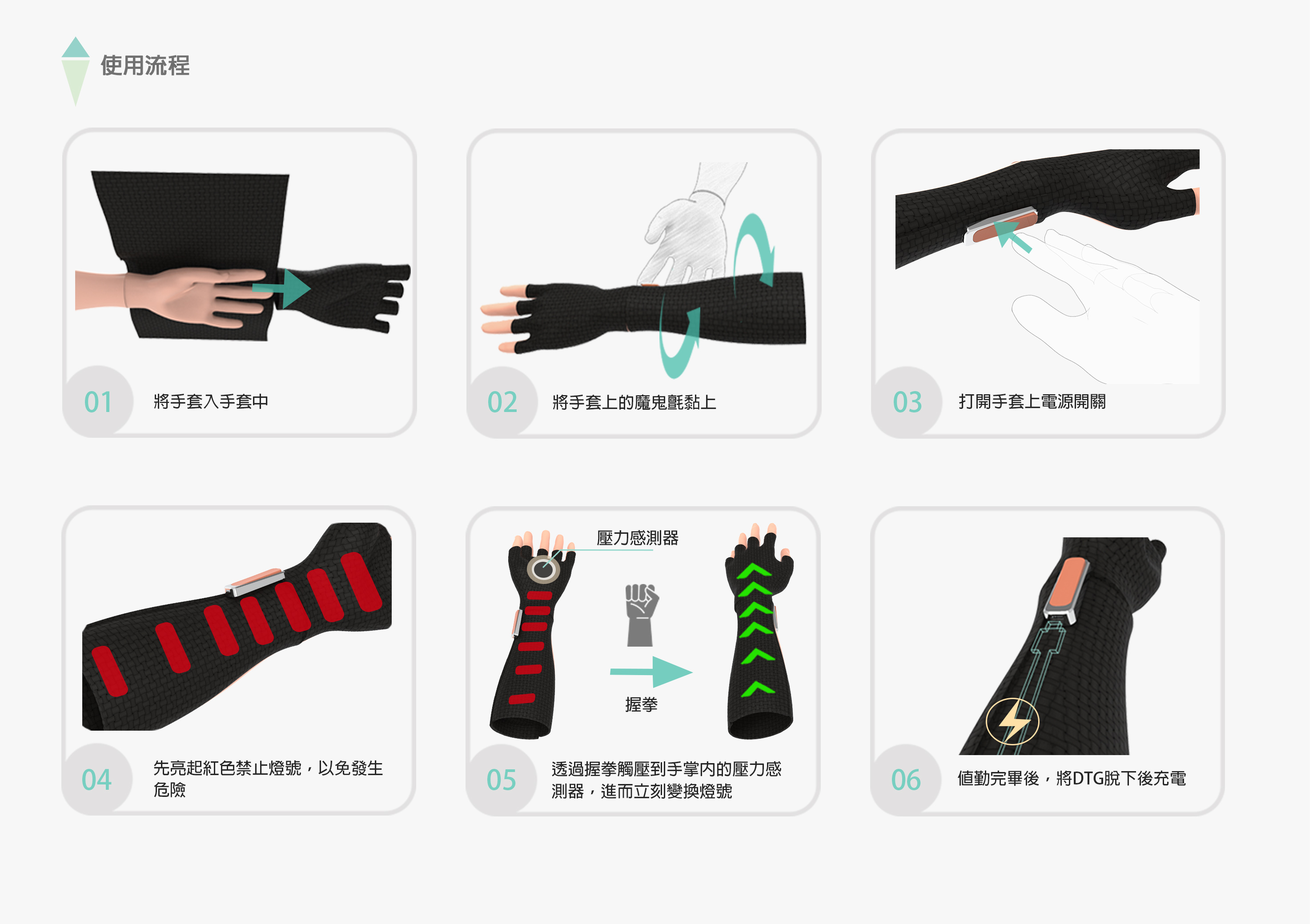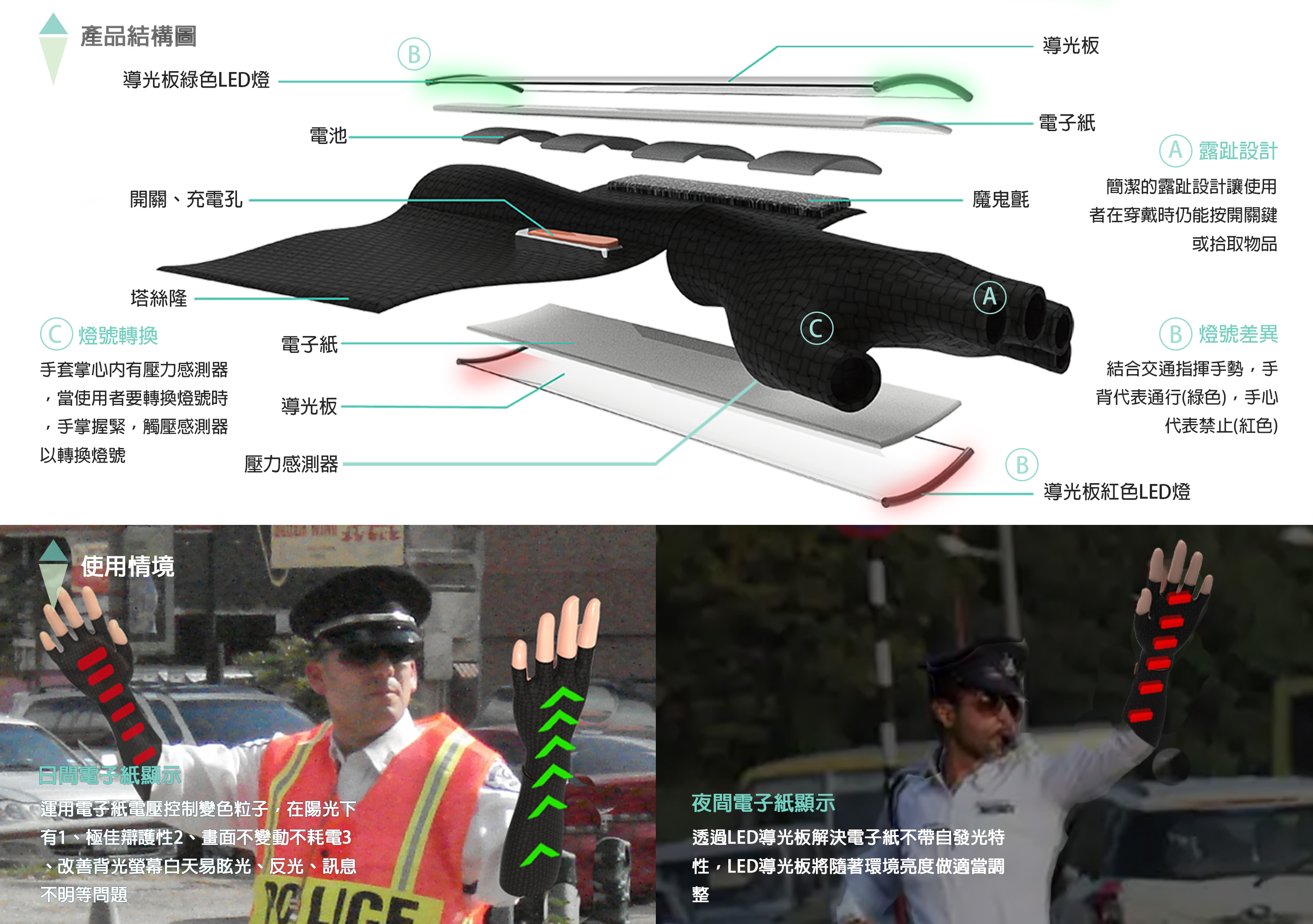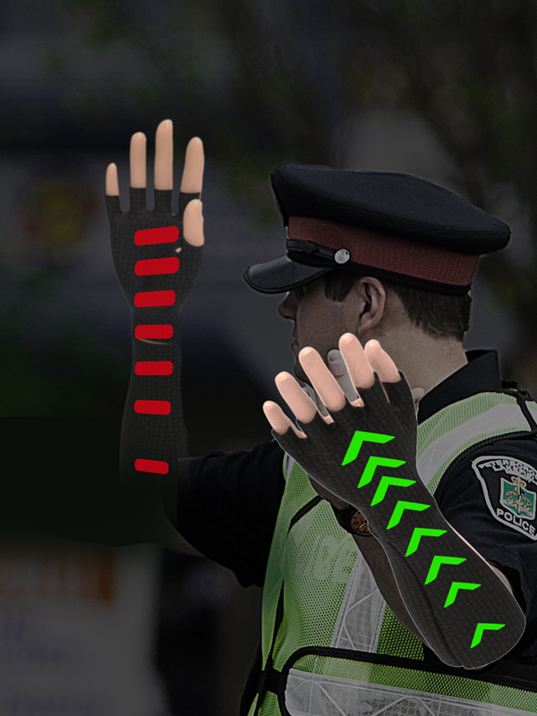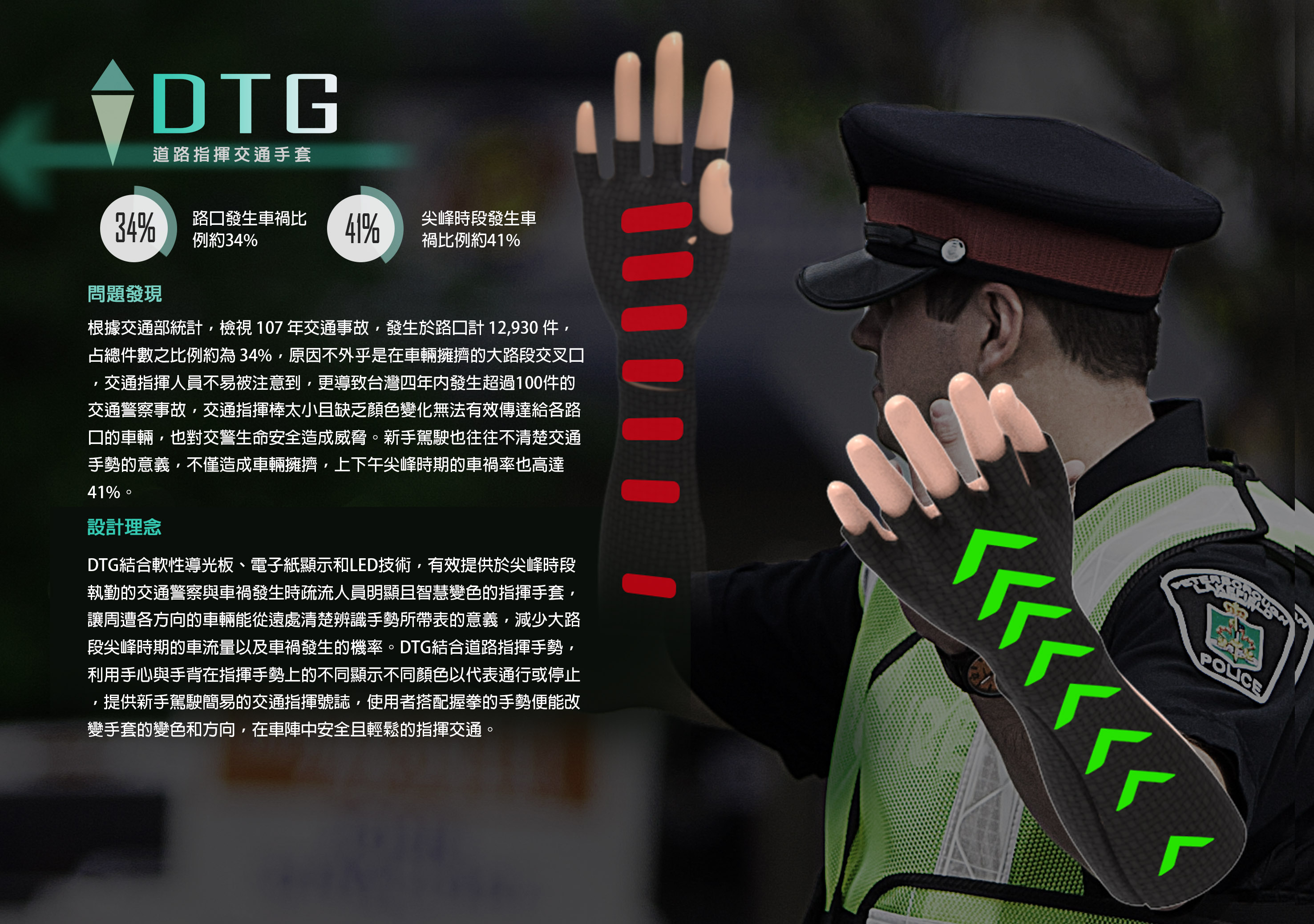 DTG結合軟性導光板、電子紙顯示和LED技術,有效提供於尖峰時段執勤的交通警察與車禍發生時疏流人員明顯且智慧變色的指揮手套,讓周遭各方向的車輛能從遠處清楚辨識手勢所帶表的意義,減少大路段尖峰時期的車流量以及車禍發生的機率。