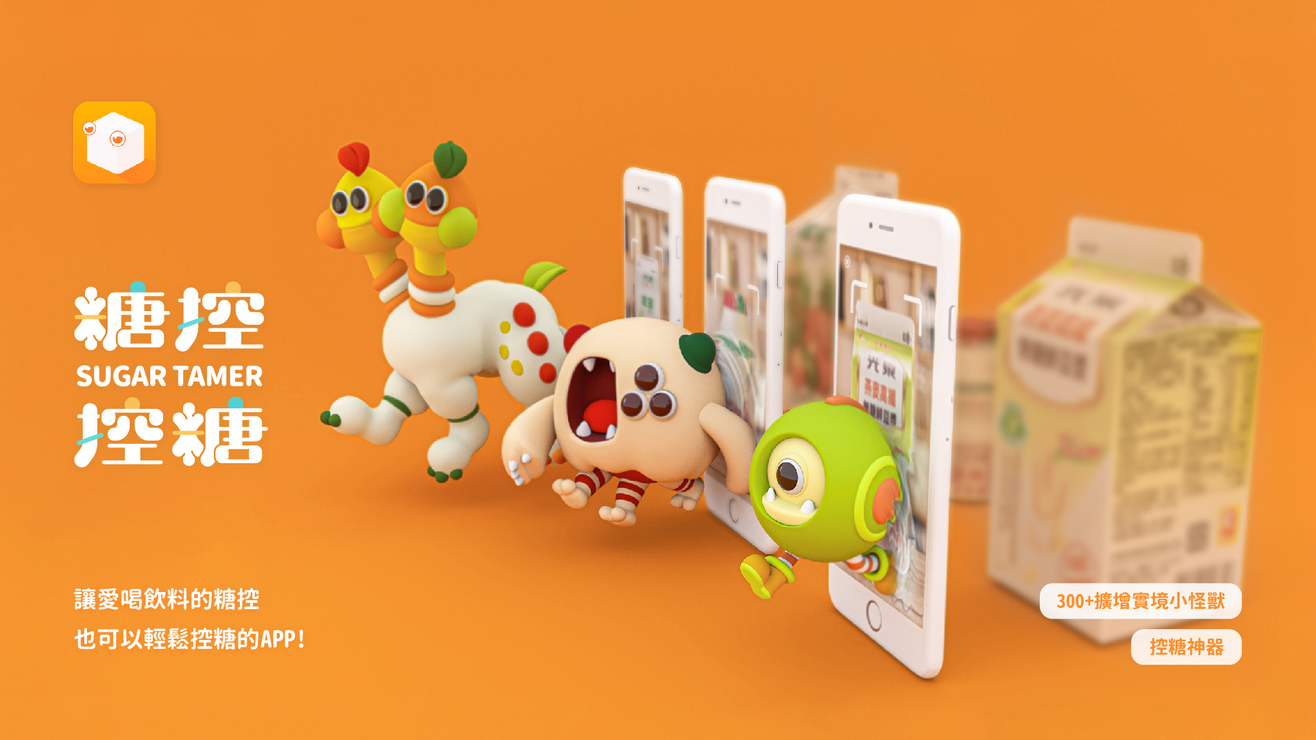 在人手一瓶飲料的時代,「糖控控糖」打破控制糖量的繁瑣無聊,為每一種飲料創建專屬3D角色,掃描瓶身便能藉由AR互動輕鬆獲取糖量資訊,APP設有客製化每日糖量攝取上限、階段性達標獎勵、圖鑑以及記錄功能,讓大眾在樂趣中輕鬆培養控糖好習慣。