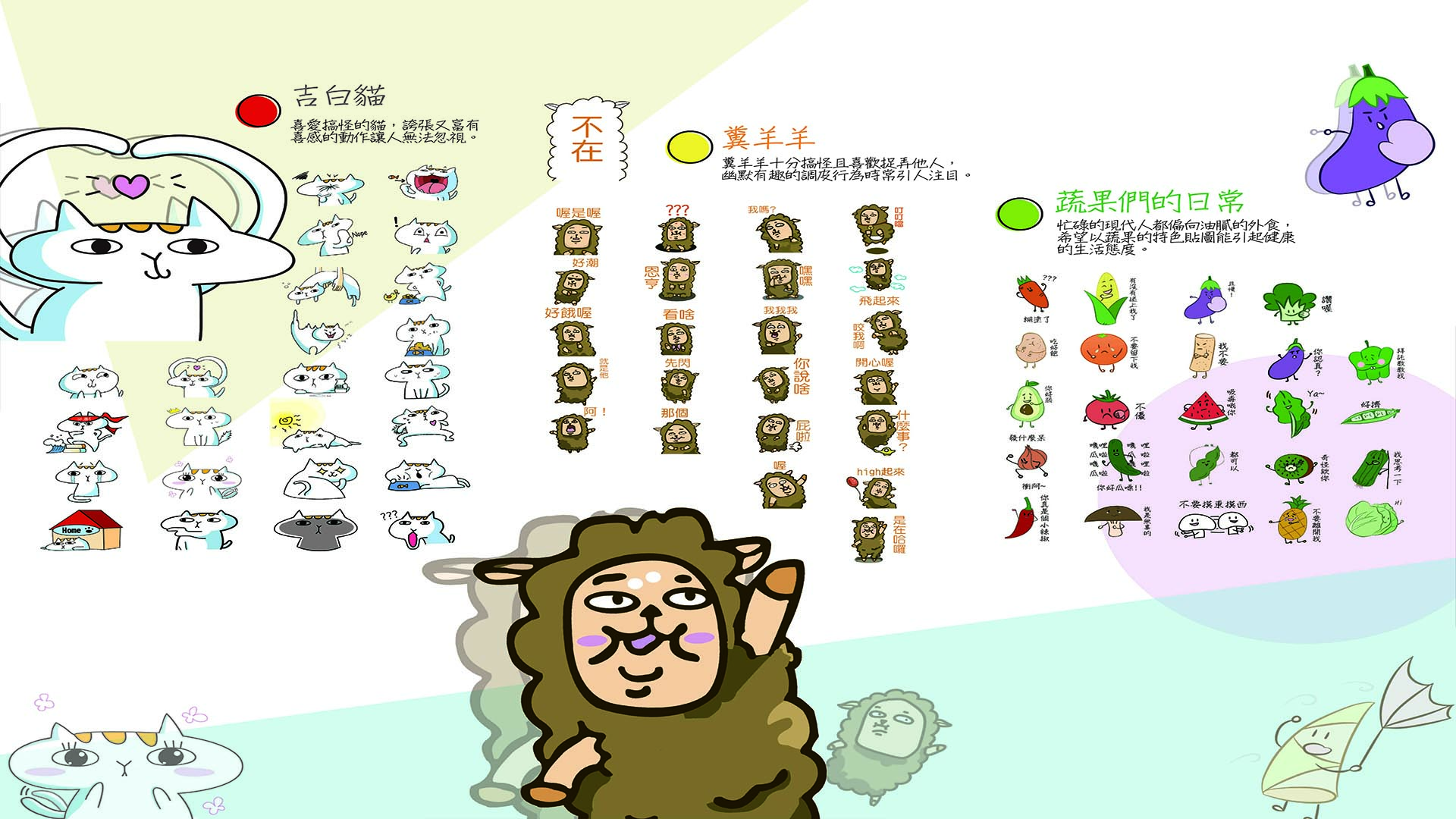 三款貼圖分別為吉白貓、蔬果們的日常、糞羊羊。