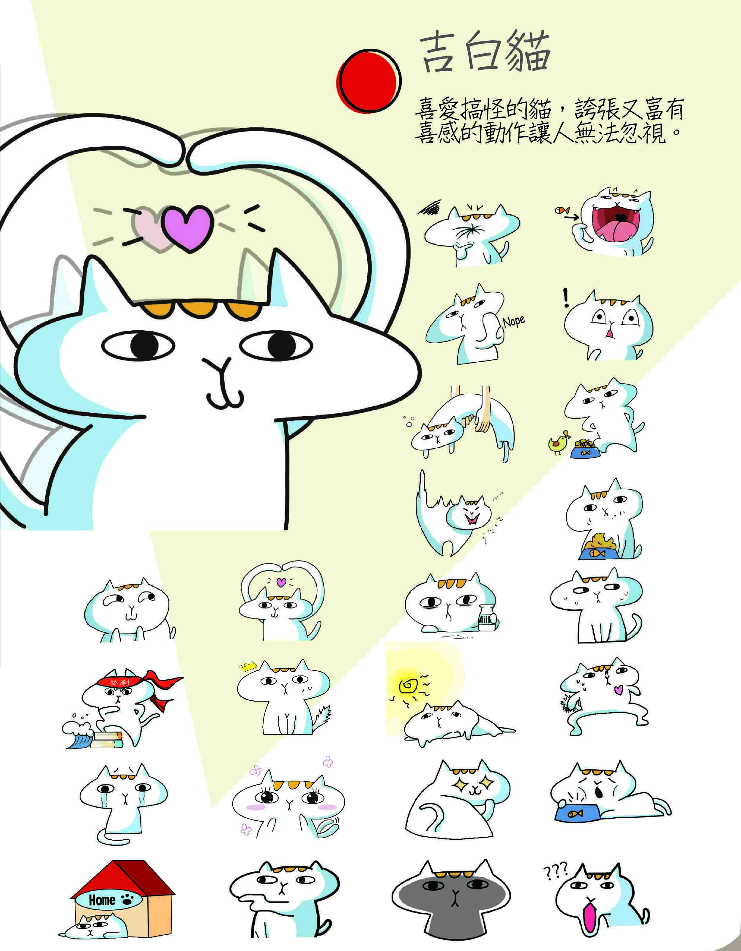 吉白貓:吉白貓是一隻喜愛搞怪的白色貓咪,白色貓咪的頭上有著三條顯眼的橘色花紋,吉白貓善於使用誇張又富有喜感的動作表達自身的情緒。