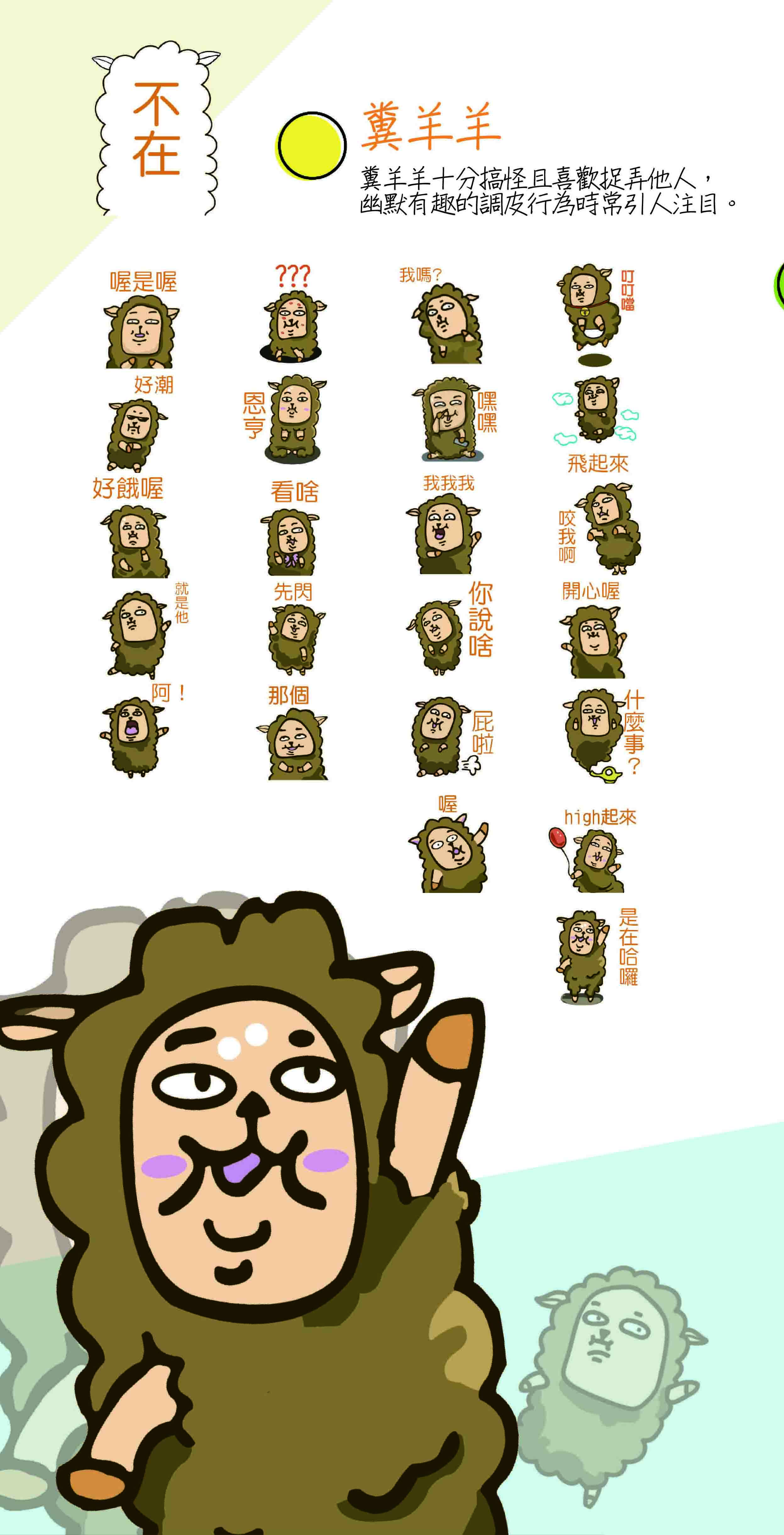 糞羊羊:糞羊羊是一隻深褐色毛皮的羊,個性十分搞怪且喜歡捉弄他人,幽默有趣的調皮行為總能逗人開心。