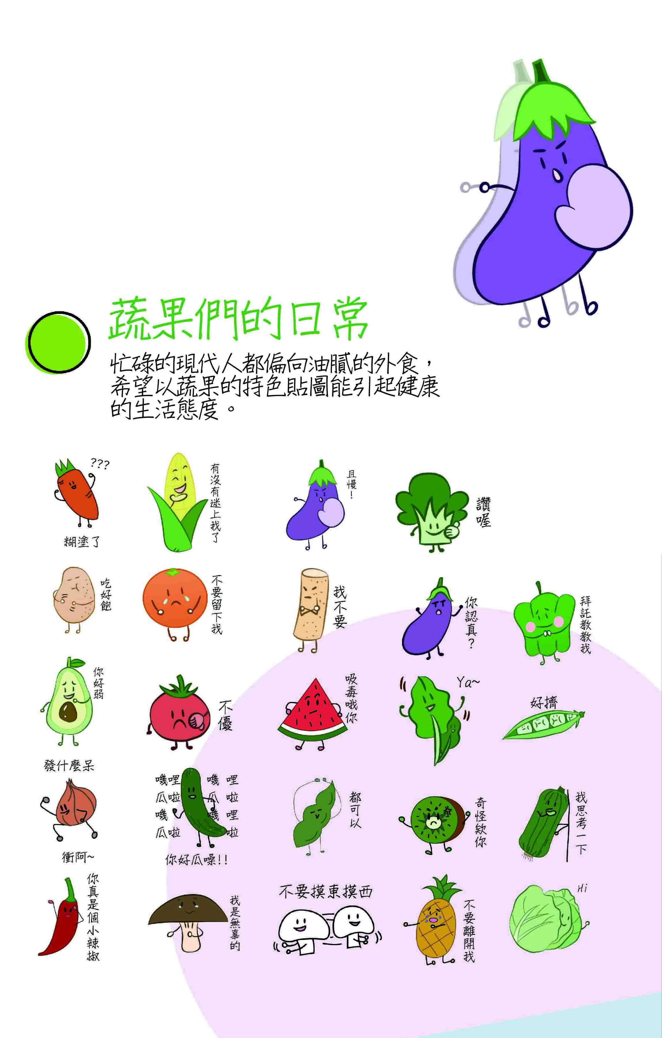 蔬果們的日常:各式各樣的蔬菜生活的日常為主,希望以蔬菜為代表傳達養生及關心的特色貼圖能引起人們健康生活的態度。