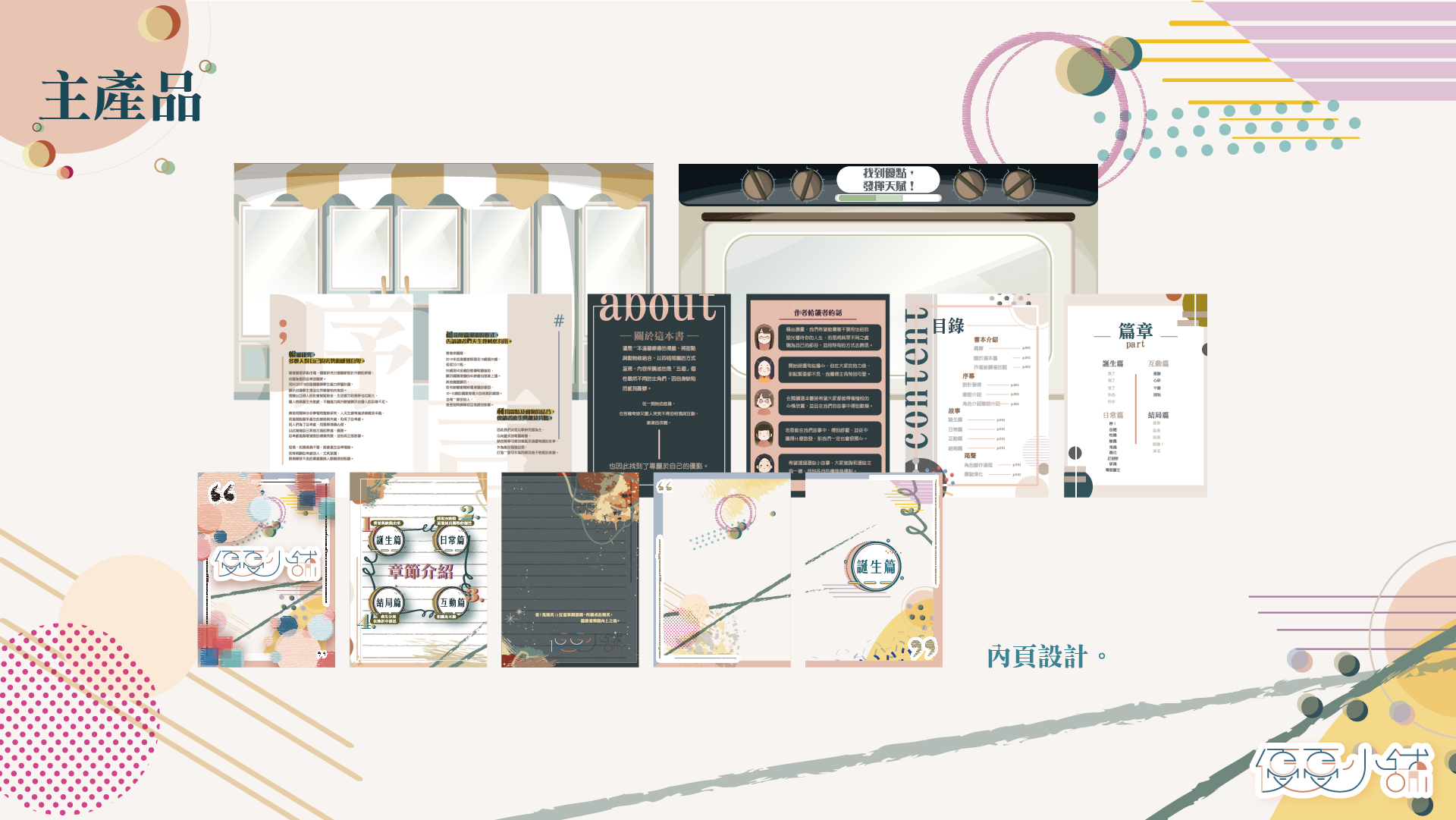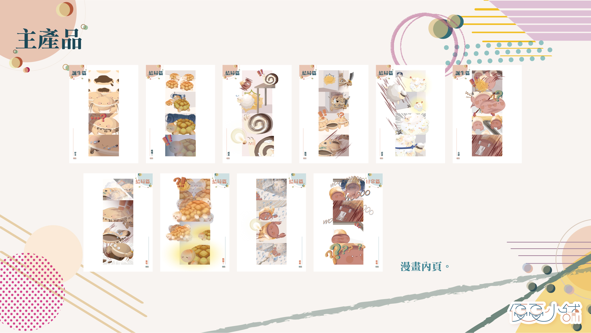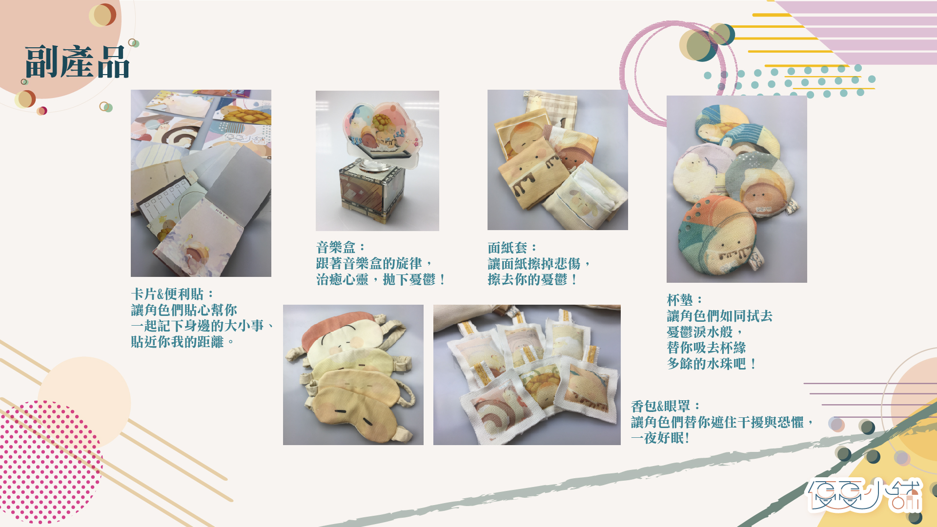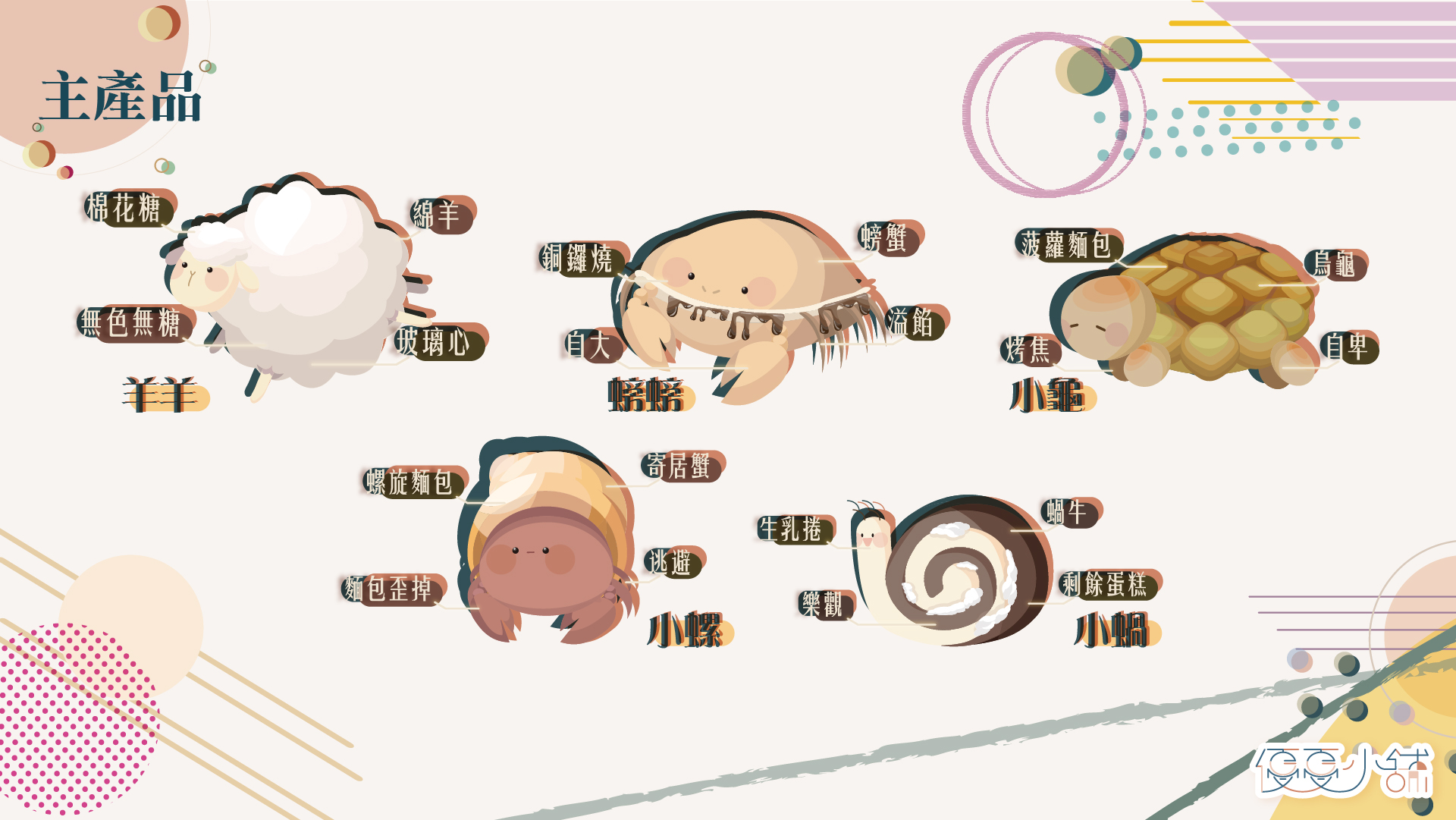 我們作品「優憂小舖」的故事背景為五隻在「甜點舖」誕生的「西點角色」們,每個角色都擁有一些小缺陷。這些NG商品因賣相不佳、導致無法銷售的點心們,在甜點舖中彼此互助,因此名稱後兩字取為「小舖」。