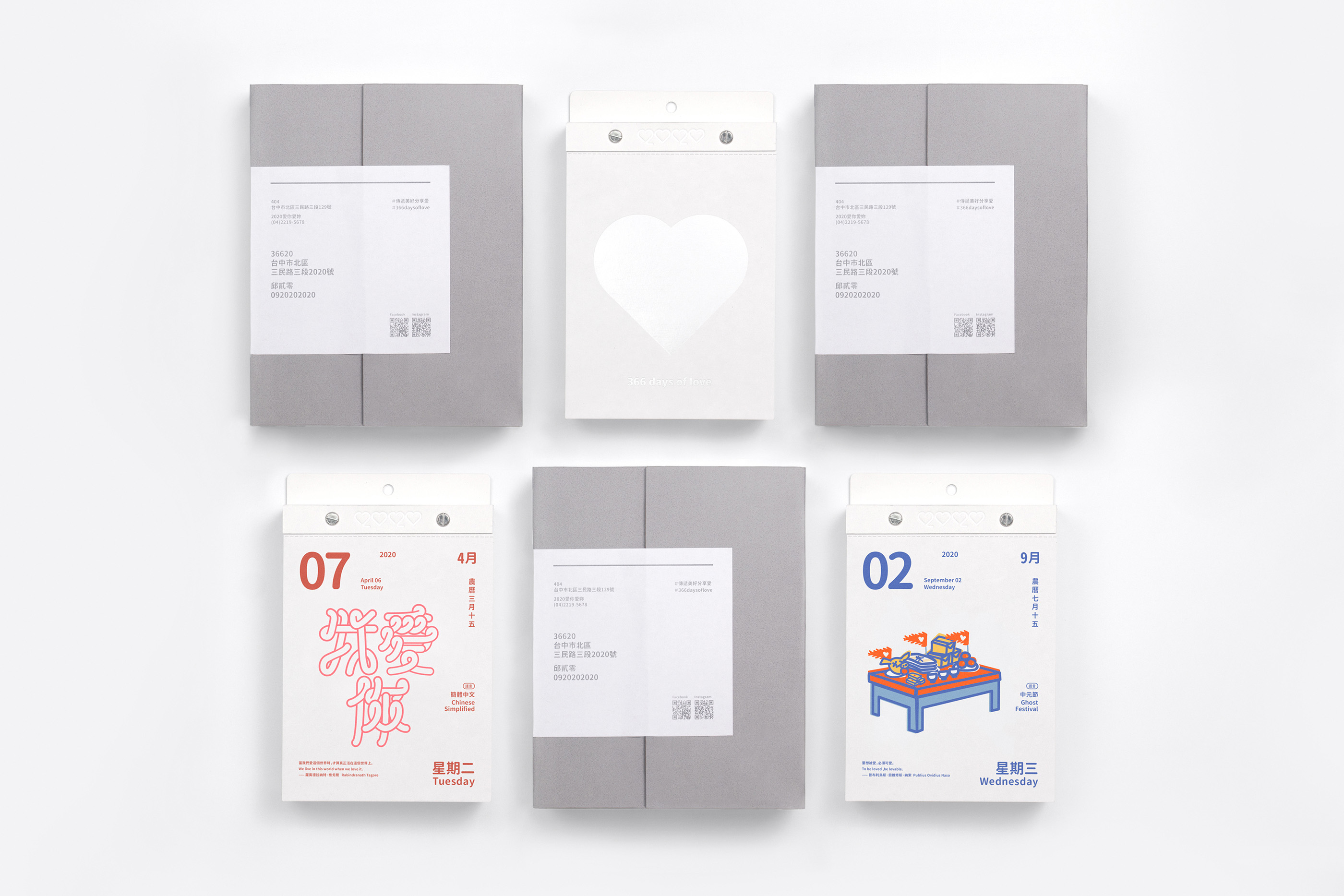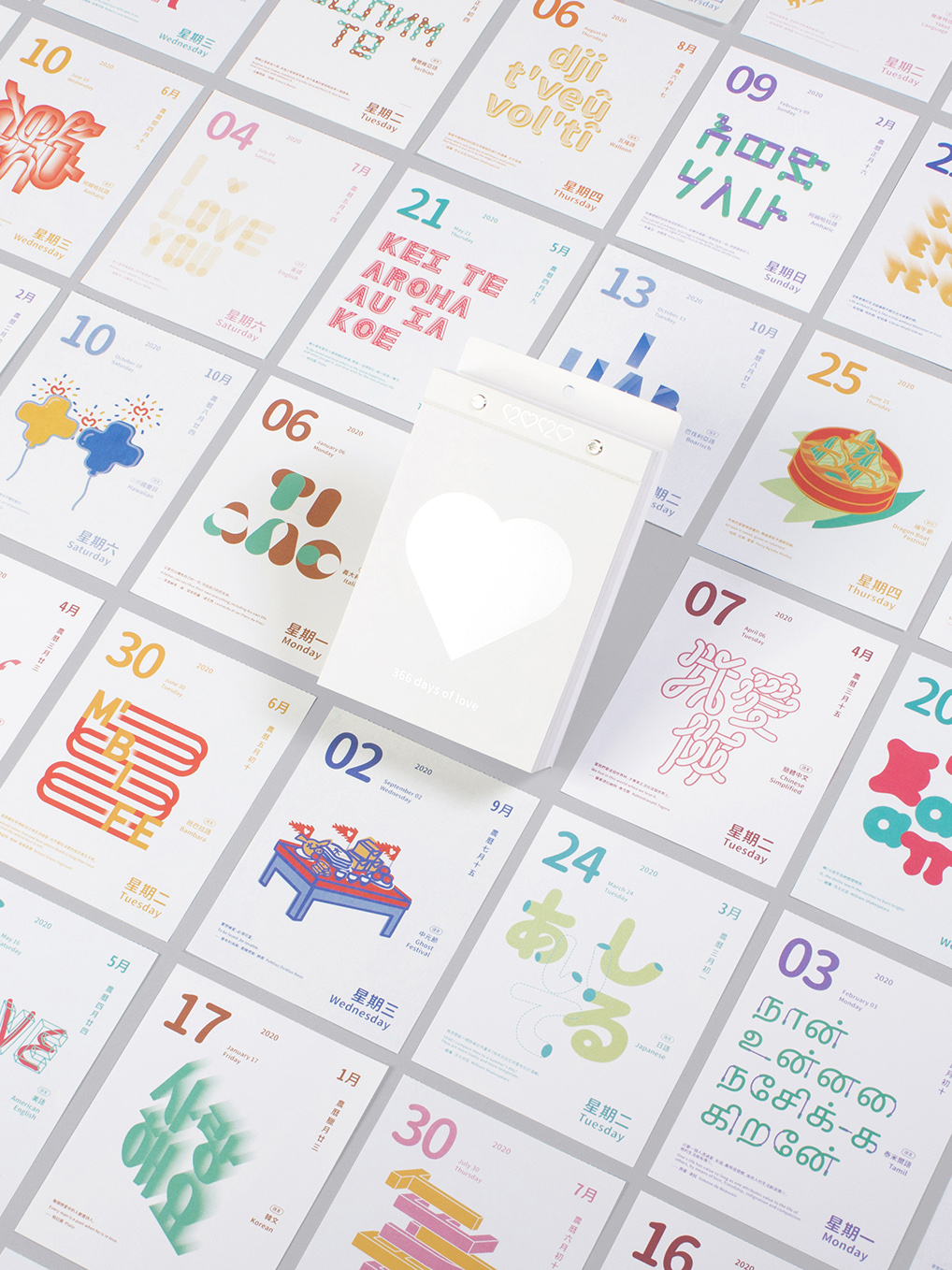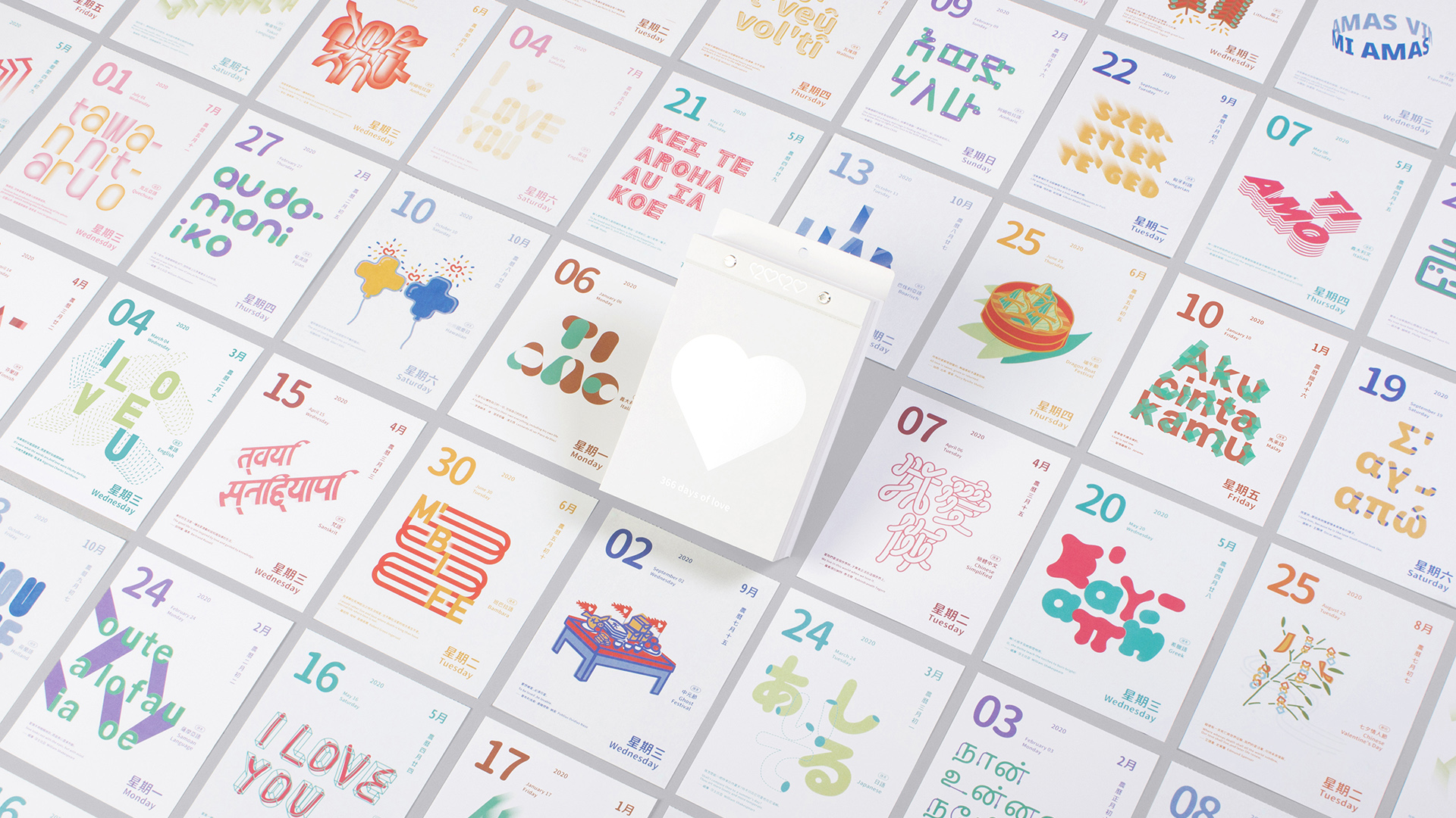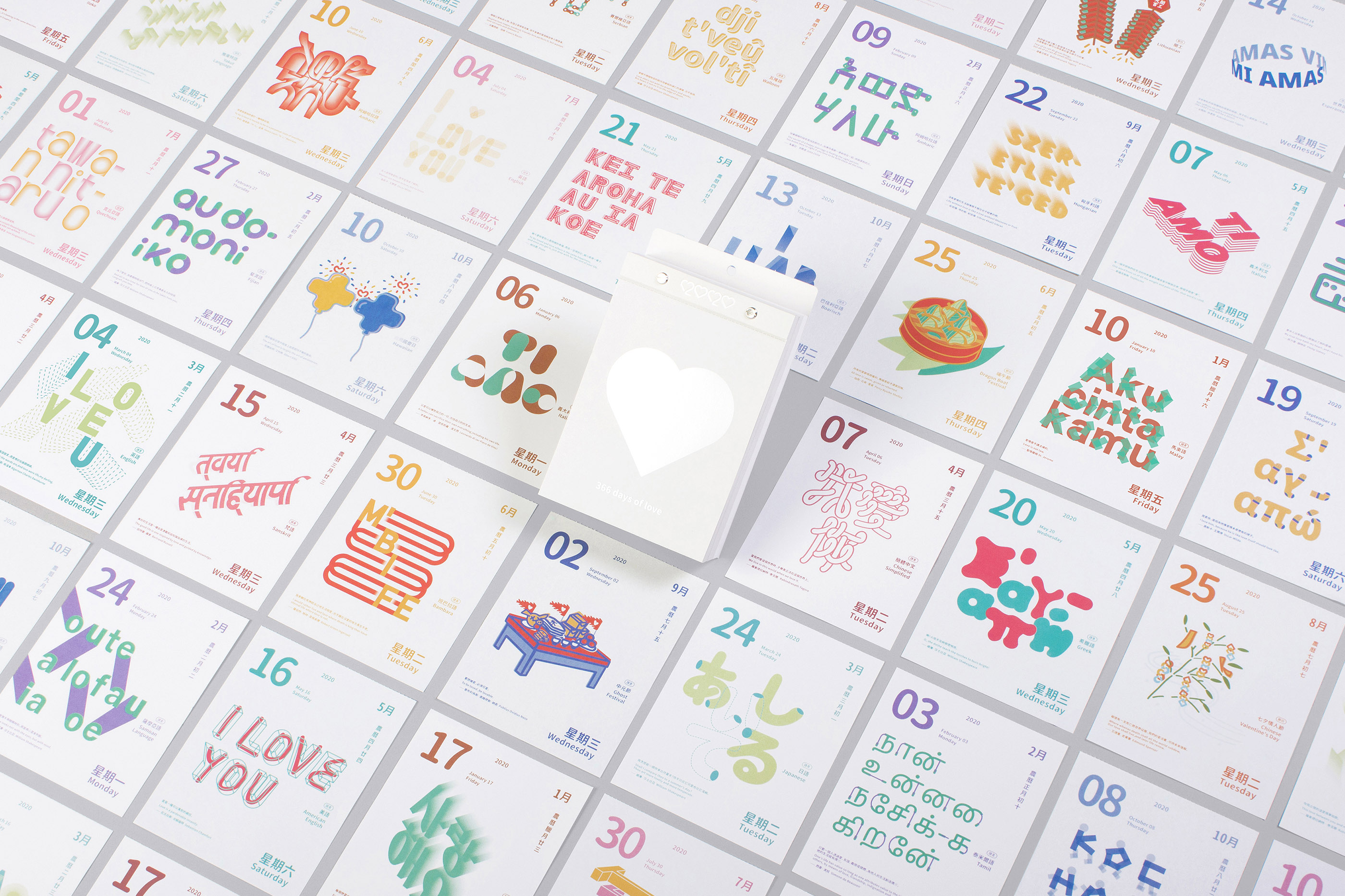 2020愛你愛妳日曆是一本使用122種語言的我愛你,以340種文字造型與26種節日插畫來表達我愛妳的日曆,並在日曆下方會有一段愛的小語,傳遞愛的含義,希望人們透過這樣的文字可以更貼近生活的感受,將日曆摺成愛心形狀的方式,鼓勵人們在生活中勇於分享以及傳遞對他人的「我愛你」,藉由2020愛你愛妳日曆的設計加深人們對愛的感受與溫度。