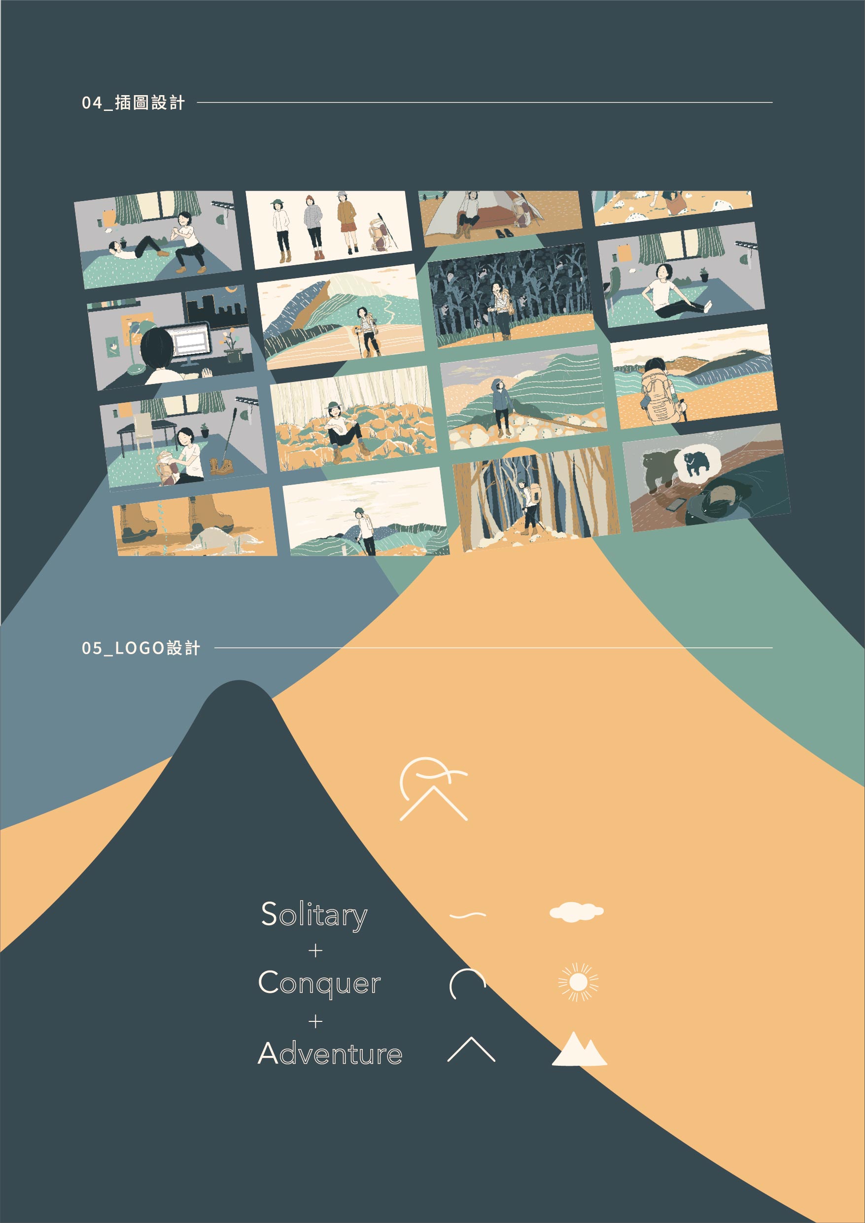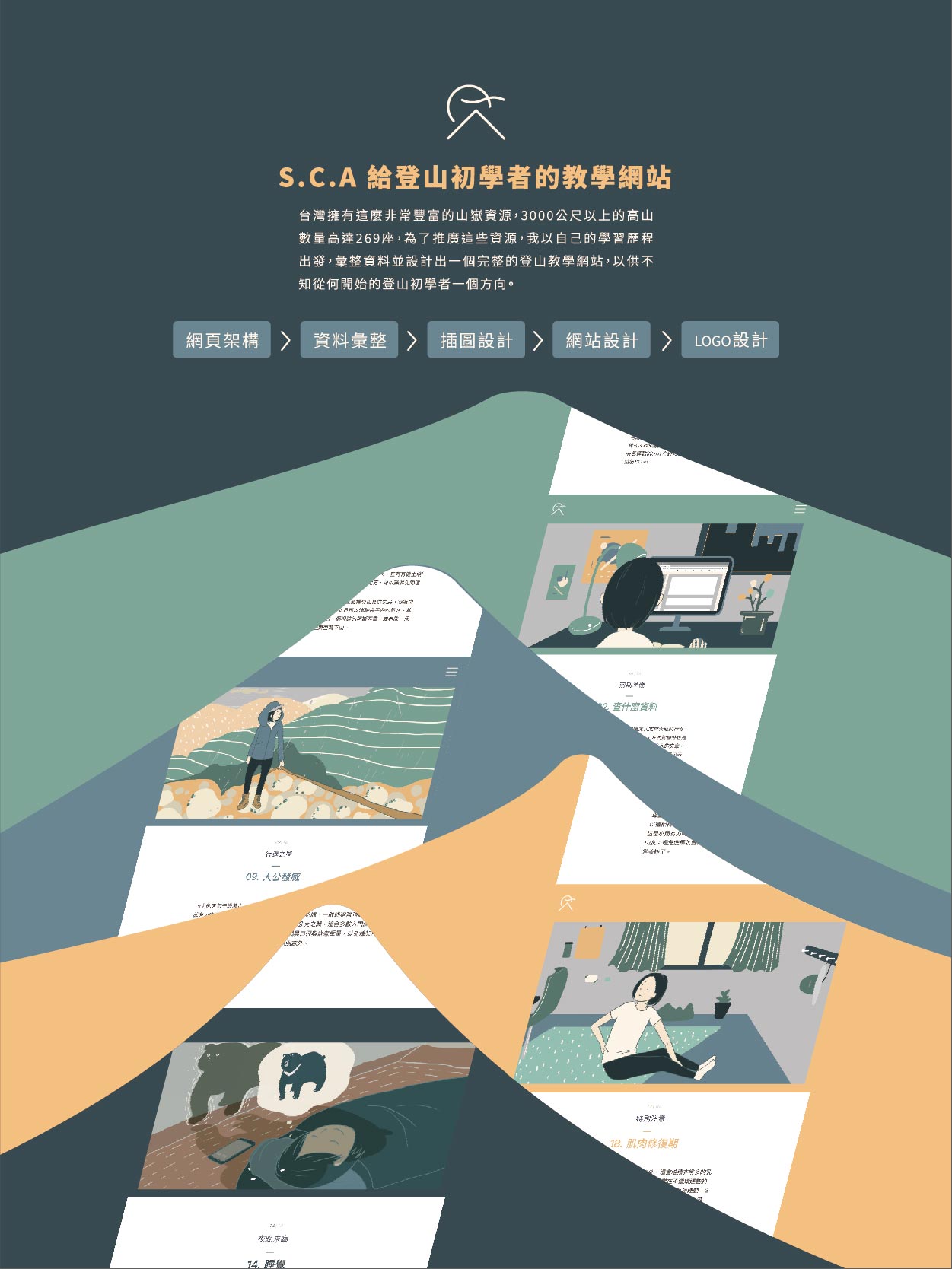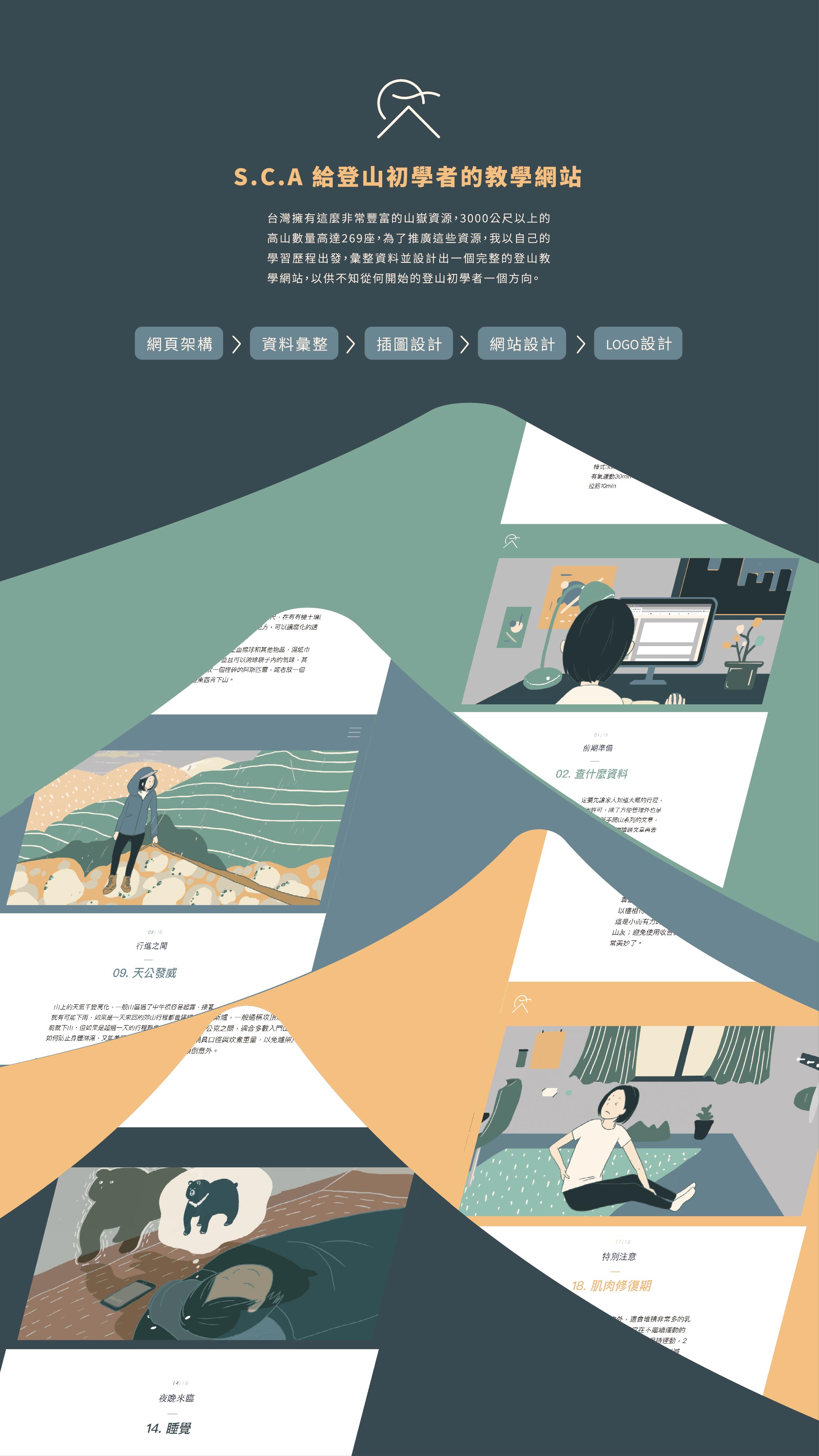 S.C.A分別是Solitary(獨自的), Conquer(克服), Adventure(冒險)是我對於登高山這件事的註解。本作品是一個登山入門網站,顧名思義是讓想踏入登山世界的初學者看的網站。台灣超過3000公尺以上的山高達269座,但鮮少人知道;「在山上毫無紛擾,唯一目標就是往上爬時,你的感官會放大到極限,那時候你才能好好感受自己。」此後我開始嚮往登山。對於登山也是初學者的我,想以初學者的角度出發,蒐集資料、實際行動,做出讓初學者一目了然的登山網站。