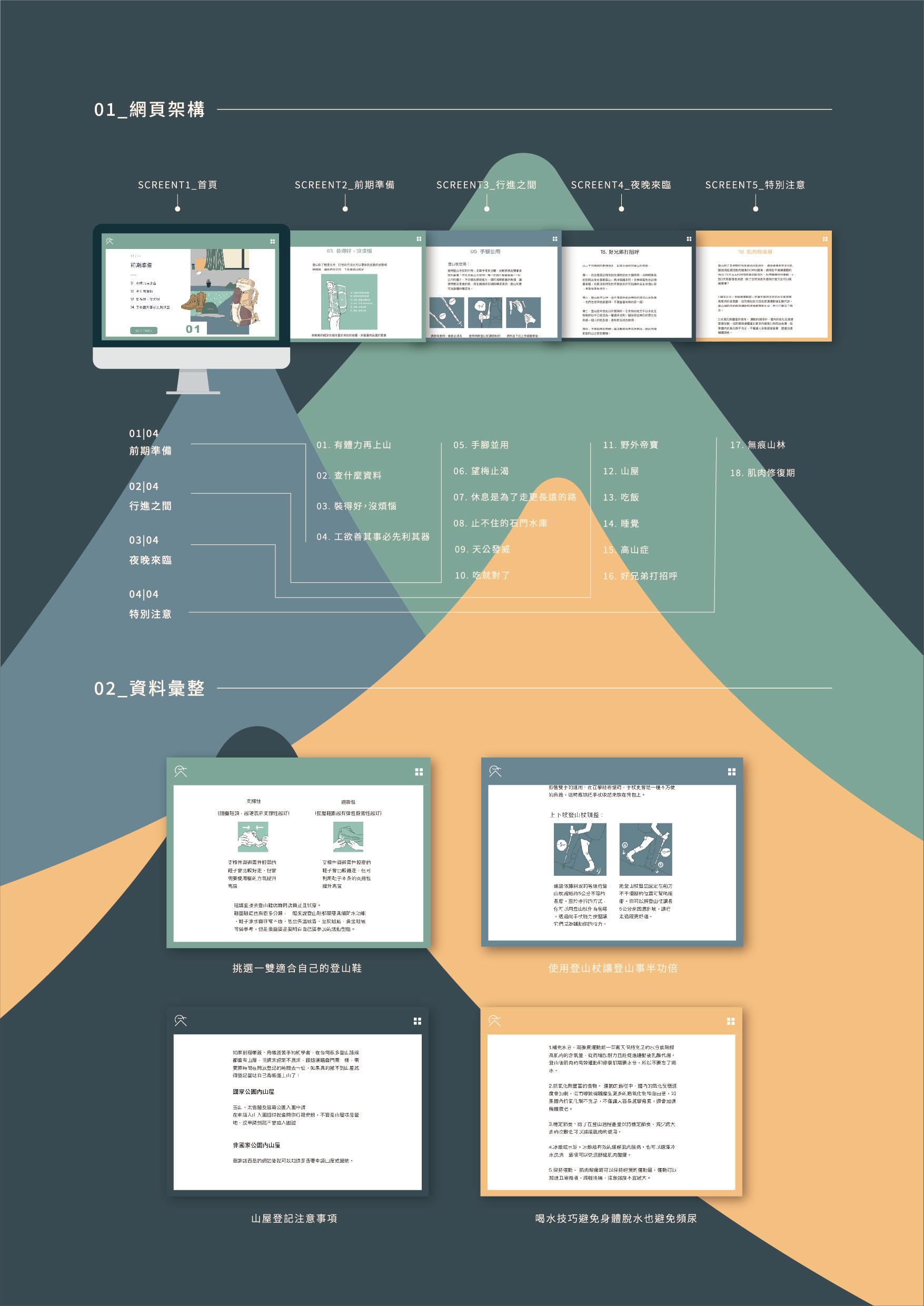 網站以四個主題來延伸,分別是1.前期規劃2.行進之間3.夜晚來臨4.特別注意。我以實際登山行程去規劃順序,讓讀者可以跟隨網站內容想像實際爬山的狀態。
