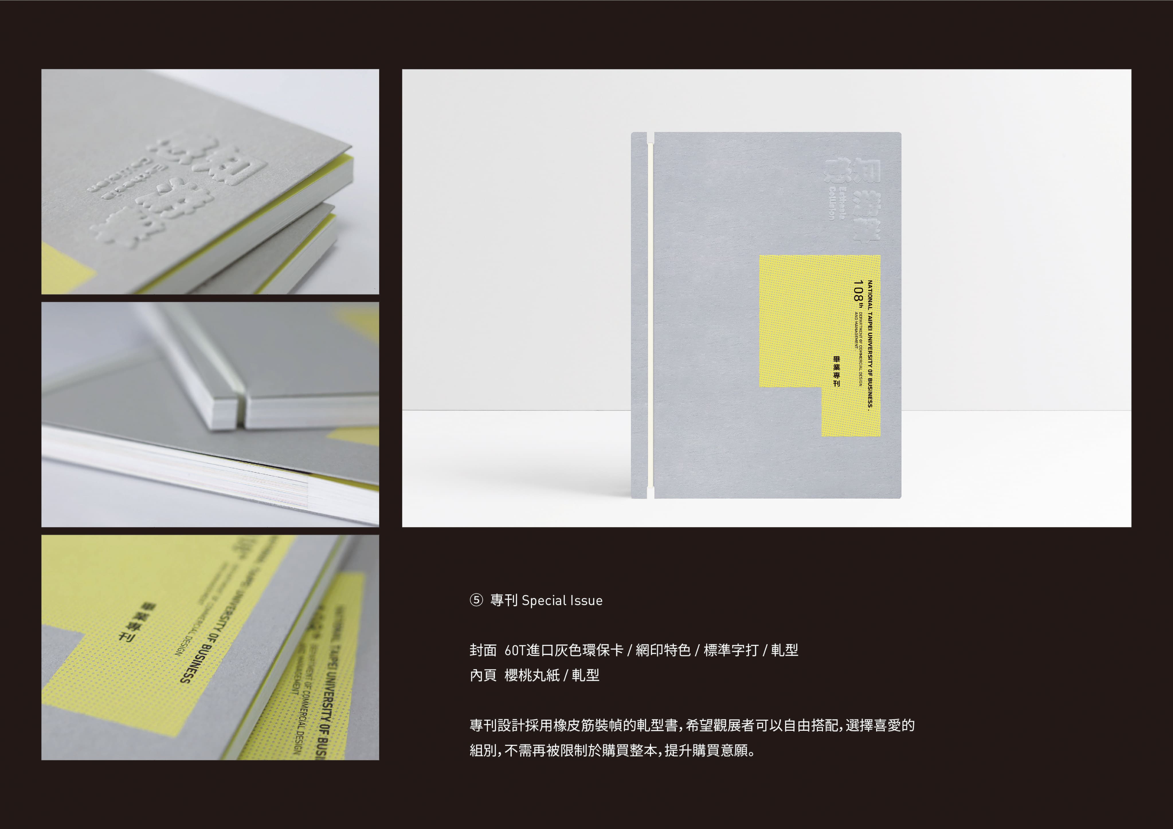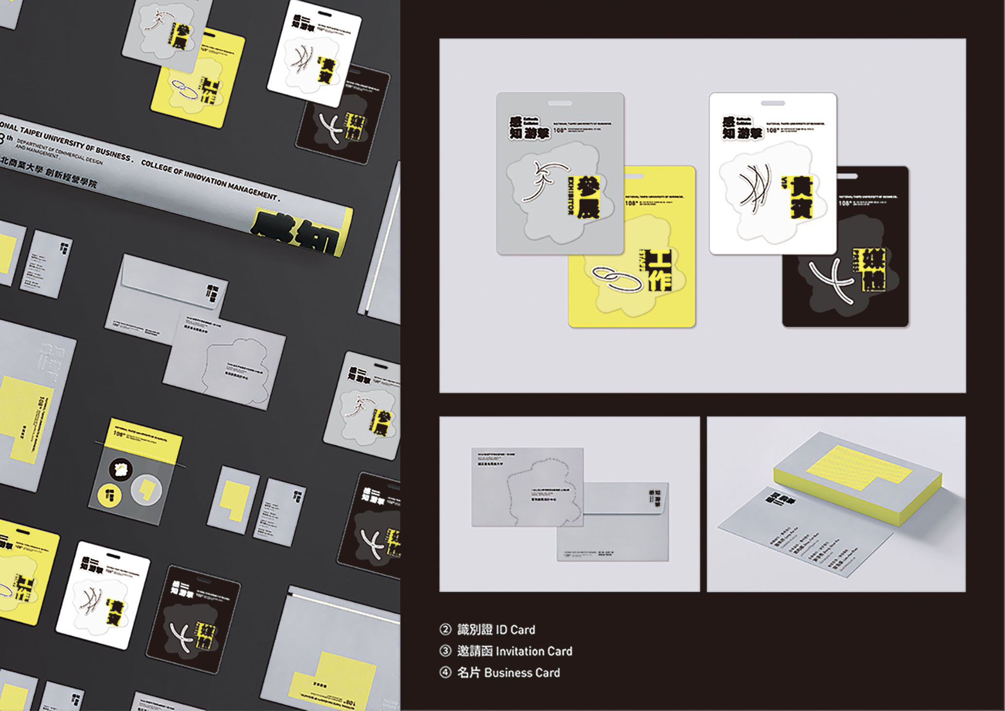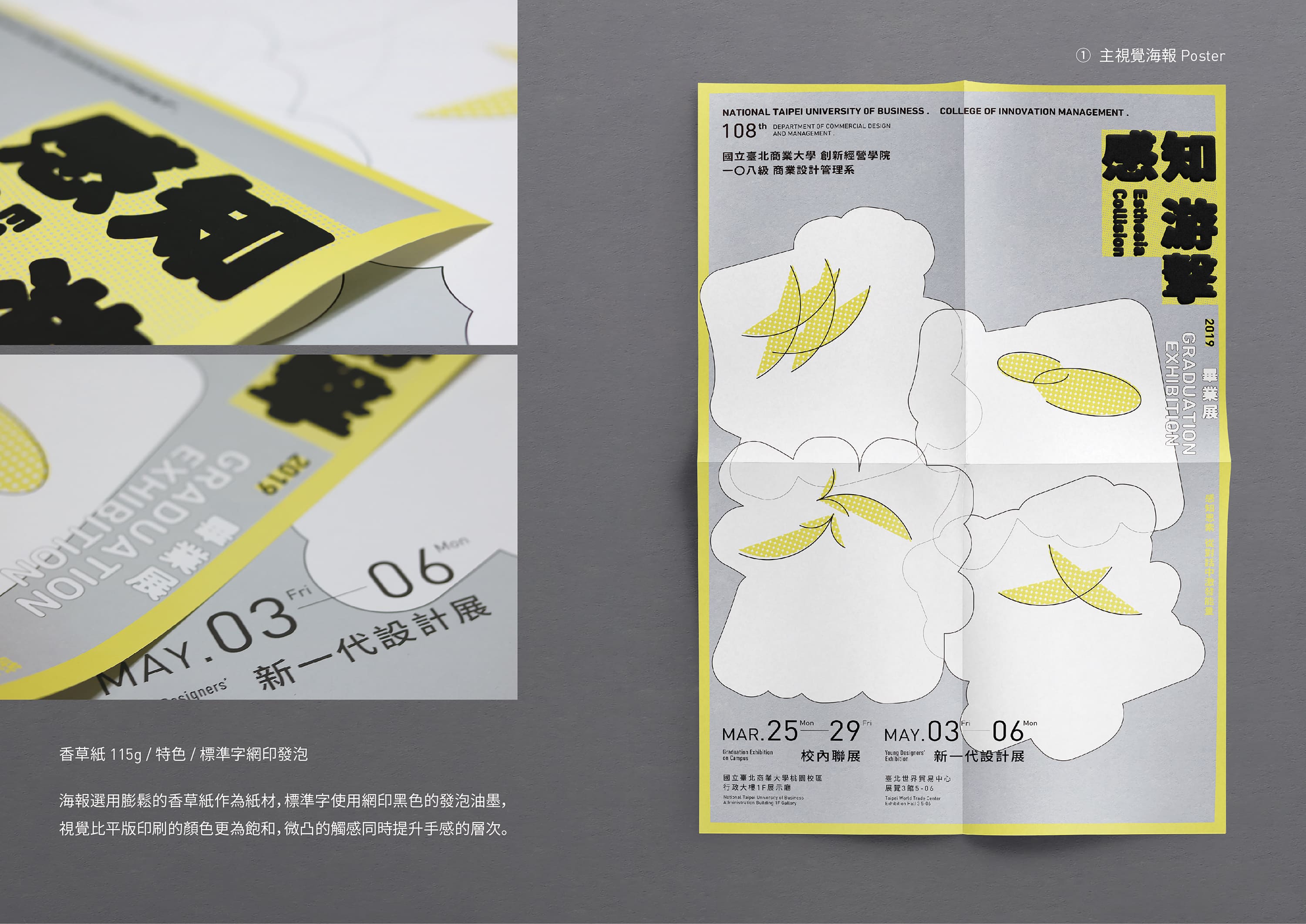 海報選用膨鬆的香草紙作為紙材,標準字使用網印黑色的發泡油墨,視覺比平版印刷的顏色更為飽和,微凸的觸感同時提升手感的層次。識別證跳脫以往平面的形式, 以插卡式泡殼使之立體化來呈現, 並在裡面加入小組元素, 可以在框框裡自由活動, 象徵人與人之間的互動, 也呼應主題裡對話的概念。