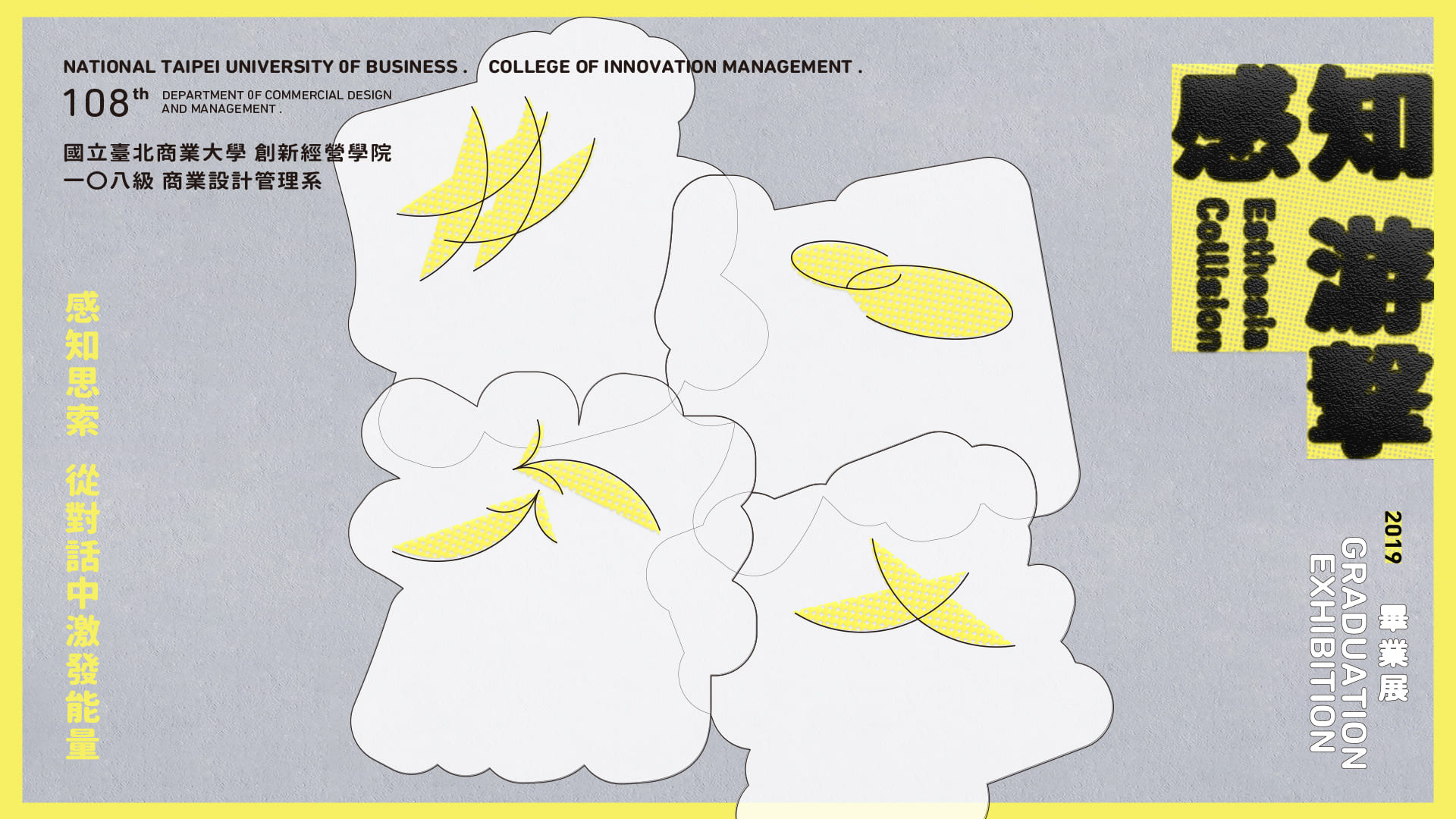 主視覺概念取自對話,以主題漢字堆疊而成的對話框為主要圖形, 也藉灰色與白色,象徵在溝通的模糊灰色地帶中,彼此最終找到一個折衷的溝通方式並且達成共識。