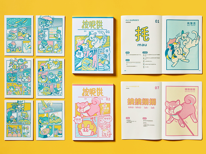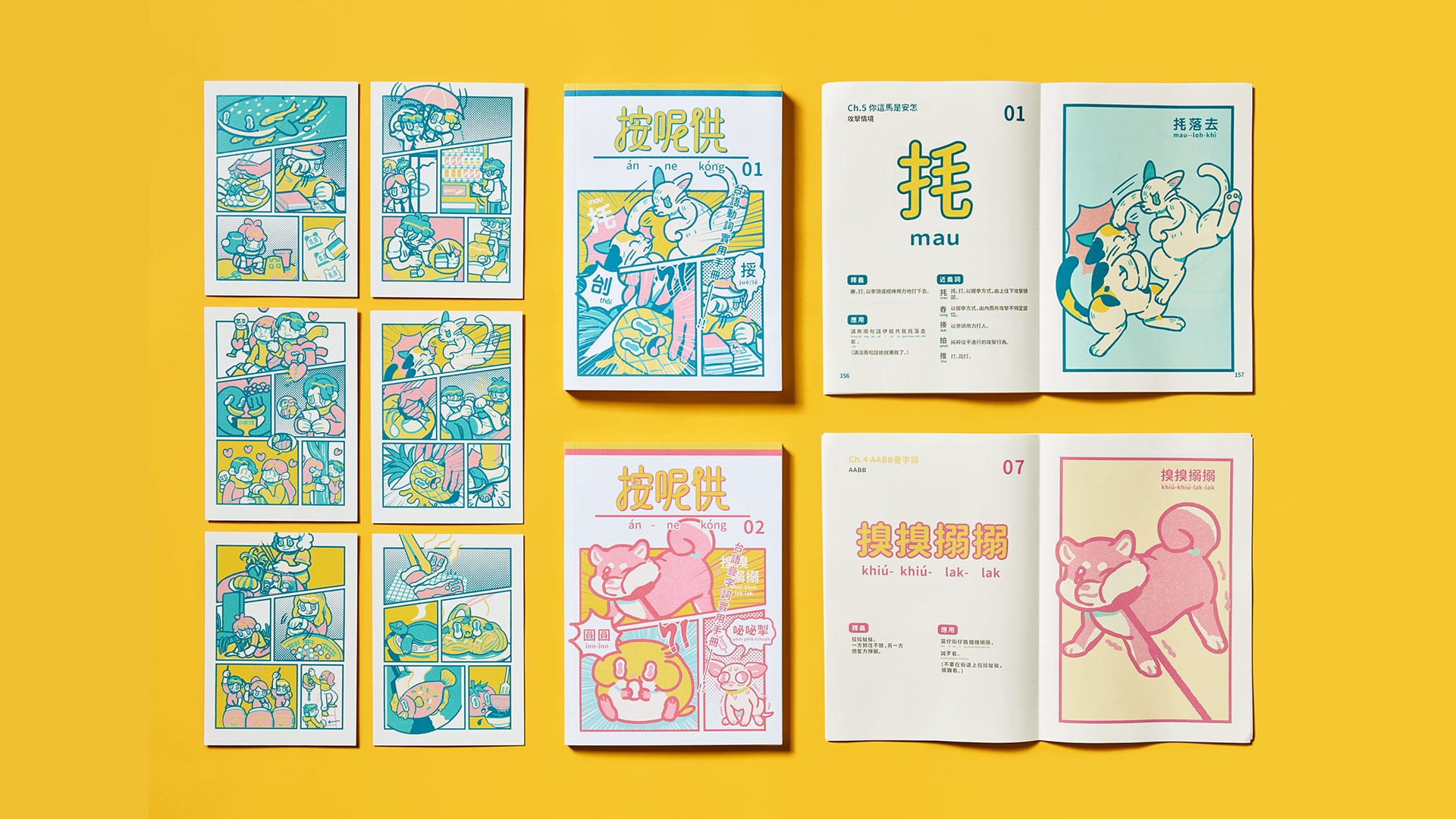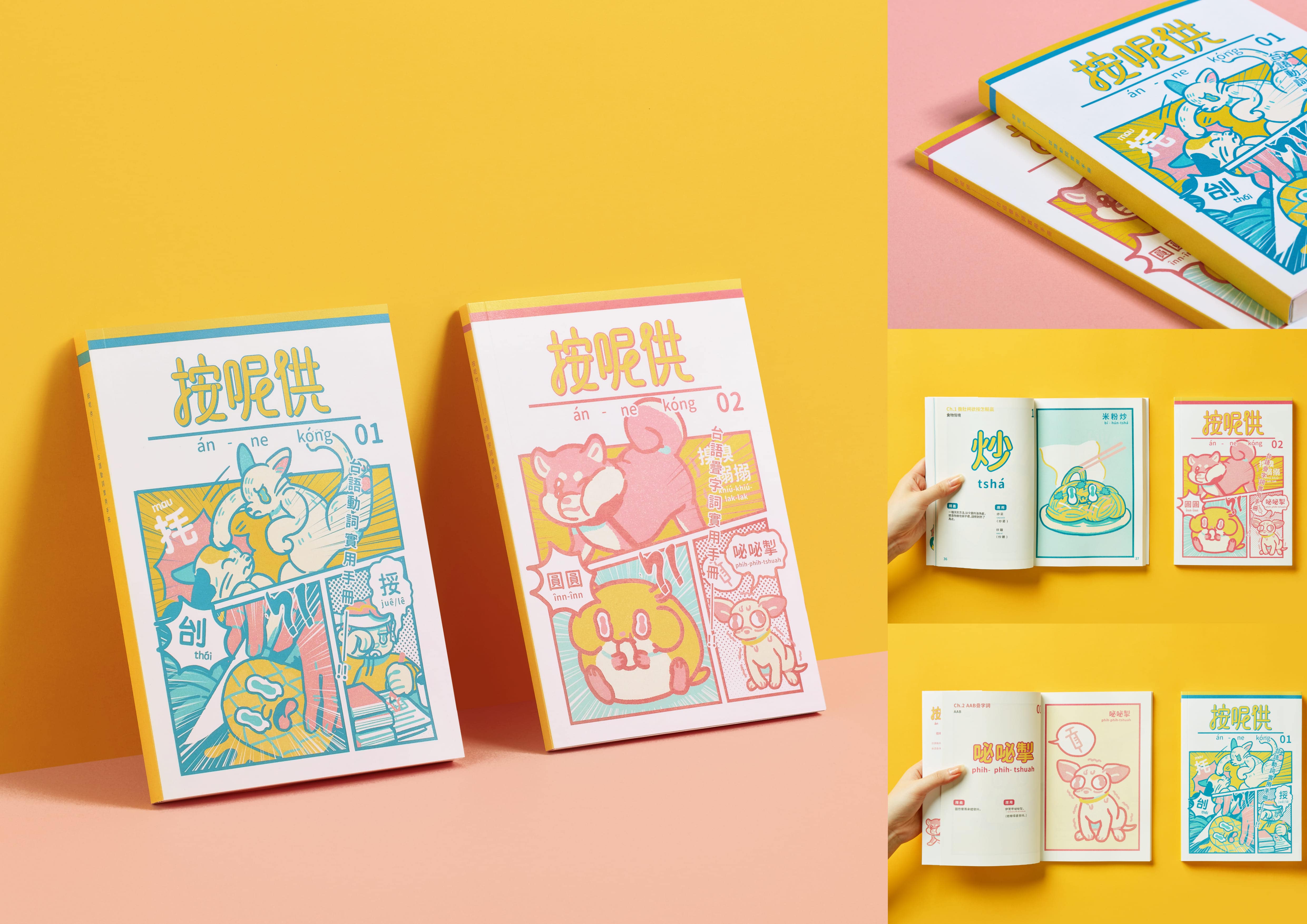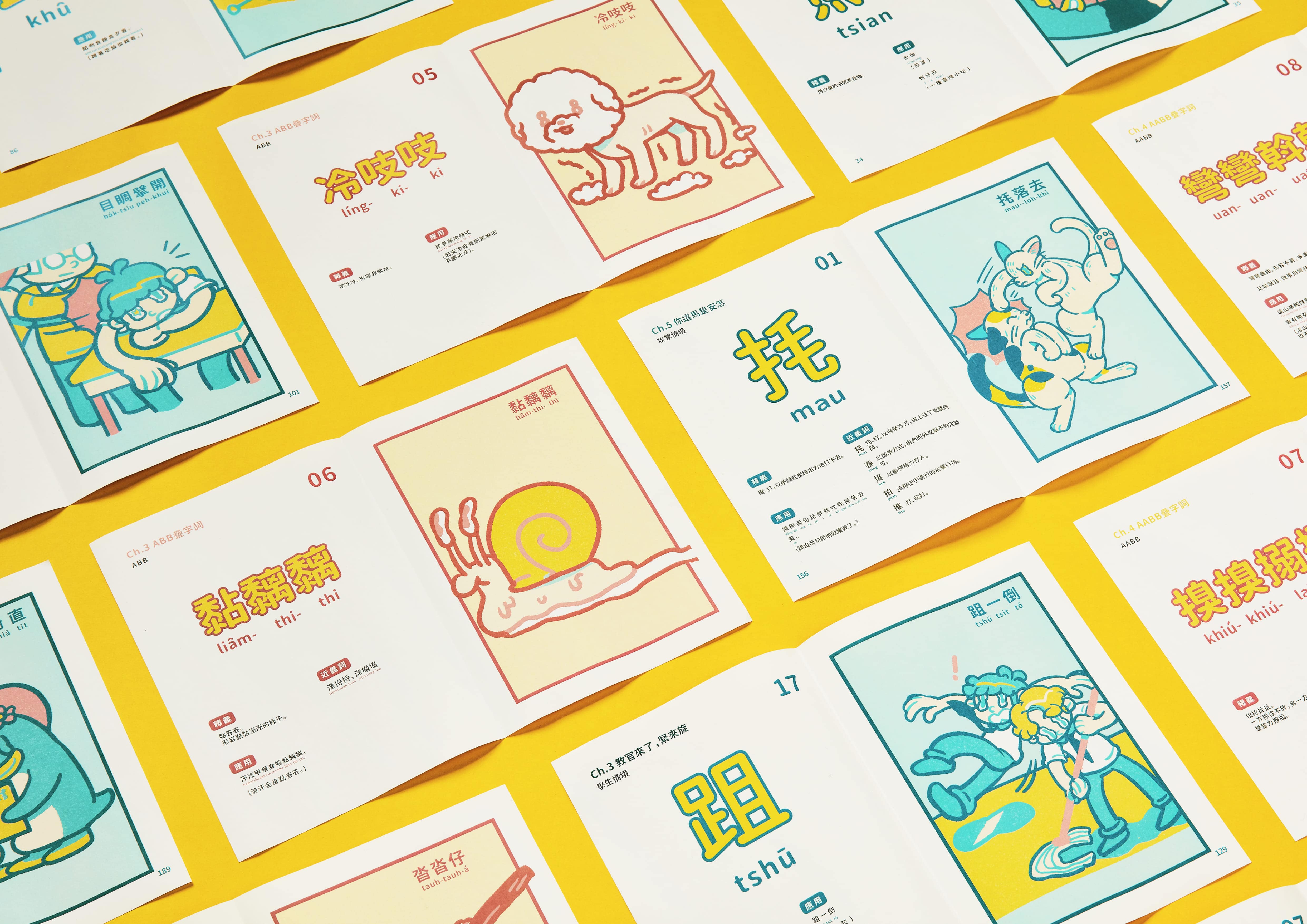 為了展現台語對事物狀態、行為描寫的細膩與豐富度,我們設計了一系列的台語實用手冊,並選擇「動詞」及「疊字詞」來做介紹,而在整體視覺風格上,我們採用了鮮豔的配色及活潑可愛的插圖風格,跳脫以往台語給人較古老、傳統的印象,希望能使大眾對台語有更進一步的了解並產生興趣,進而達到推廣台語文化的效果。