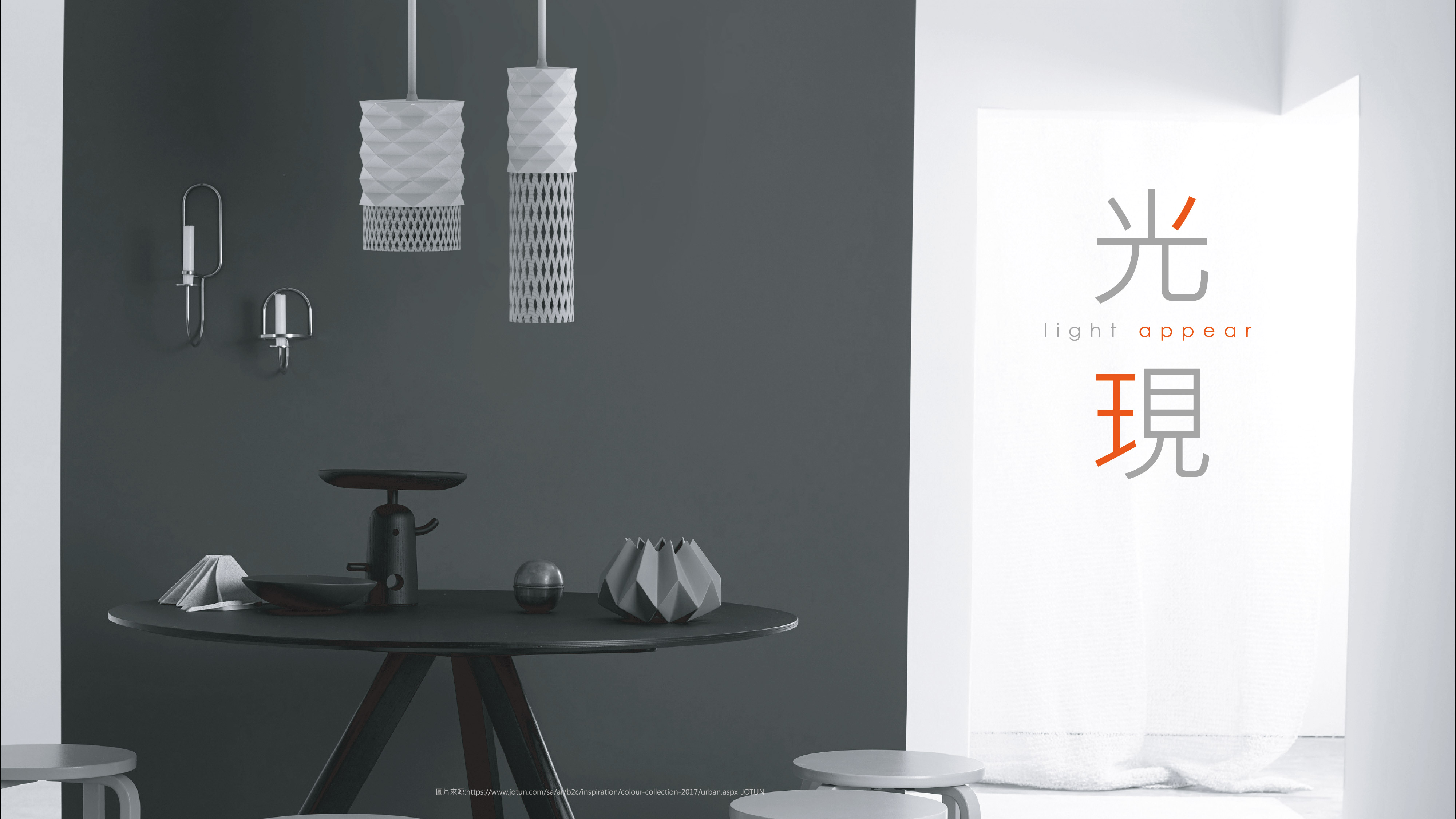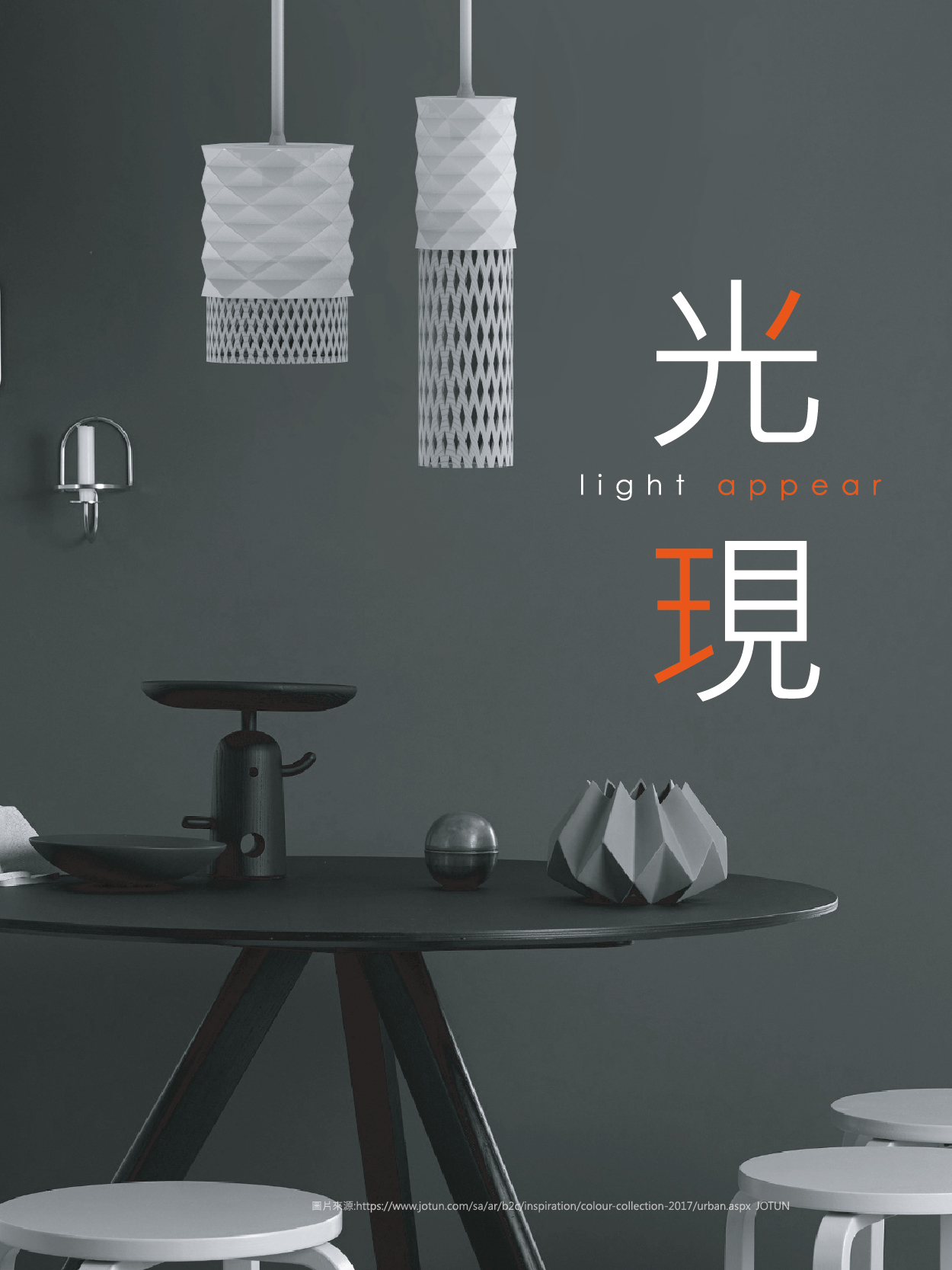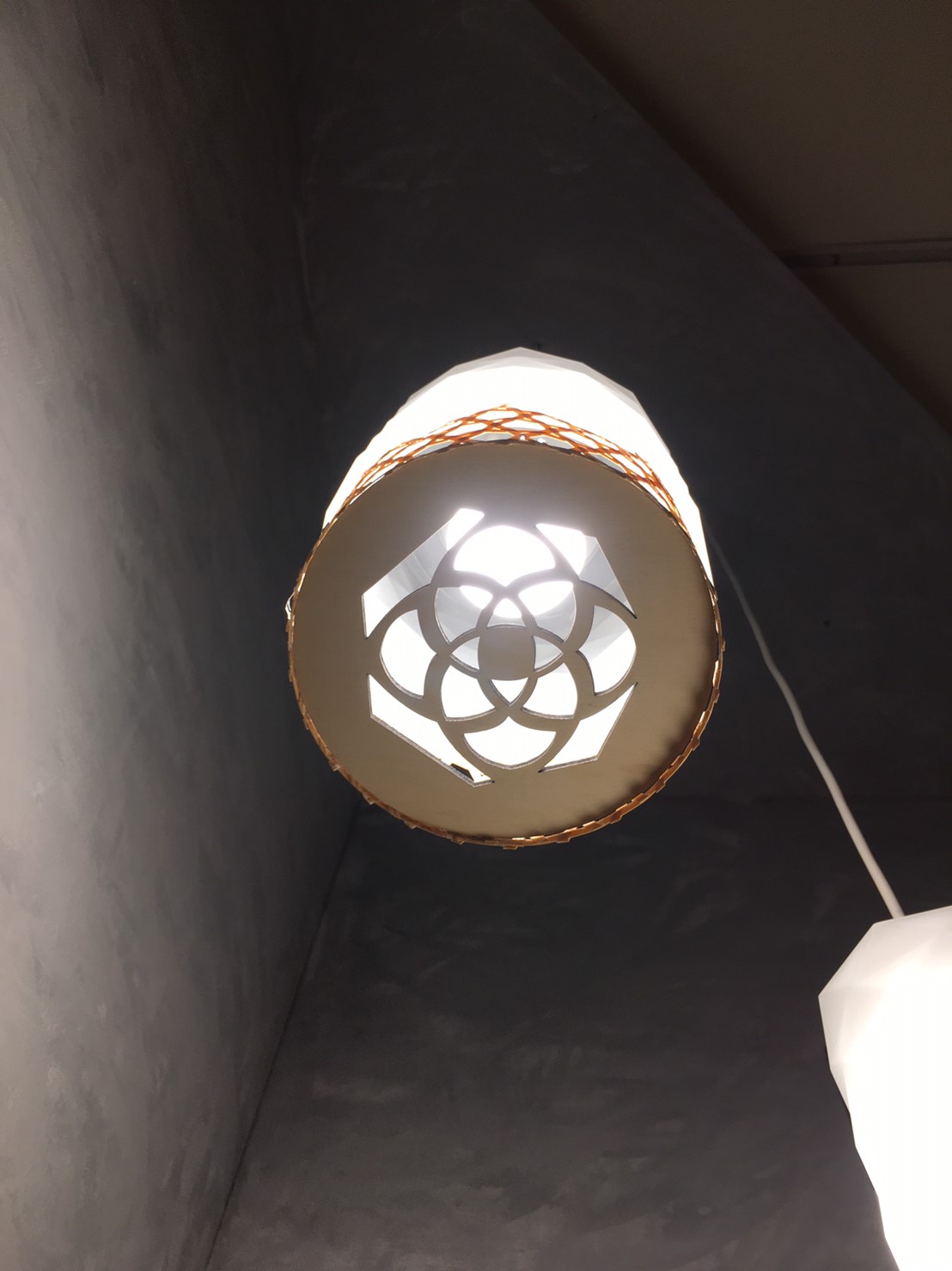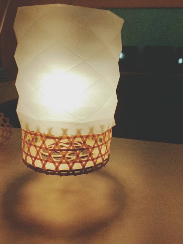 保留燈籠元素,並加入現代燈具特色,結合裝飾紋要件,讓光線與建築特色結合,為了使更多人能明白古蹟保留的重要性,才想出利用大稻埕的建築特色融入進燈具裡,下半部以竹編為主,內部裝置了一片具有建築特色的紋樣,使光打出來時可以投影出紋樣。使用材質:壓克力、竹編。