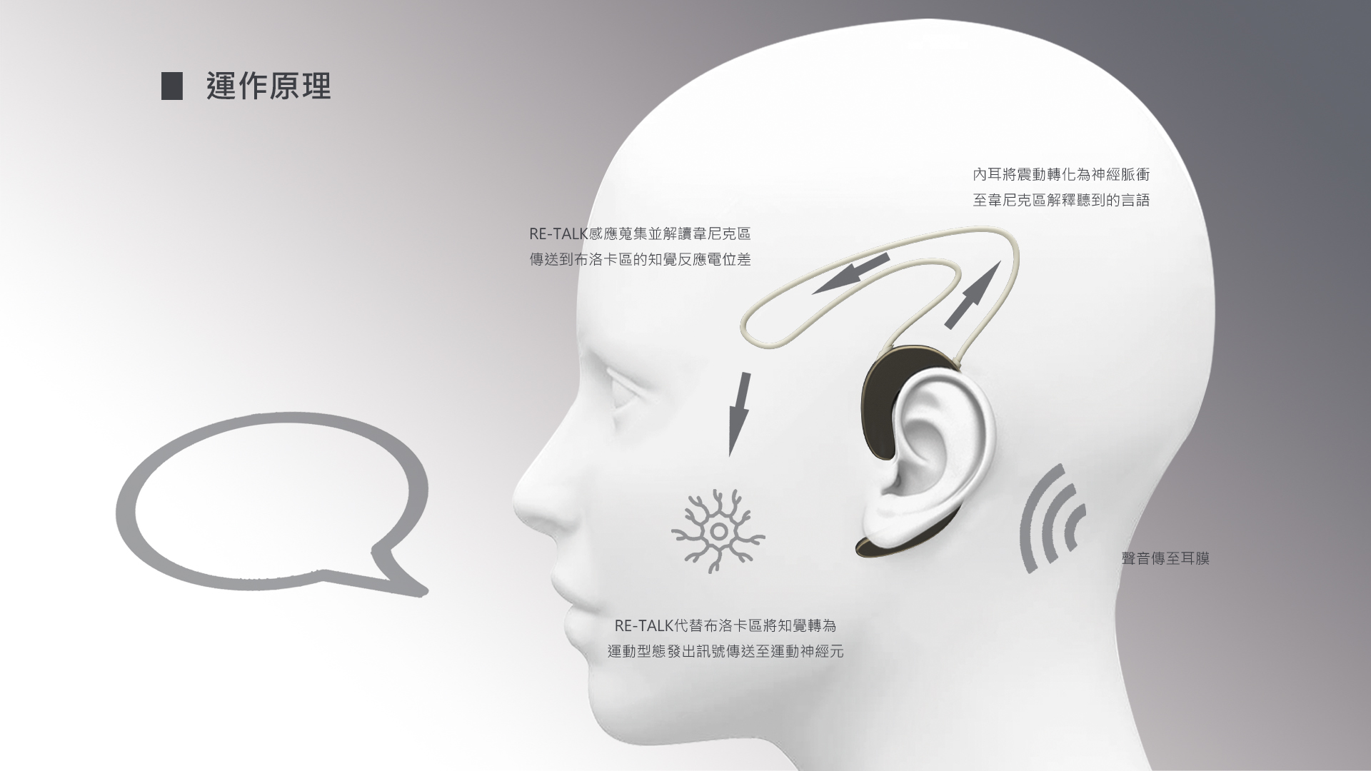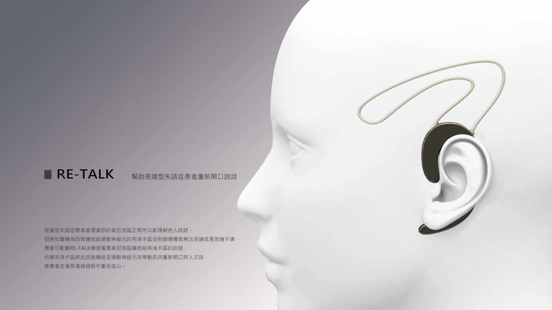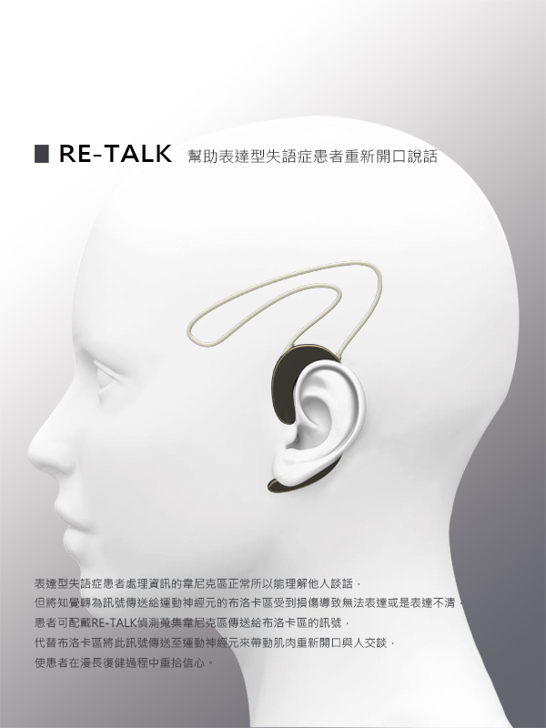 但將知覺轉為訊號傳送給運動神經元的布洛卡區受到損傷導致無法表達或是表達不清,這類的失語症可以透過復健來改善,但過程漫長時常造成患者灰心想放棄的心理反而日趨嚴重,患者可配戴RE-TALK偵測蒐集並解讀韋尼克區傳送給布洛卡區的訊號,代替布洛卡區將此知覺訊號轉化為運動型態傳送至運動神經元來帶動肌肉重新開口與人交談,使患者在漫長復健過程中重拾信心。