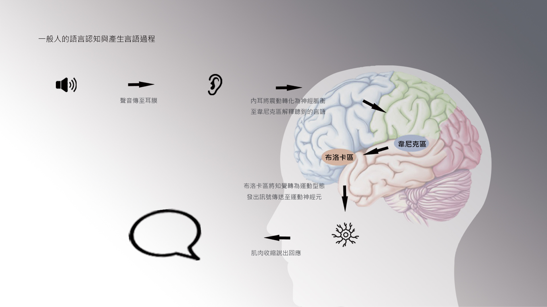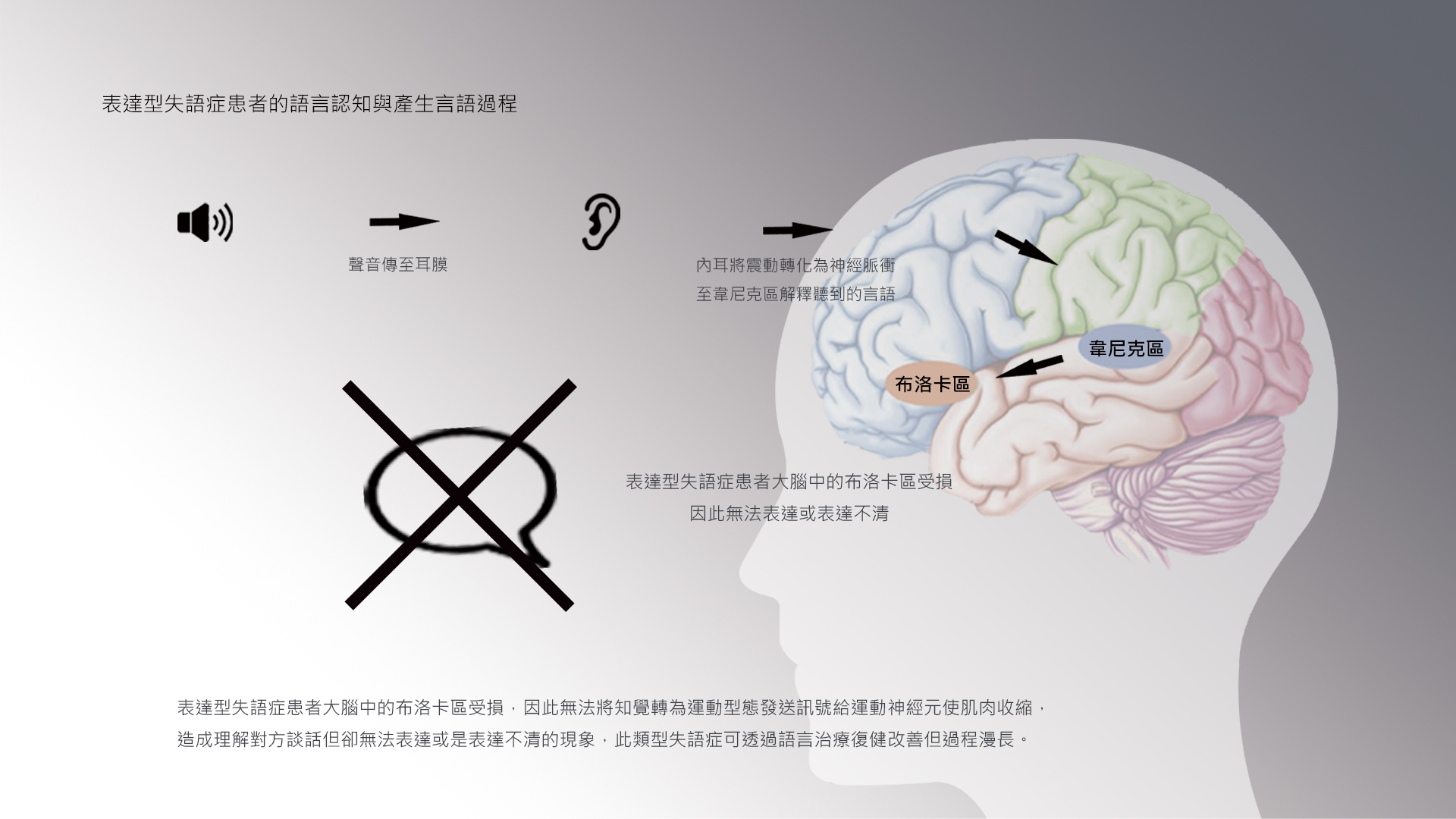 一般人語言認知與產生語言的過程為聲音傳遞至耳膜,內耳將震動轉化為神經脈衝至韋尼克區解釋聽到的語言,將解讀完的訊號傳送至布洛卡區,部落可驅將解讀完產生的知覺轉化為運動型態發出訊號傳送至運動神經元,肌肉收縮說出回應,但表達型失語症患者因布洛卡區受損無法完成後半部的過程所以會表達不清或是無法表達。