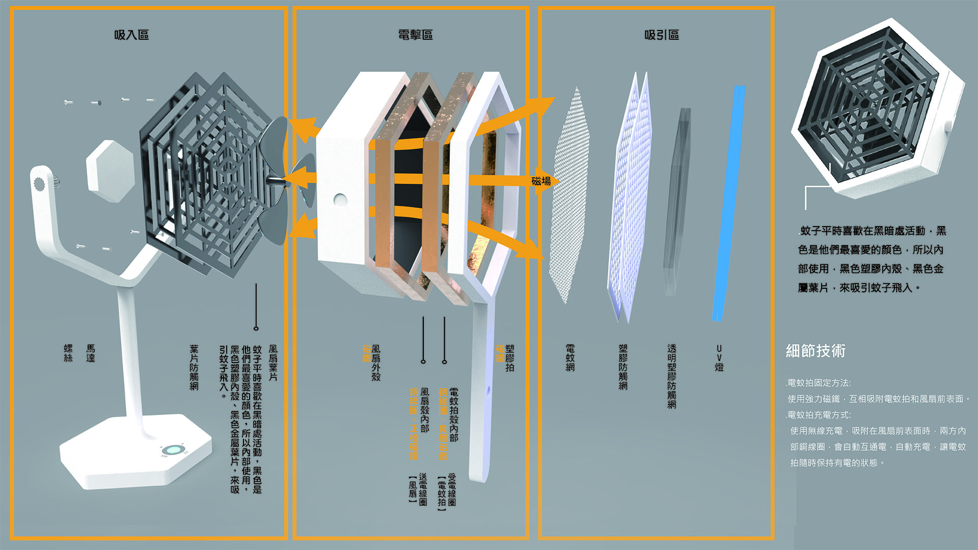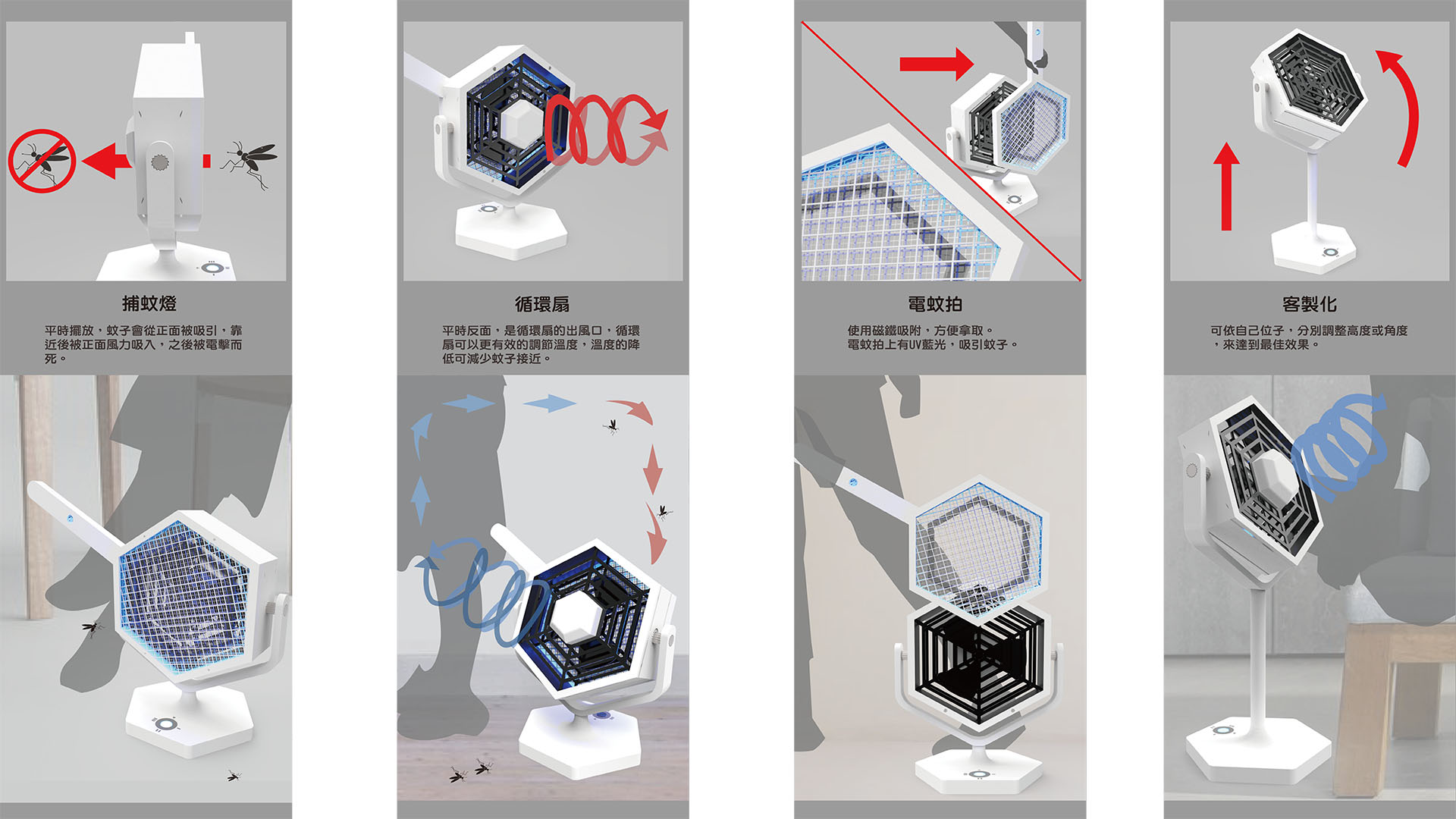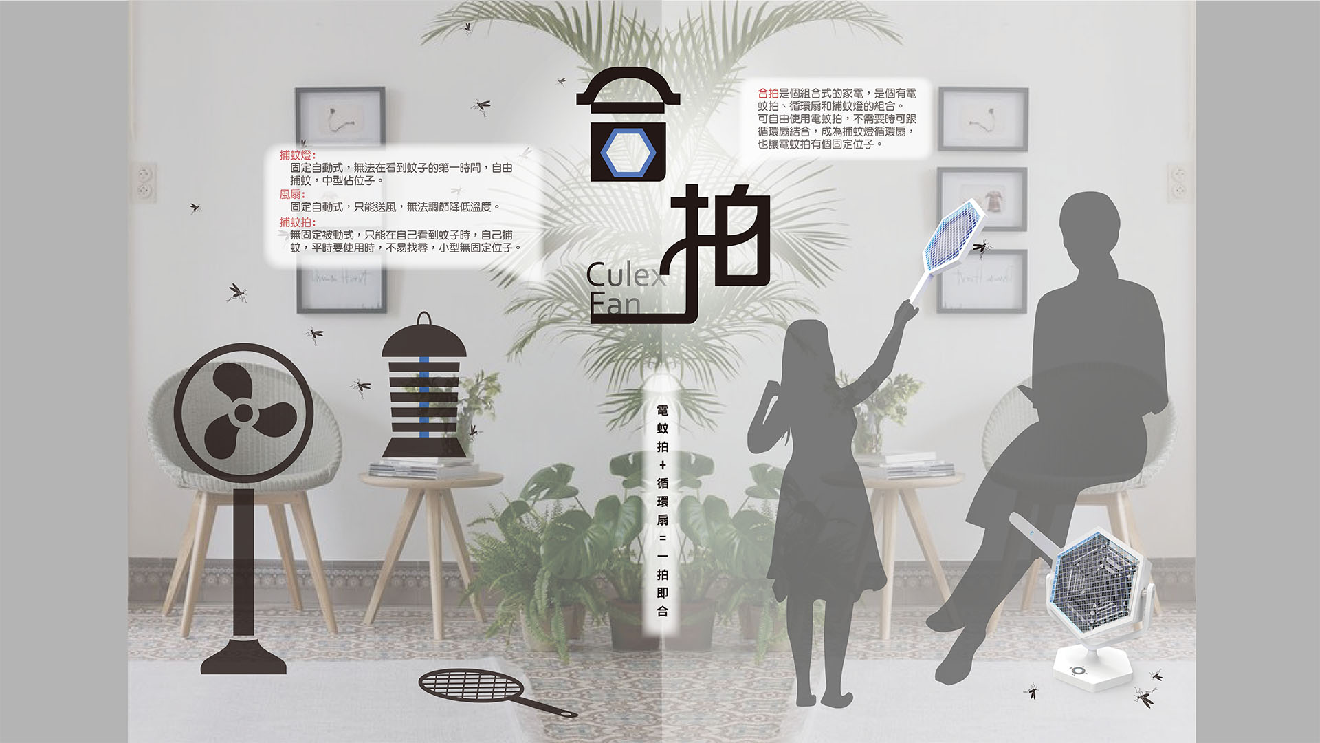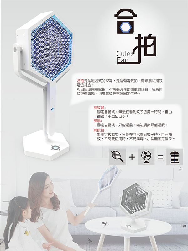 合拍是個組合式的家電,是個有電蚊拍、循環扇和捕蚊燈的組合。