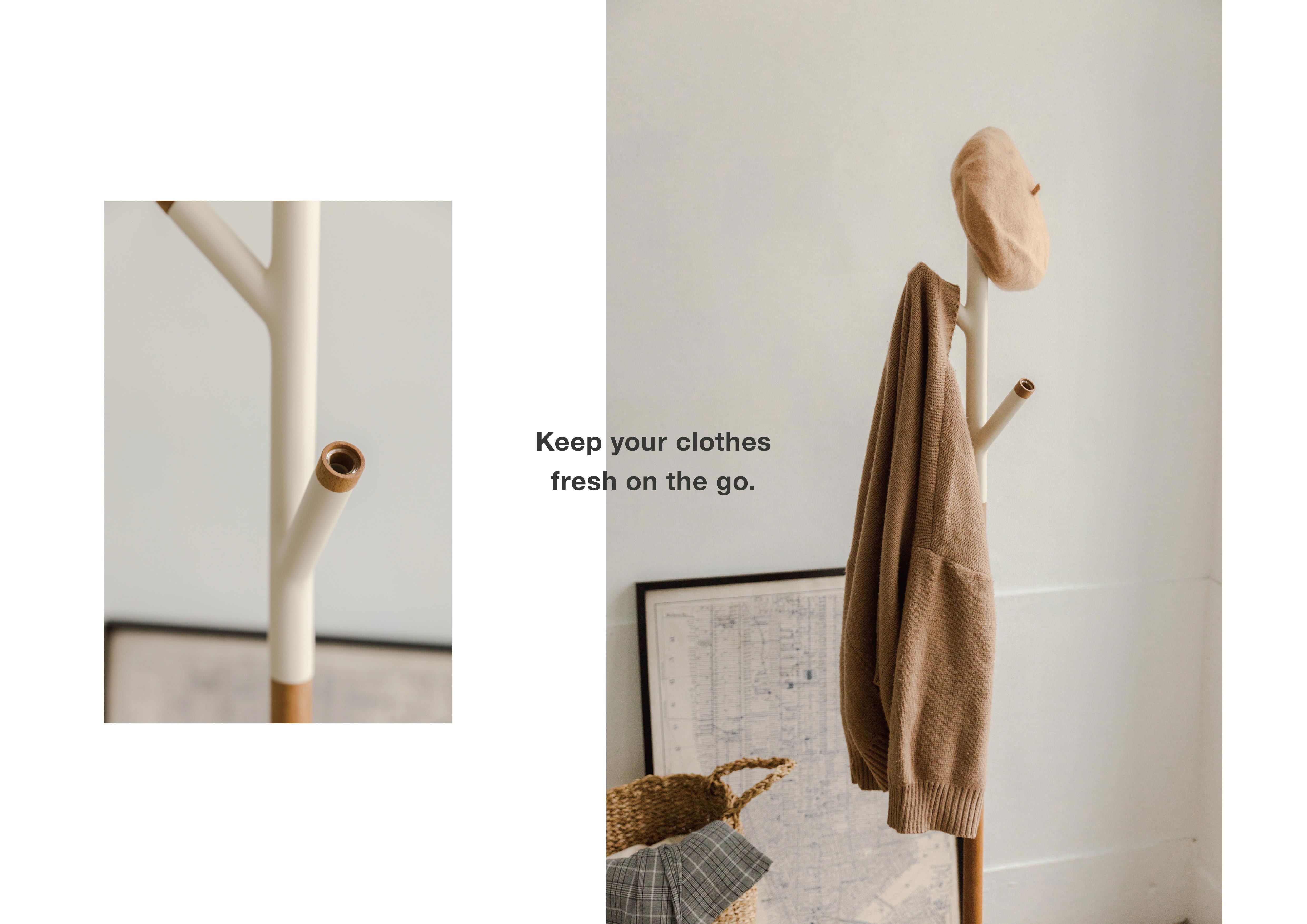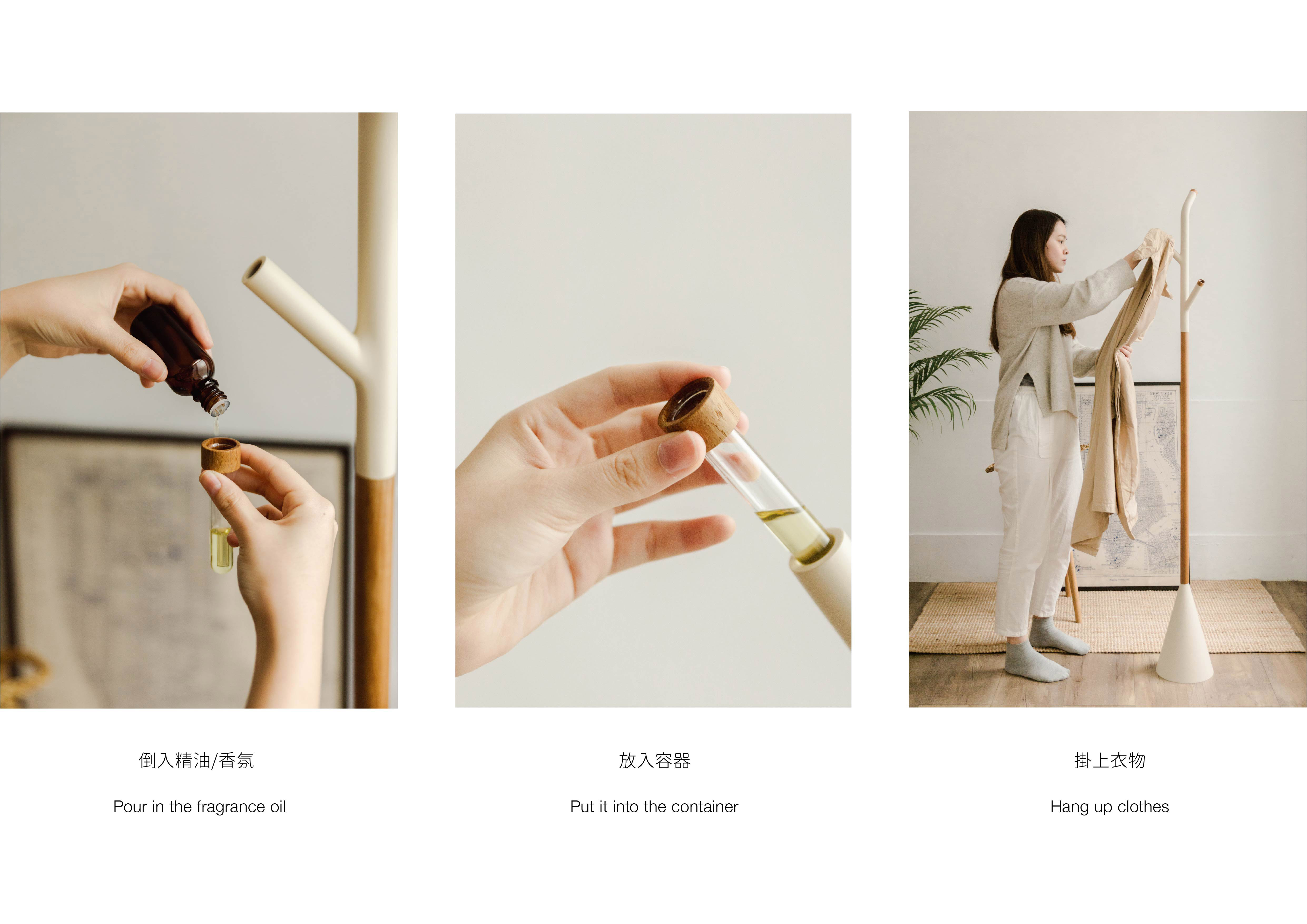 將香氛倒入分支末端的玻璃容器中, 在無意掛取的動作中即能透過衣領吸收自然揮發的香味, 讓喜愛的味道圍繞自身。