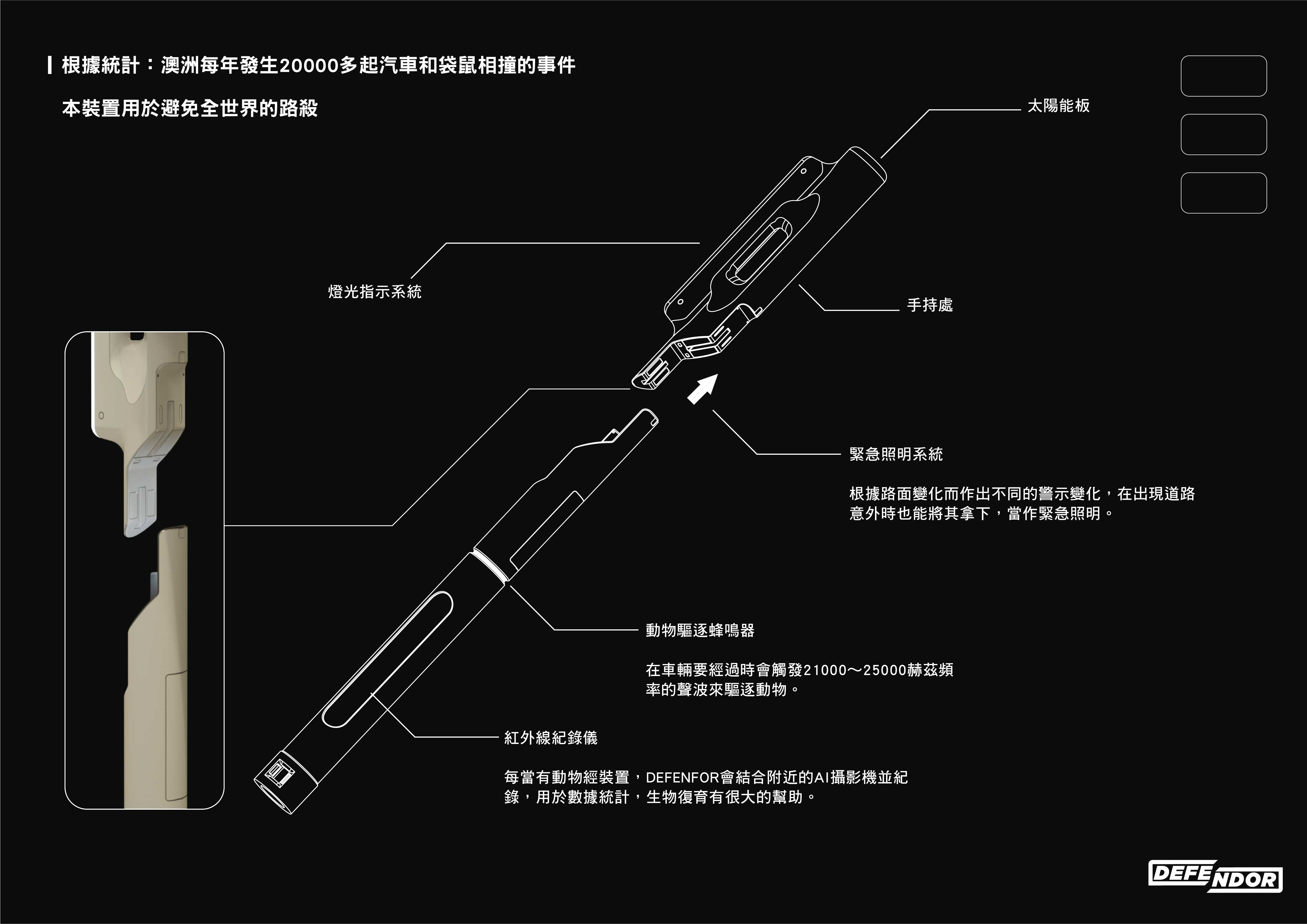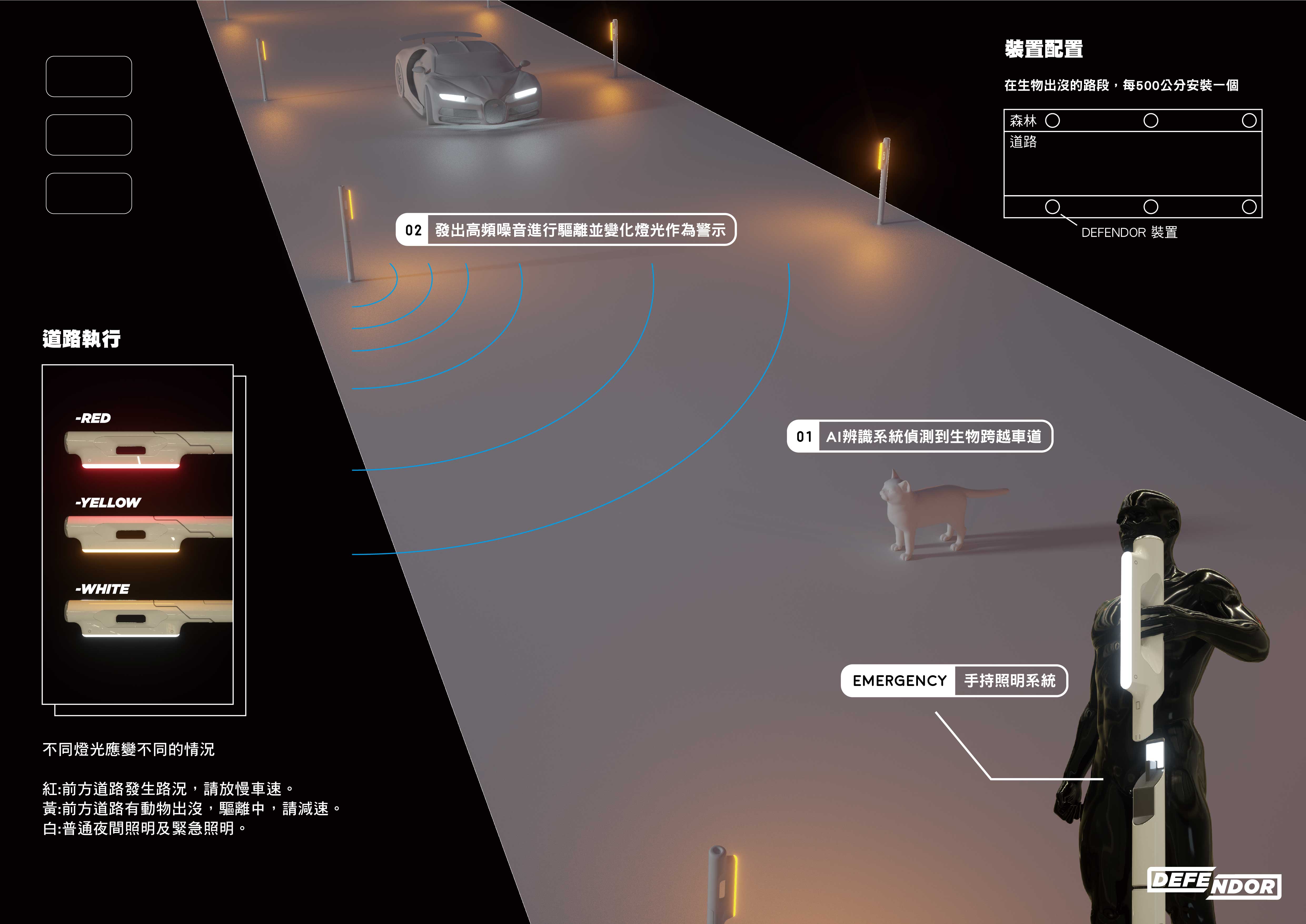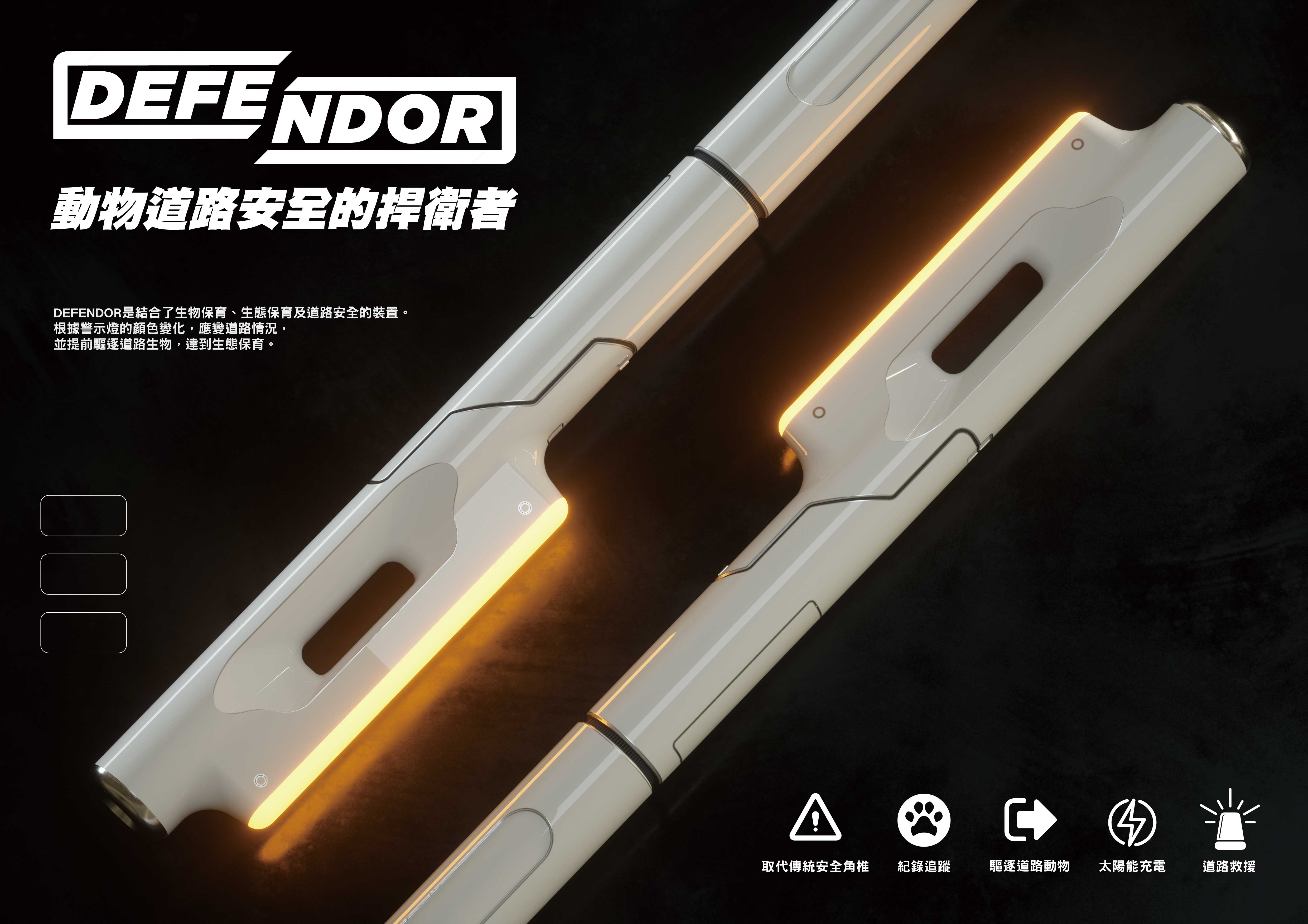 DEFENDOR是結合了生物保育、生態保育及道路安全的裝置。根據警示燈的顏色變化,應變道路情況,並提前驅逐道路生物,達到生態保育。