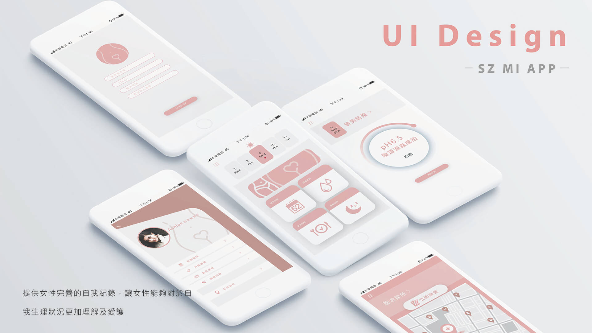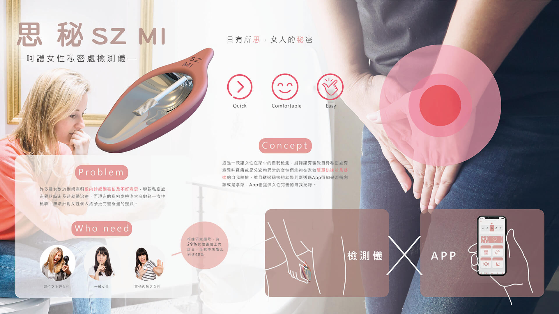 設計理念:許多婦女對於到婦產科做內診感到害怕及不好意思,導致私密處有異狀時未及時就醫治療,而現有的私密處檢測大多數為一次性檢驗,無法針對女性個人給予更完善舒適的照顧呵護。因此我希望有設計一款能夠讓有發覺自身私密處有意異味搔癢或是分泌物異常的女性們,可以在家做簡單快速並且舒適的自我篩檢,並且透過篩檢的結果判斷透過App得知是否需內診或是拿藥,App同時也提供女性完善的自我紀錄,讓女性能夠對於自我生理狀況更加理解及愛護。