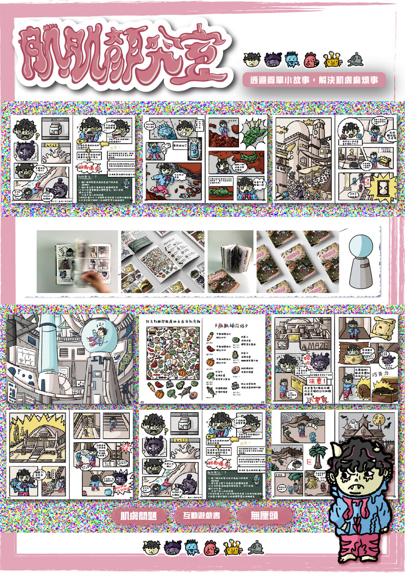青春期因賀爾蒙變化,促使皮脂腺分泌增多、毛孔角質栓塞,演變為粉刺堆積,最後變成痘痘,讓其成為青少年最常見的皮膚問題。部分人因用錯方法或未從日常習慣、飲食及問題根本解決,不但沒有得到改善,反而導致皮膚問題變本加厲,並出現自卑、社交障礙,逃避等問題。 「肌肌顏究室」以青少年常見的臉部肌膚問題為故事主軸,結合又醜又可愛的畫風,搭配無厘頭劇情繪製成趣味互動書,希望透過簡單有趣的小故事讓讀者找到膚事寶藏,在學習之餘,也能和主角一同展開逃脫研究室的冒險。 看見肌膚的改變是最美的冒險,從內而外綻放的自信,翻開書本和肌肌一起走向皮膚的新生吧!