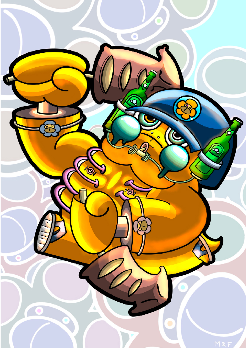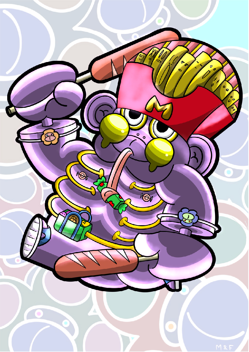 這次的設計是以桃園野生獼猴為主,野生獼猴分佈於海拔三千公尺以下,身體構造前肢比後肢短,各肢具有五趾。頭圓,臉扁,額裸出,。原本在山上過得好好的獼猴,因近幾年人類不斷往山上自然生態開發,開發經濟園區、觀光遊樂區等等,導致山上的獼猴生存空間變小,沒有食物吃,都移到觀光地區尋找食物,產生人類餵食風氣,大大減低了獼猴族群對人類的戒心,於是猴子就開始囂張,不給食物,就會用攻擊的方式,所以我畫三隻獼猴手上、腳上、頭上都是人類給予滿滿的食物,敘述出三隻獼猴不同階段,從和藹可親到凶神惡煞的階段,都是人類為勒自己滿足自己而導致的。在路上不管看到獼猴或其他原生物種,都不要亂餵食,以免導致不必要的傷害。的傷害。