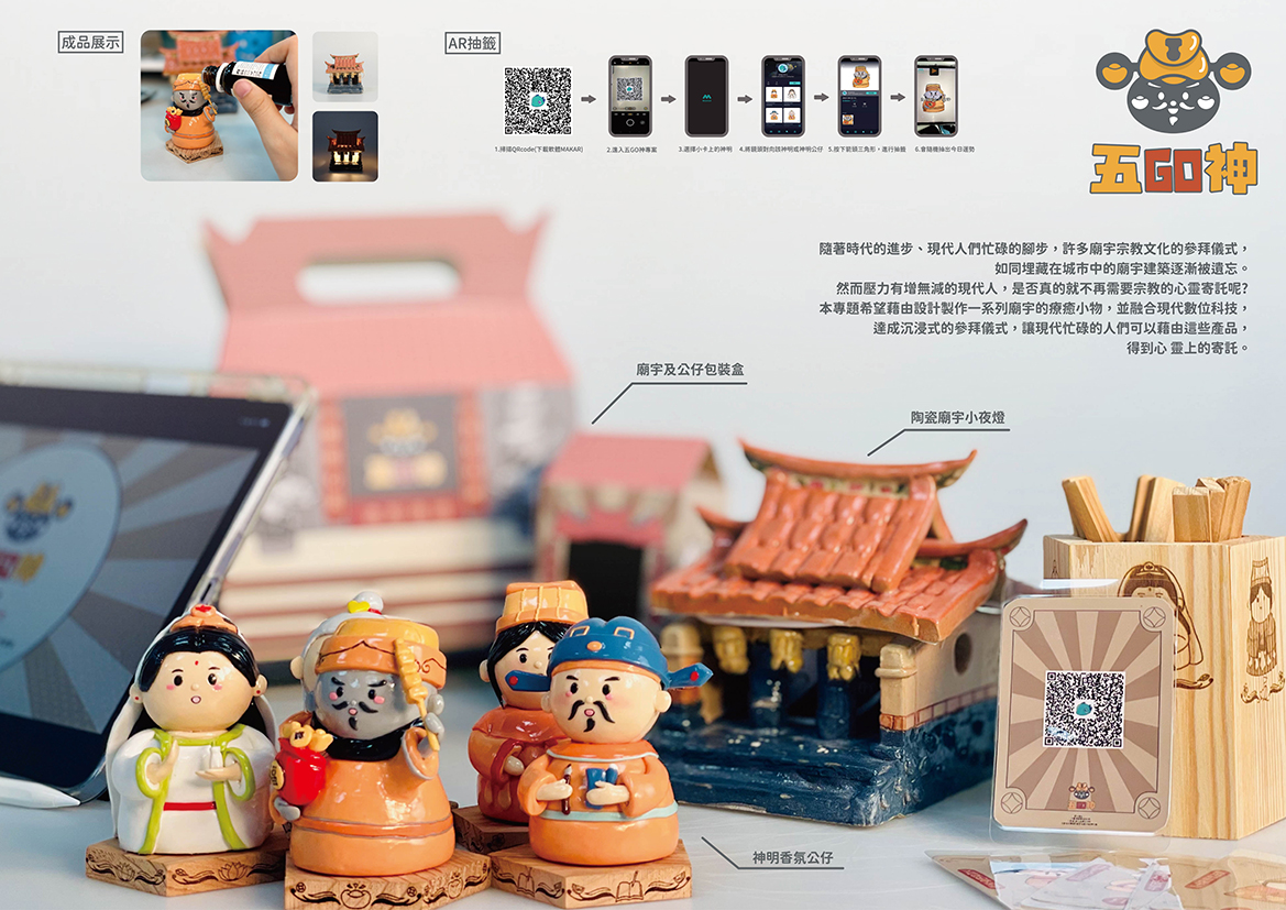 隨著時代的進步、現代人們忙碌的腳步,許多廟宇宗教文化的參拜儀式, 如同埋藏在城市中的廟宇建築逐漸被遺忘。 然而壓力有增無減的現代人,是否真的就不再需要宗教的心靈寄託呢? 專題希望藉由設計製作一系列廟宇的療癒小物,並融合現代數1 達成沉浸式的參拜儀式,讓現代忙碌的人們可以藉由這些產品,得到心 靈上的寄託。
