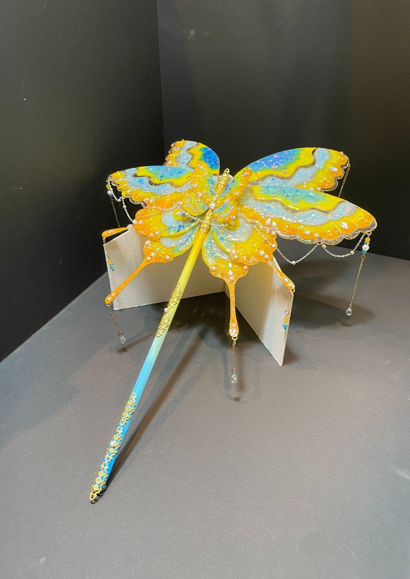 以古代掐絲琺瑯工法製作,盛夏代表色為藍色與 ,增添華麗感黃色系,顏色搭配使人有熱情活潑 的印象,整體的造型以蝴蝶為主,參考自琉璃翠 鳳蝶,輪廓採用「圓弧線條」,在蝶翼的地方更 加強圓弧的彎曲,讓人聯想到「海浪的波浪」, 裝飾部分,貼鑽選用與夏天有關的元素:水滴代表 清涼的海水,星星則象徵海星,流蘇使用水滴、 珍珠和與主體相呼應的串珠,扇柄上覆蓋金色雕花片,增添華麗感。蝴蝶象徵自由,盛夏呈現活潑色彩,期許自身性格能變得像這把蝴蝶扇象徵的意義一樣,自由奔放且不受拘束。