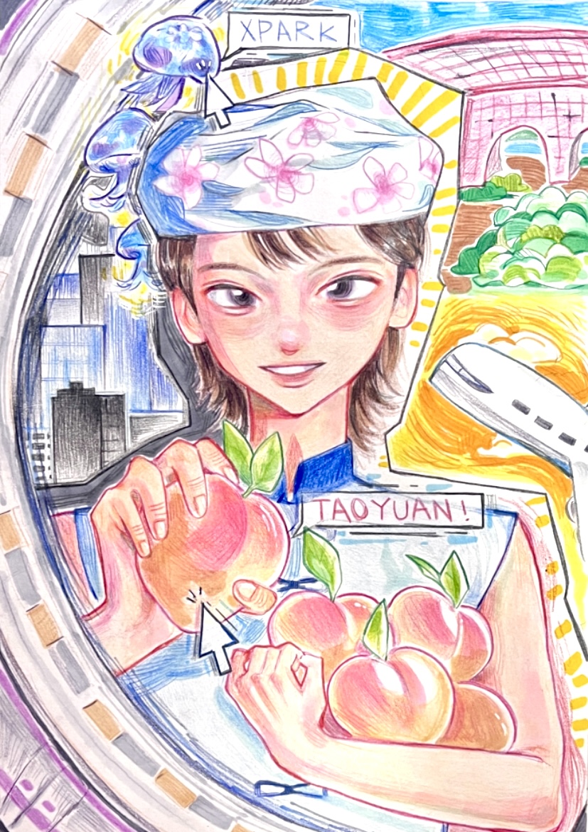 人物以穿著客家傳統服飾代表著對多元民族的包容和文化融入,而手持的水蜜桃正是桃園的一大水果產物,接著是左側的機捷和城市正代表桃園的科技發展迅速,其餘則是桃園的在地特色與景色:桃機、大平紅橋等等 以滑鼠箭頭加以解釋 讓畫面更生動!