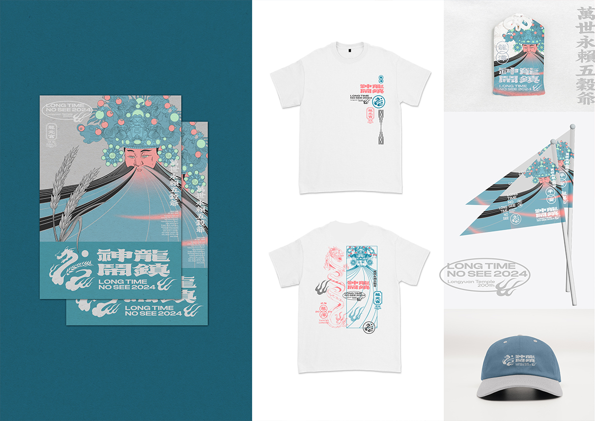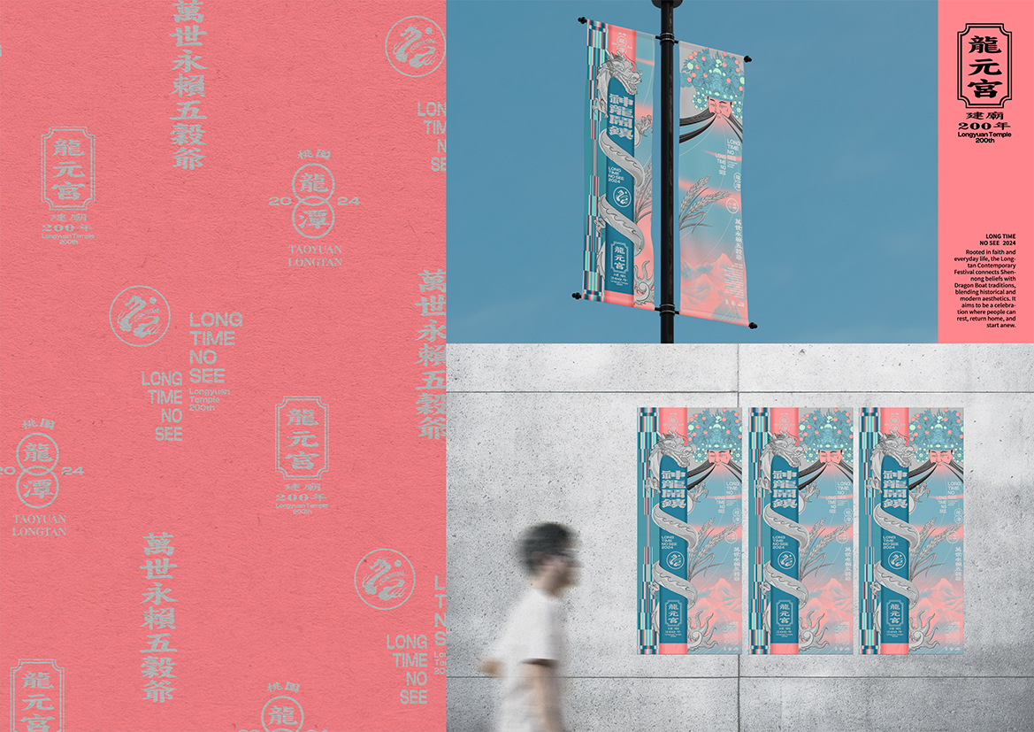 神龍鬧鎮,桃園龍潭的當代地方慶典X龍元宮200週年,嘗試串接神農信仰與端午⺠俗,結合歷史傳統與當代美學,同時邀請國際藝文交流、發展地方文化。 「創造一個外地人想參與的慶典,讓年輕人期待的家鄉活動」是這次視覺的核心,設計運用了經過調和的配色,打破傳統紅色與綠色的框架,使用漸層色塊的組合來象徵廟宇200年來的記憶,將過去與現在緊密相連,象徵著每位生活在龍潭的鄉親的凝聚與文化傳承。 神農大帝保佑了,天、地、山、水及生活中的大小事物,祂那長長的鬍子象徵著對萬物的包容與庇佑,完美呼應了「萬事永賴五穀爺」的精神。
