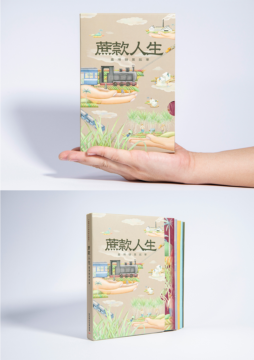 「蔗款人生-台灣糖業故事」是涵蓋五本小冊的書冊,集結了五位作家、策展人與漫畫家的作品。書殼插畫以五本小冊的主題內容發展成插畫元素,構築成書殼封面,且規劃成得以個別獨立成各小冊封面,讓書殼與小冊具連貫性。 封面終以糖鐵車廂造型為基礎,從依序的畫家畫糖廠、糖鐵客運車廂、四果冰、糖廠煙囪各自分佈於書殼上。而畫面中人物的安排由最下方與高大的蔗田形成對比的農人,由小至大到最上方畫家的前景身影,作為人物的差異。 插畫原稿整體色系與背景以畫家西鄉孤月的《台灣風景》與林玉山的《蔗作改良海報》兩幅主題為台灣糖廠的作品為參考範本,清雅恬淡的色系很適合呈現出早年台灣糖廠意象。