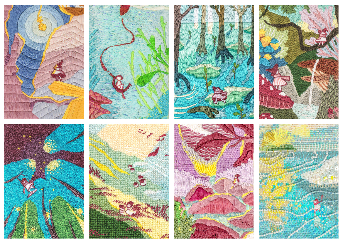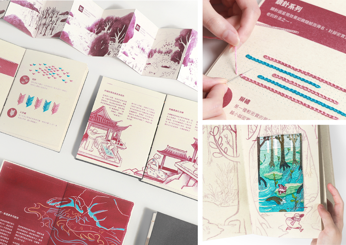 通過訪問不同世代的刺繡產業,傳統刺繡工藝轉換成創新手法,重新定義刺繡的圖像表現。將自然環境與人類成長相結合,將不同環境對應到不同的人生階段,表現出在各個環境中探索、創造、闖蕩、堅韌、體悟的心境變化。 書籍使用手工孔版印刷、手工穿線裝訂,再搭配上實體的手工針法介紹與融合各針法的刺繡圖,有別於以往相同領域的書刊,只有平面圖像跟文字介紹,除了滿足觀者視覺與觸覺的享受,更希望傳達在一針一線的過程中所蘊含的手感溫度。