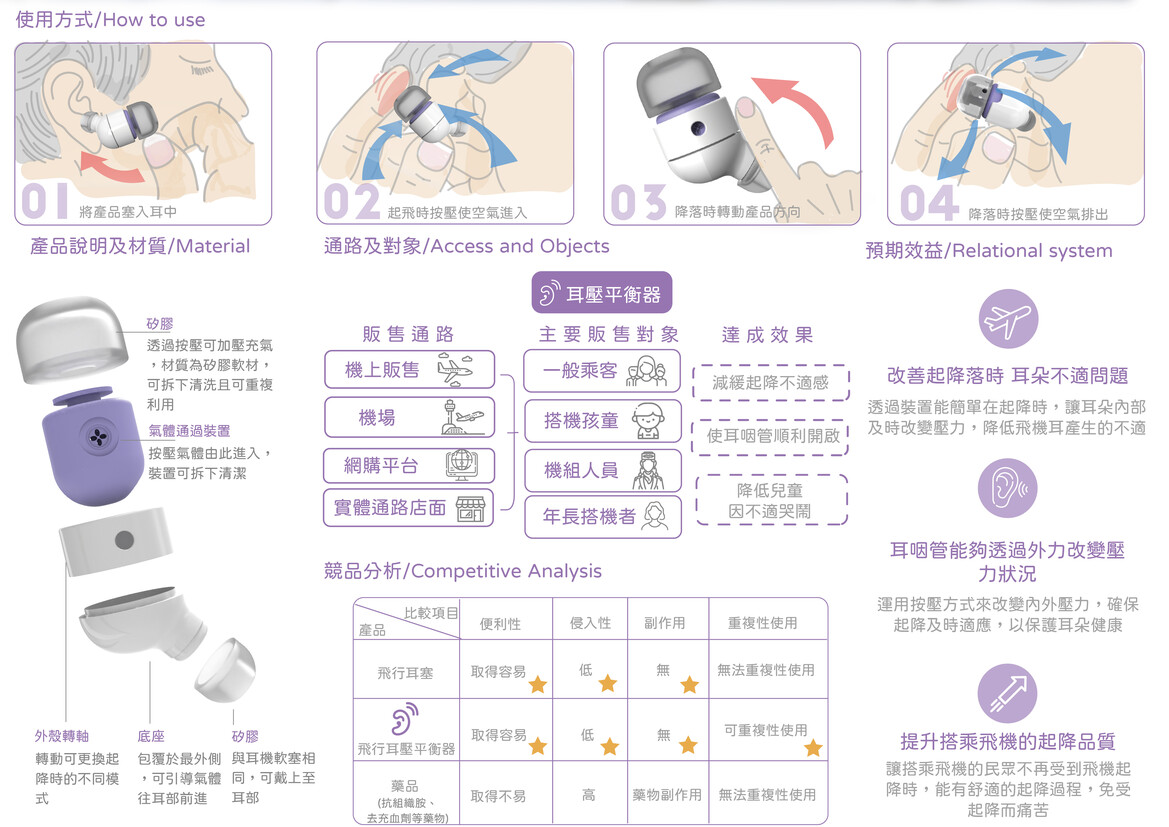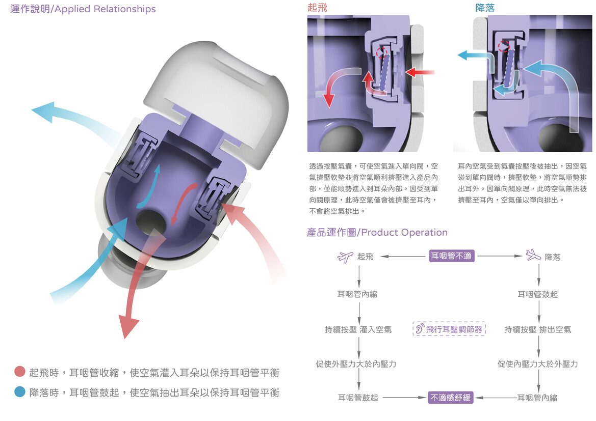 EFPB是一款飛機起降時能調節耳咽管壓力的產品,無須電力即可使用。雙手分別按壓雙耳上的產品,可在飛機起降時平衡耳咽管內的壓力。起飛時按壓裝置能將空氣打入耳朵,使耳咽管漲起,讓耳外壓力大於耳內壓力。降落時按壓裝置能將空氣抽離耳咽管,使耳咽管收縮,讓耳內壓力大於耳外壓力。使用EFPB以確保耳咽管能順利朝正確方向開啟或收縮,並保持耳咽管內適當壓力值,以此減緩飛機起降所造成耳咽管不適問題。產品可重複使用,操作直覺且不影響飛行過程,更能提升顧客飛行品質。
