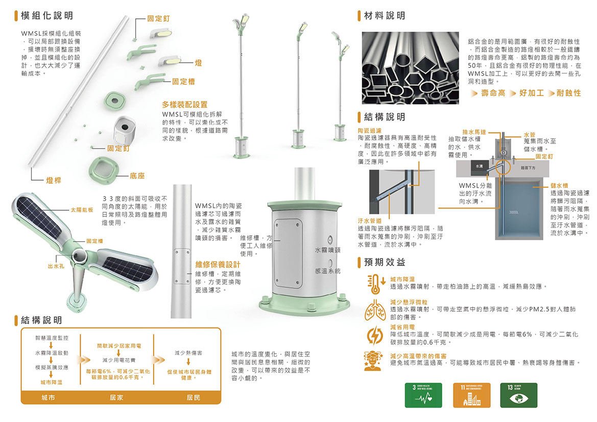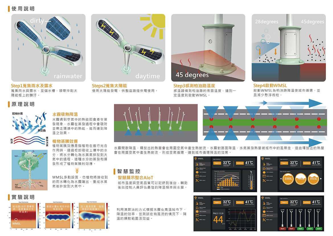 WMSL是一款減緩熱島效應的水霧路燈,柏油路吸熱高溫是產生熱島效應的原因之一,高溫的城市會對人體造成中暑、熱衰竭等熱傷害,WMSL可蒐集雨水及露水並過濾儲存至儲水槽,透過感溫器感測城市溫度,當溫度過高時自動啟動WMSL進行水霧噴灑降溫,水霧冷卻地面後,風將蒸發的水氣帶走,達到城市循環降溫的效果。