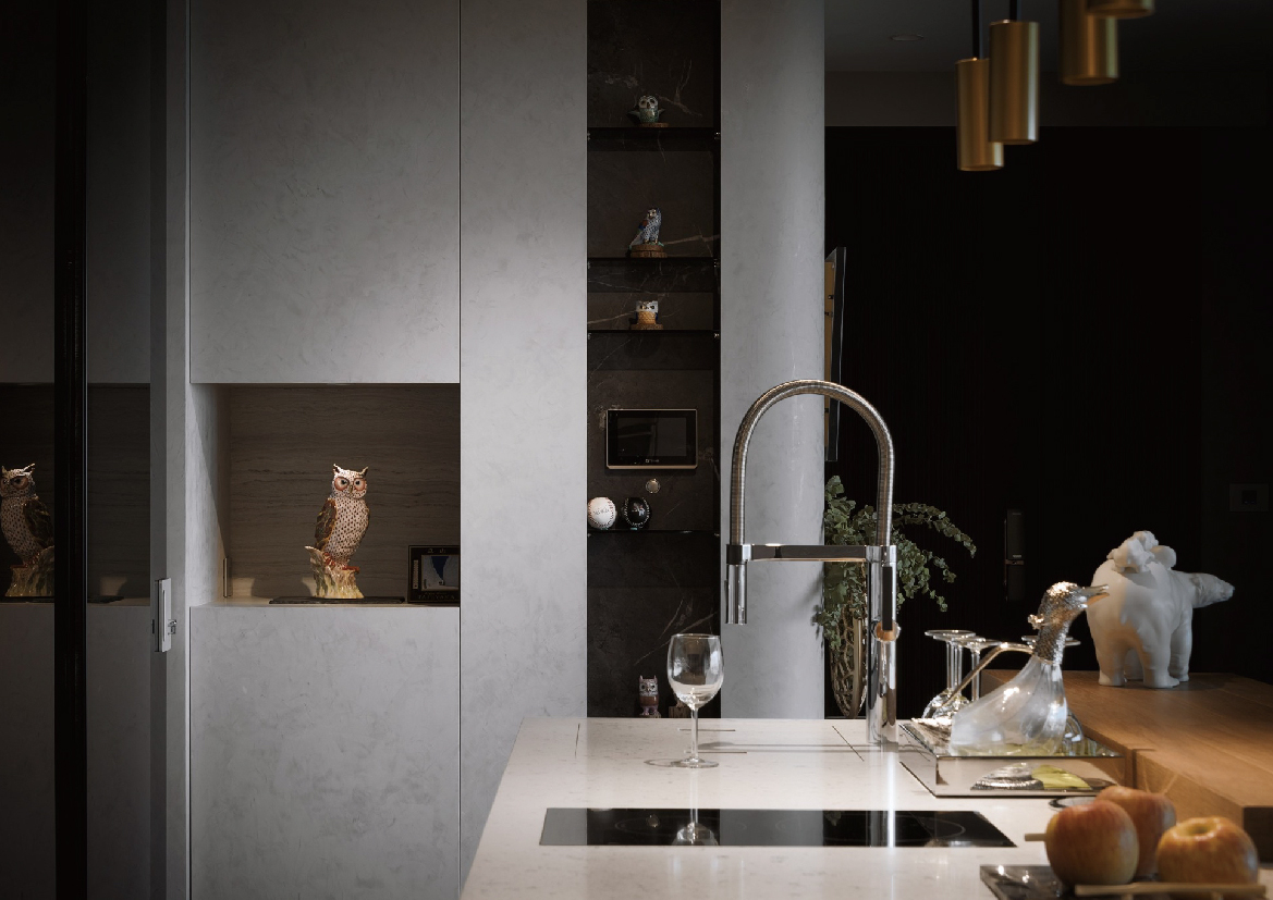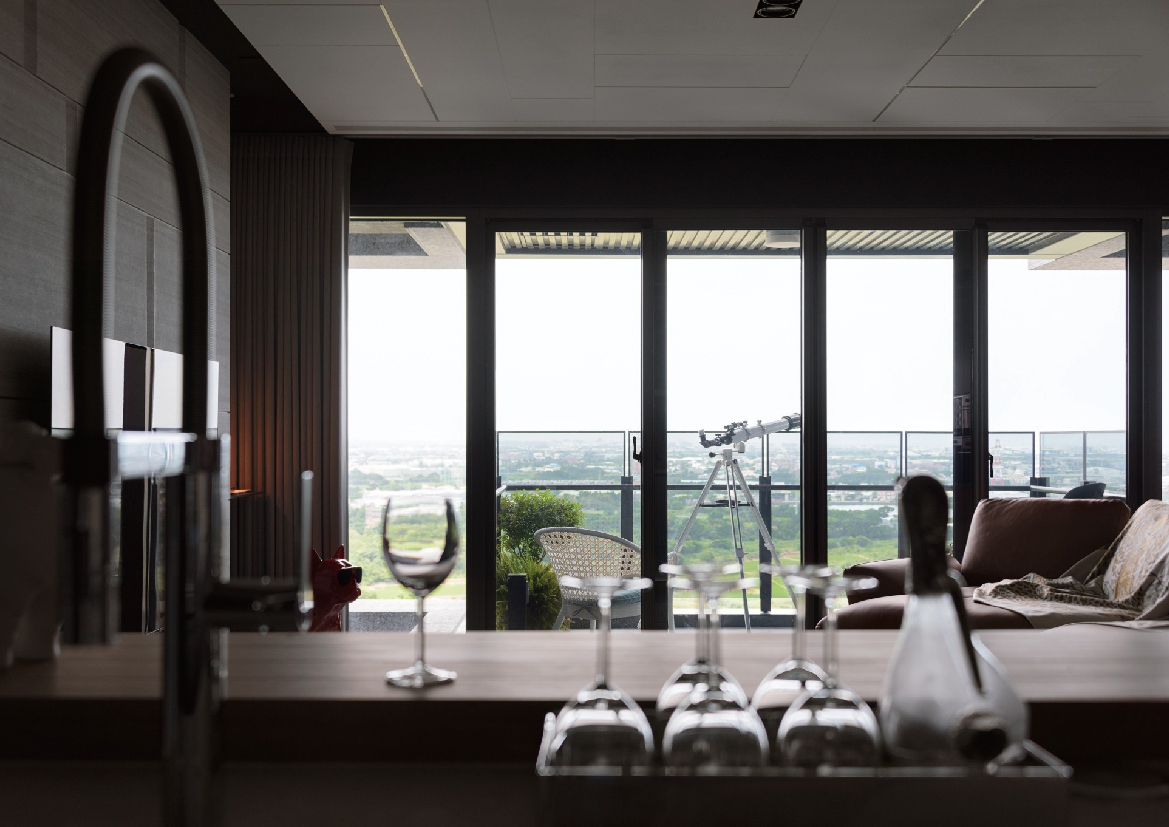 以時間釀造的溫柔,擁抱材質碰撞的花火。 本案地處於河岸第一排,視野遙遠且無遮蔽,時而天際間偶見客機起飛降落。天氣若好時還可望向海天一線間,如同孤高的遙望台,環顧著四周景色。坐擁絕佳的河岸公園及自然人文交錯的美好景致,如何借用窗外之景成就室內空間美好? 公領域以大面積落地窗為開口,將室外美景變成獨一無二的精品畫作融合於空間中。不同於剛硬的櫃體輪廓,利用柔和的圓弧線條將電視牆延伸至玄關降低視覺銳利感。 中島區的原木木紋、地面的潑墨石材磁磚、電視牆的清水模質感、走廊端景的仿古面石材紋理等,以不同材質的碰撞呼應各空間的劃分。