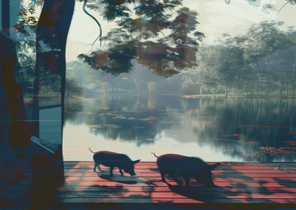作品「晨曦中的山豬湖」以山豬湖生態親水園區為背景,透過繪畫清晨時分山豬在湖邊覓食的場景,展示了自然與野生動物的和諧共生。這件藝術品不僅是對自然美景的讚美,更是對生態保育的呼籲,希望喚起觀賞者對自然環境的關懷與重視