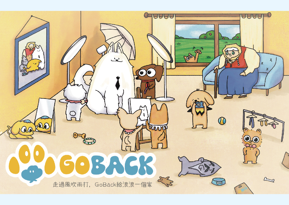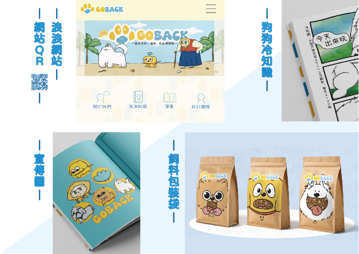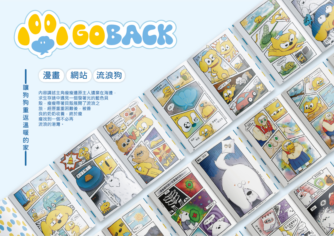 《Go Back》是以『領養代替購買』為主題的視覺設計,透過「漫畫式繪本」與「網站」為主要載體,結合短影片、小遊戲、包裝設計延伸應用,傳遞流浪狗應被重視與接納的訊息。 色彩計畫以黃與藍為主色系,貼近狗狗可辨識的視覺範圍,同時營造溫暖與信任的氛圍。而名稱「Go Back」結合**狗(Go)與貝殼(Back)**的諧音意象,貝殼象徵「朝聖之路」中的引導與希望,寓意每隻狗狗都值得一段回家的旅程。 《Go Back》以漫畫故事傳遞情感、網站提供狗狗照護與收養延伸資訊,透過多元視覺設計為媒介,期能喚起共鳴、引發思考,並推動更多人投入領養行動。 |