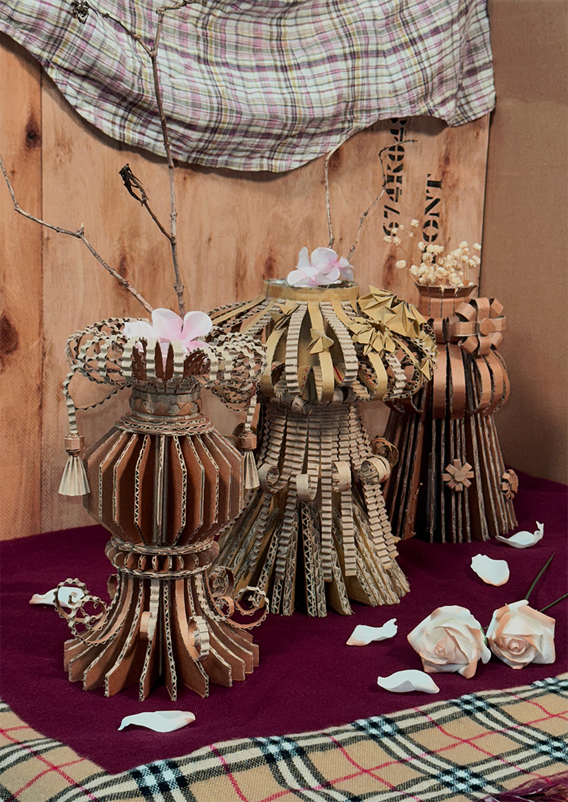 我們利用這兩種類型的瓦楞紙和編織/堆疊/放射等技法來去製作花器,花器的造型各具特色、形式多變,而我們選擇偏向東方古典美學的容器,因此造型較為典雅,枯枝的造型設計上採用純粹的曲線線條,符合禪中意象的插花表現。