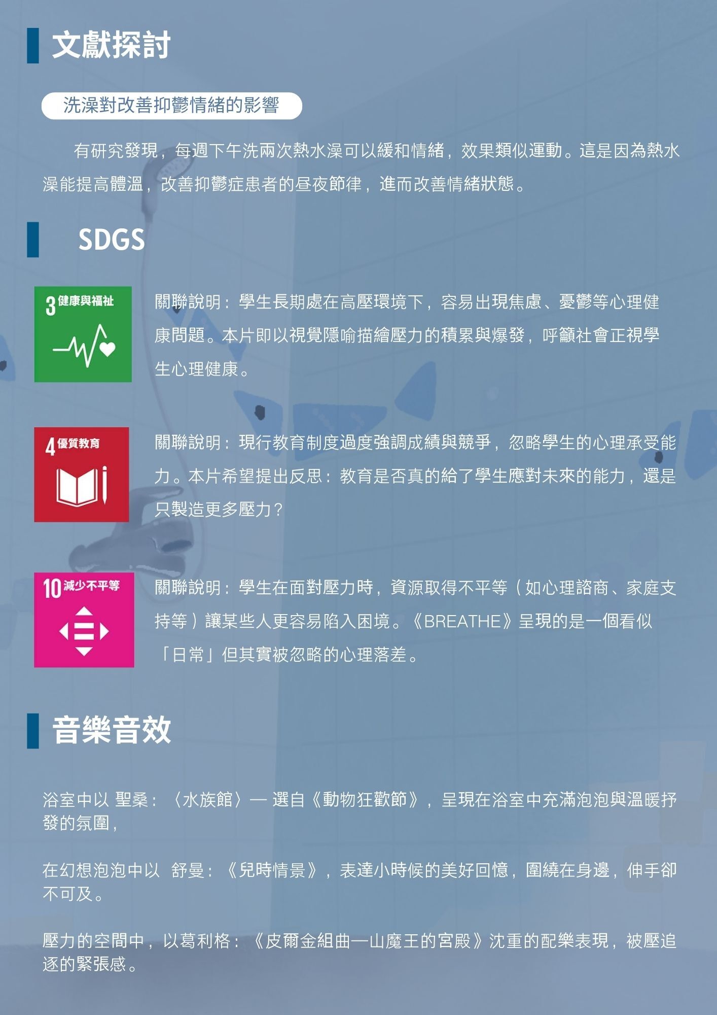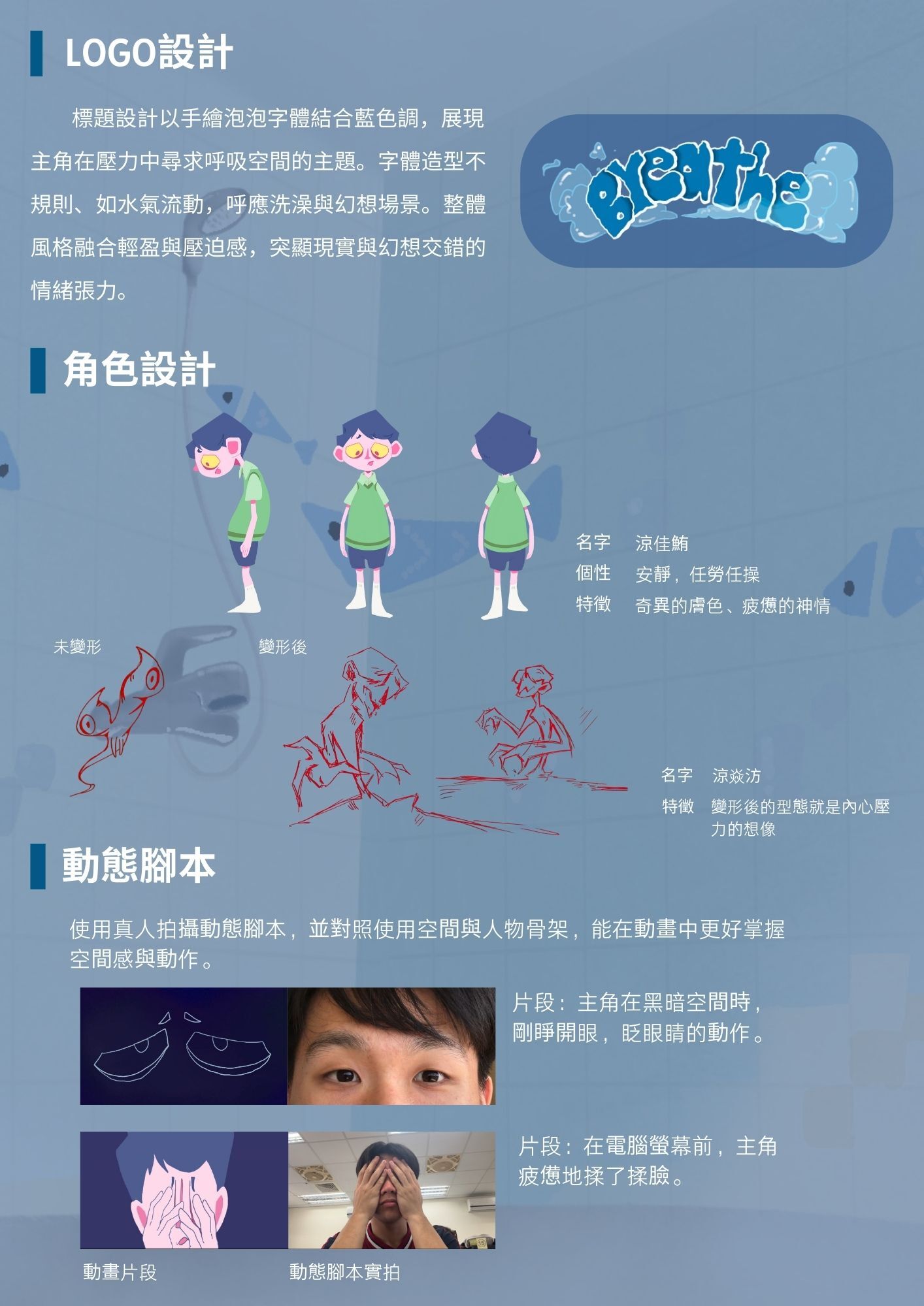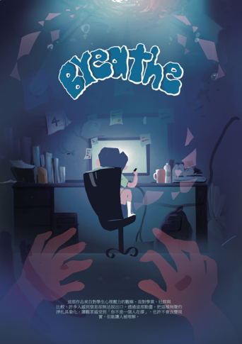 《Breathe》透過現實與幻想交錯的敘事,描繪學生在壓力下的心理掙扎。泡泡象徵童年的純真與短暫安慰,海洋與黑暗空間則代表焦慮與低潮。壓力怪是情緒的具象化,整體視覺設計強調情緒起伏與內心衝突,呈現「喘不過氣」的狀態。