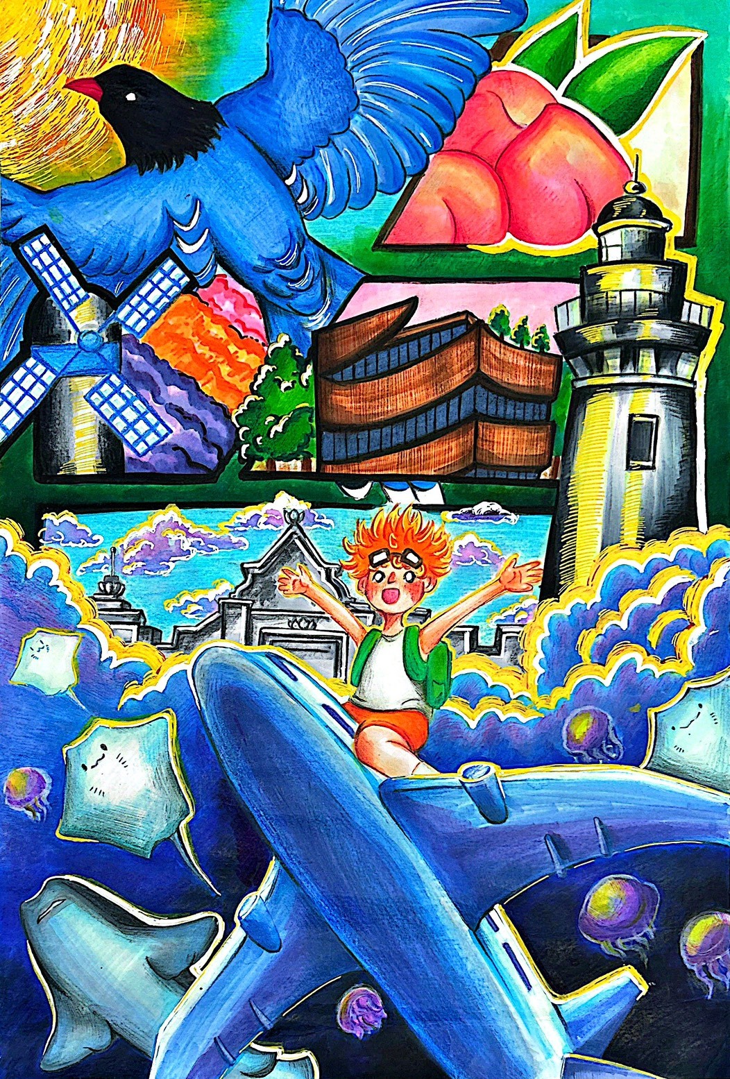 我一直覺得旅行不是離開,而是重新看熟悉的地方。桃園對我來說就是這樣——看似日常,卻處處有驚喜。這幅作品就像一本旅行日記,我把記得的、幻想的都放進來,讓飛機成為一個「出發」的符號,帶著我在這座城市裡亂跑。藍鵲、燈塔、鯨鯊,它們不是單純的地標,而是我和桃園之間留下的線索。最後拼起來的不只是一張畫,而是一種和城市相處的方式。